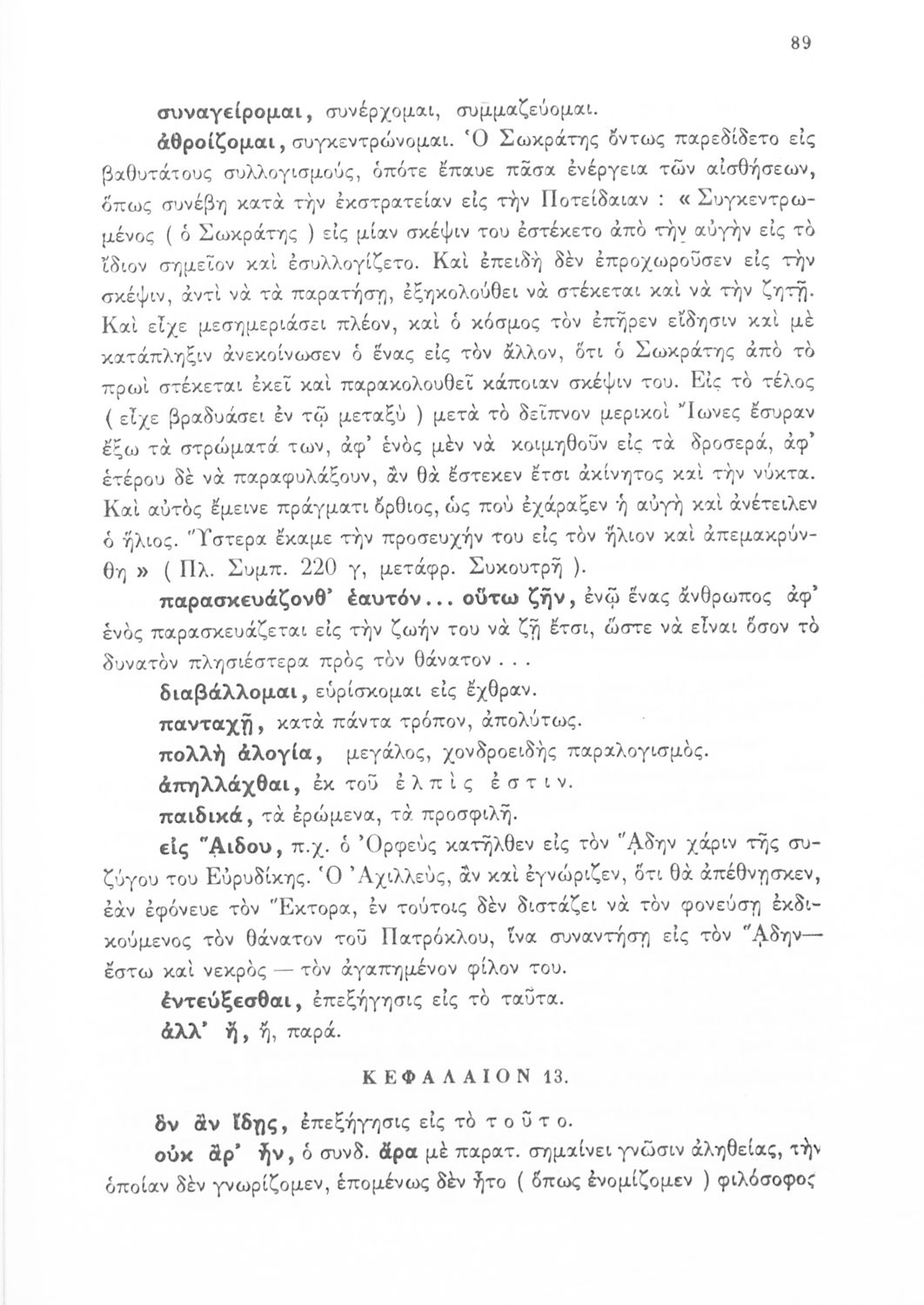 Σχολικό εγχειρίδιο Αρχαίων Ελληνικών ΣΤ΄ Εξαταξίου Γυμνασίου που περιλαμβάνει εισαγωγικό κείμενο για τη διδασκαλία του Σωκράτη και περίληψη του έργου, τα κεφάλαια Β΄ έως ΚΕ΄ και περιλήψεις των κεφαλαίων 26 έως