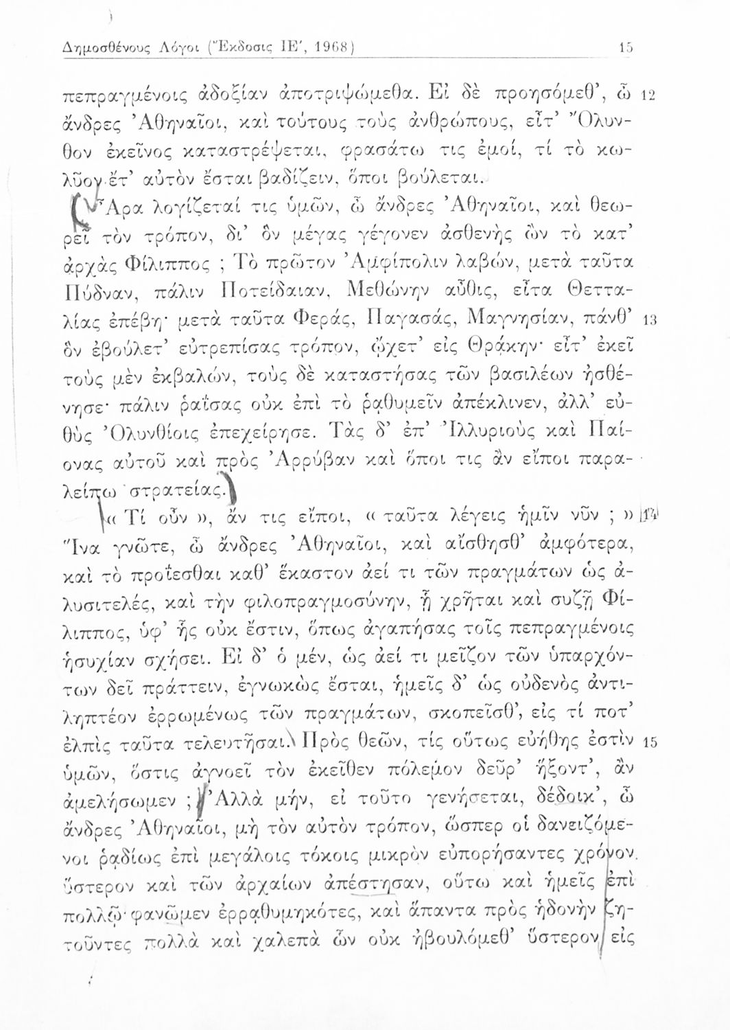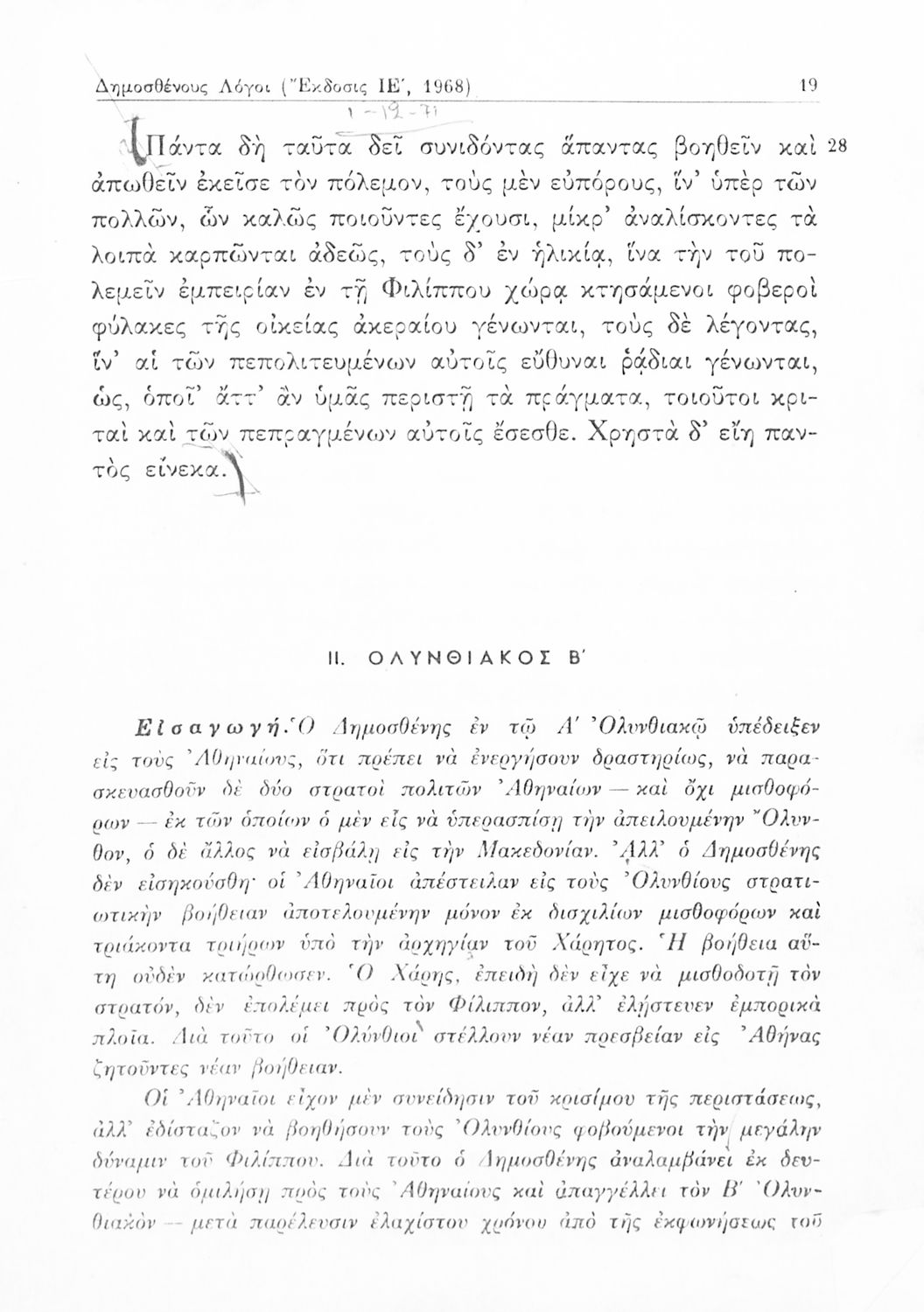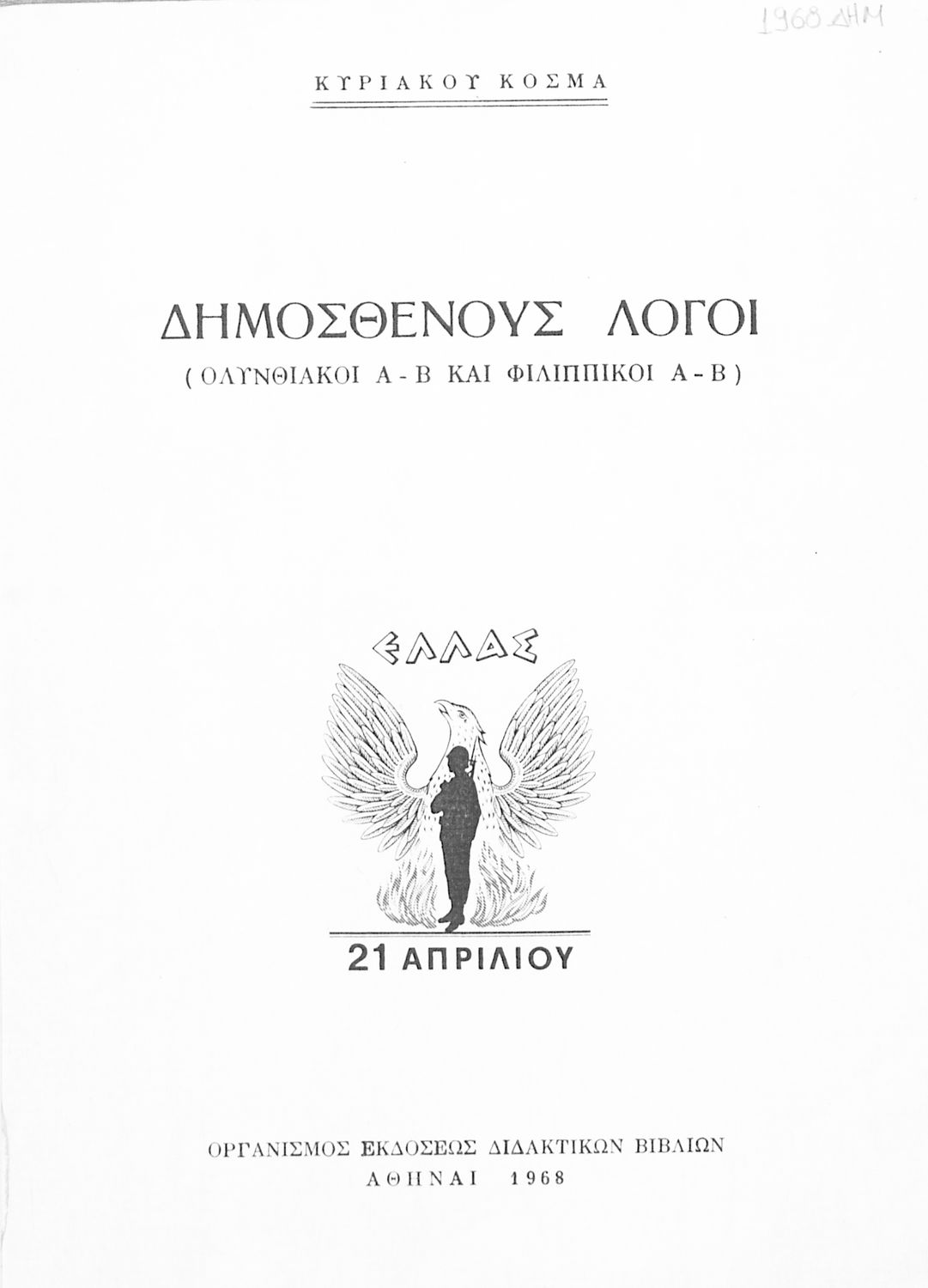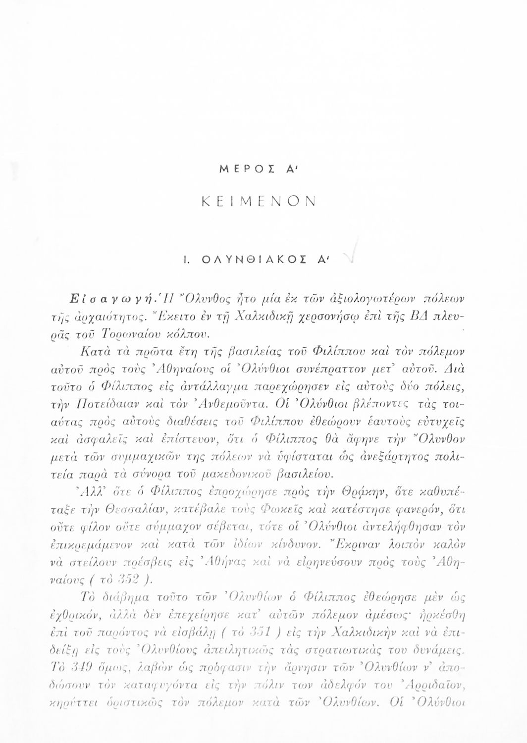 Σχολικό εγχειρίδιο Αρχαίων Ελληνικών Γυμνασίου που περιλαμβάνει τους Ολυνθιακούς Α΄ και Β΄ και τους Φιλιππικούς Α΄ και Β' του Δημοσθένη, εισαγωγή και ερμηνευτικά σχόλια.