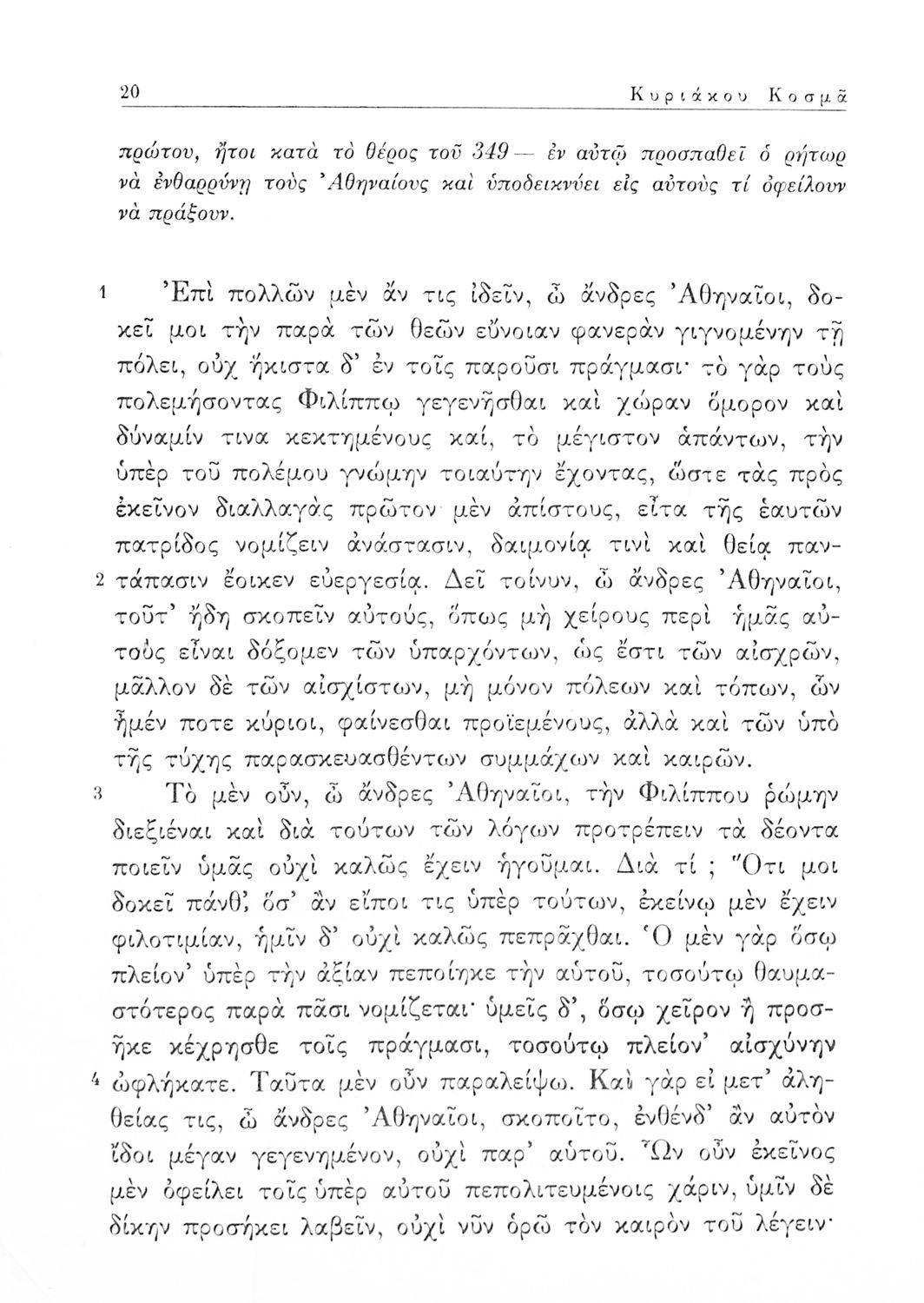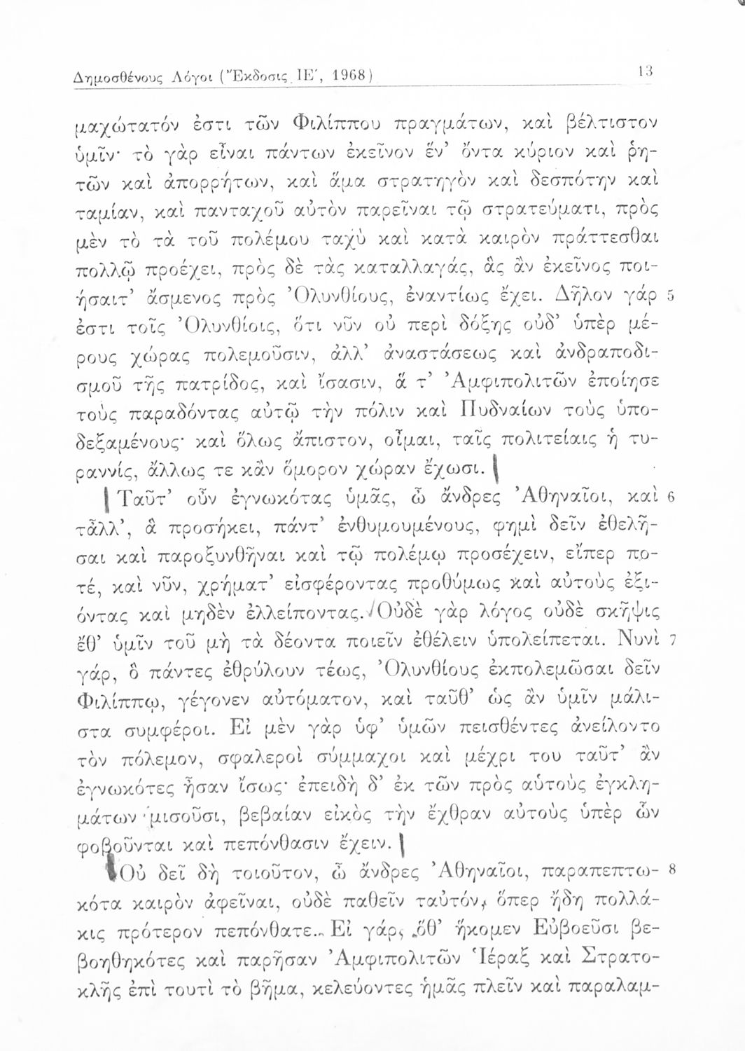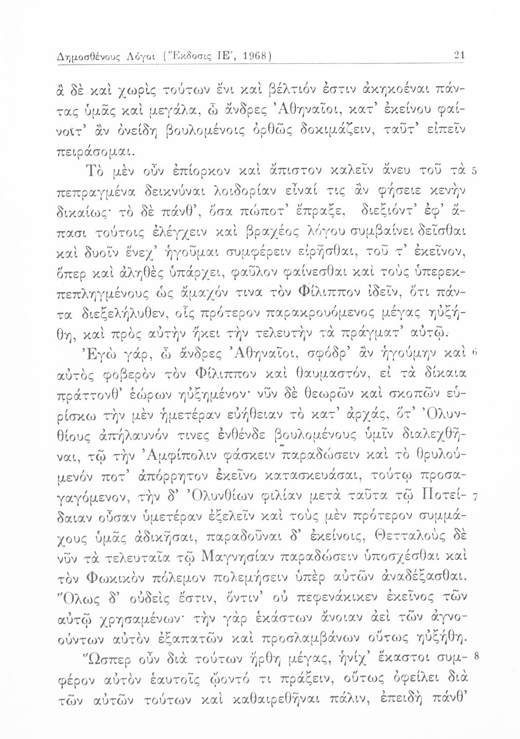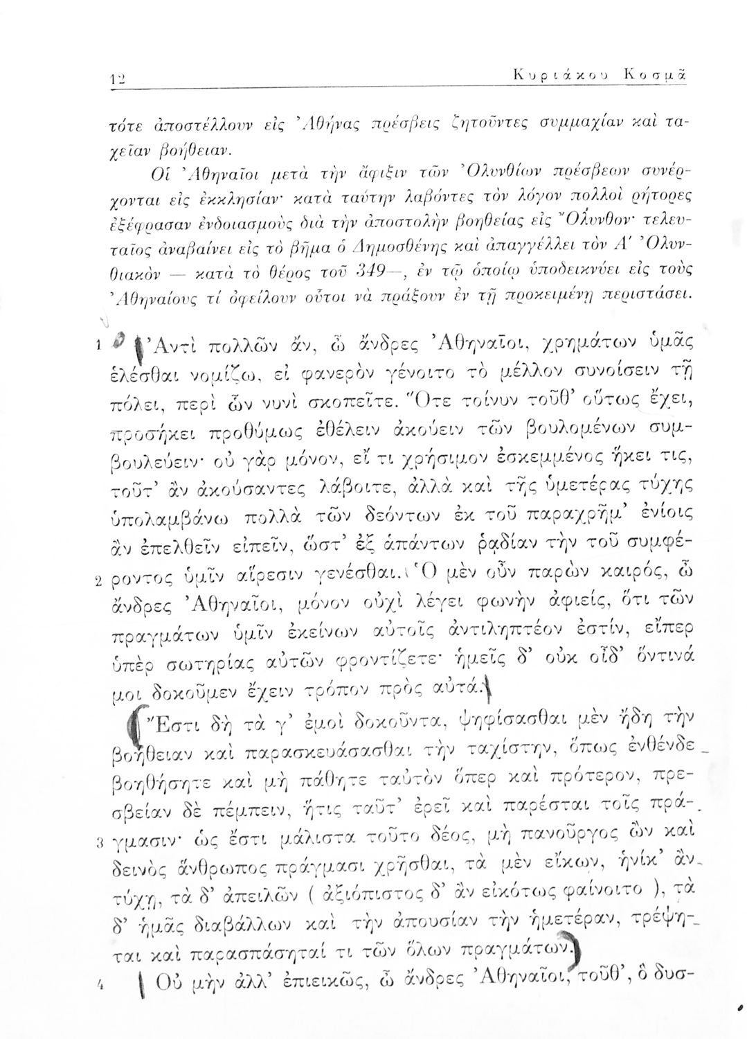 Σχολικό εγχειρίδιο Αρχαίων Ελληνικών Γυμνασίου που περιλαμβάνει τους Ολυνθιακούς Α΄ και Β΄ και τους Φιλιππικούς Α΄ και Β' του Δημοσθένη, εισαγωγή και ερμηνευτικά σχόλια.