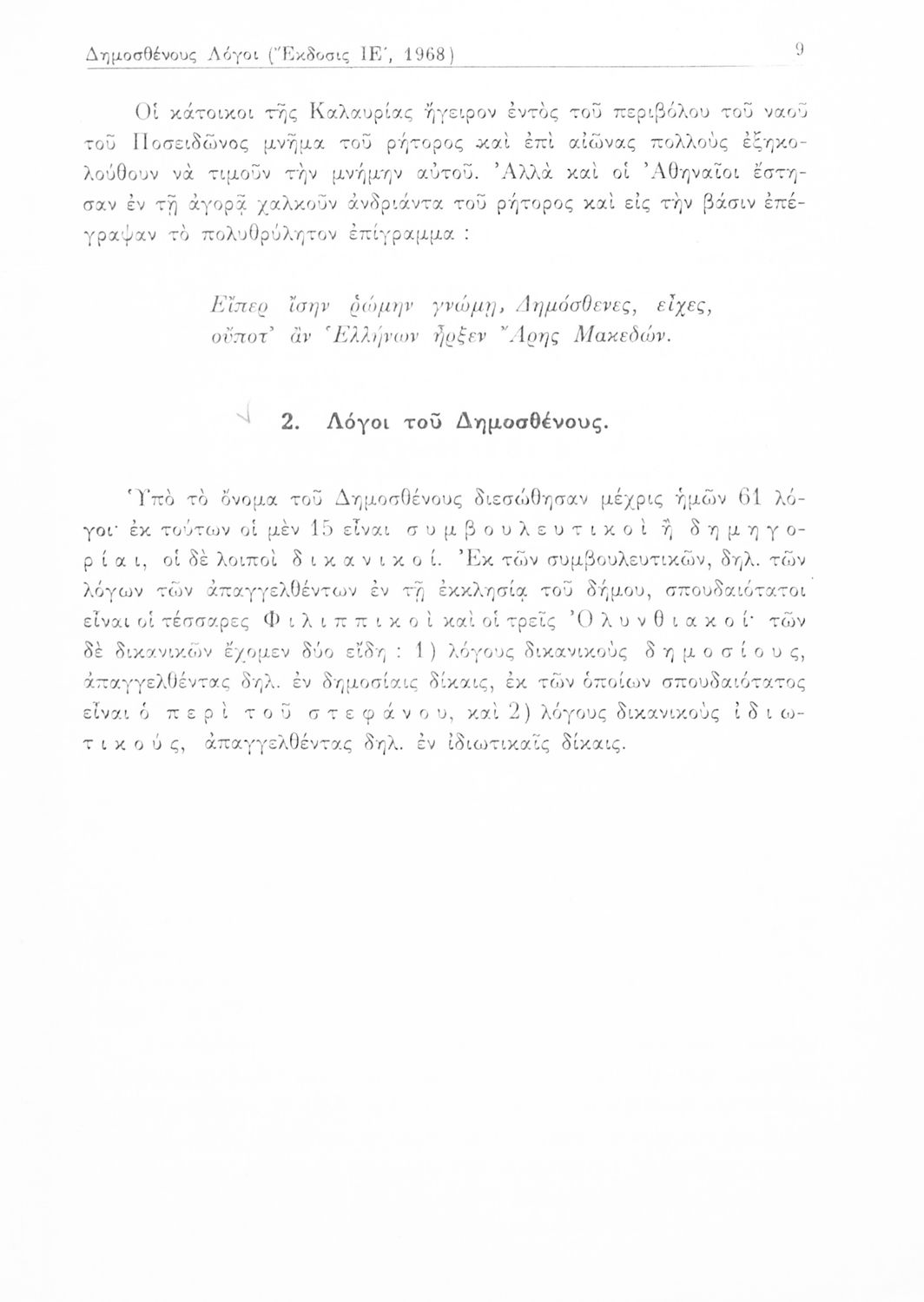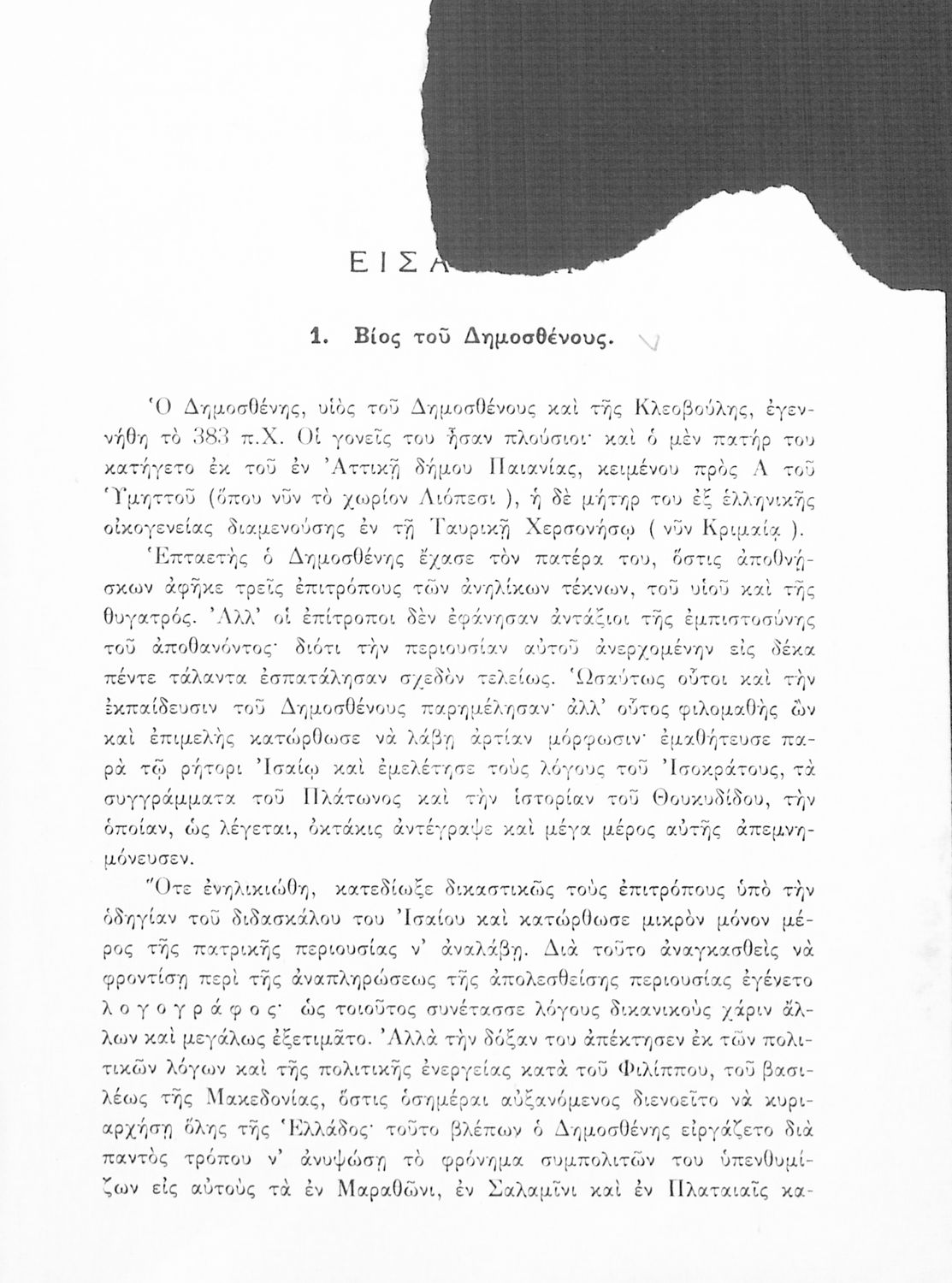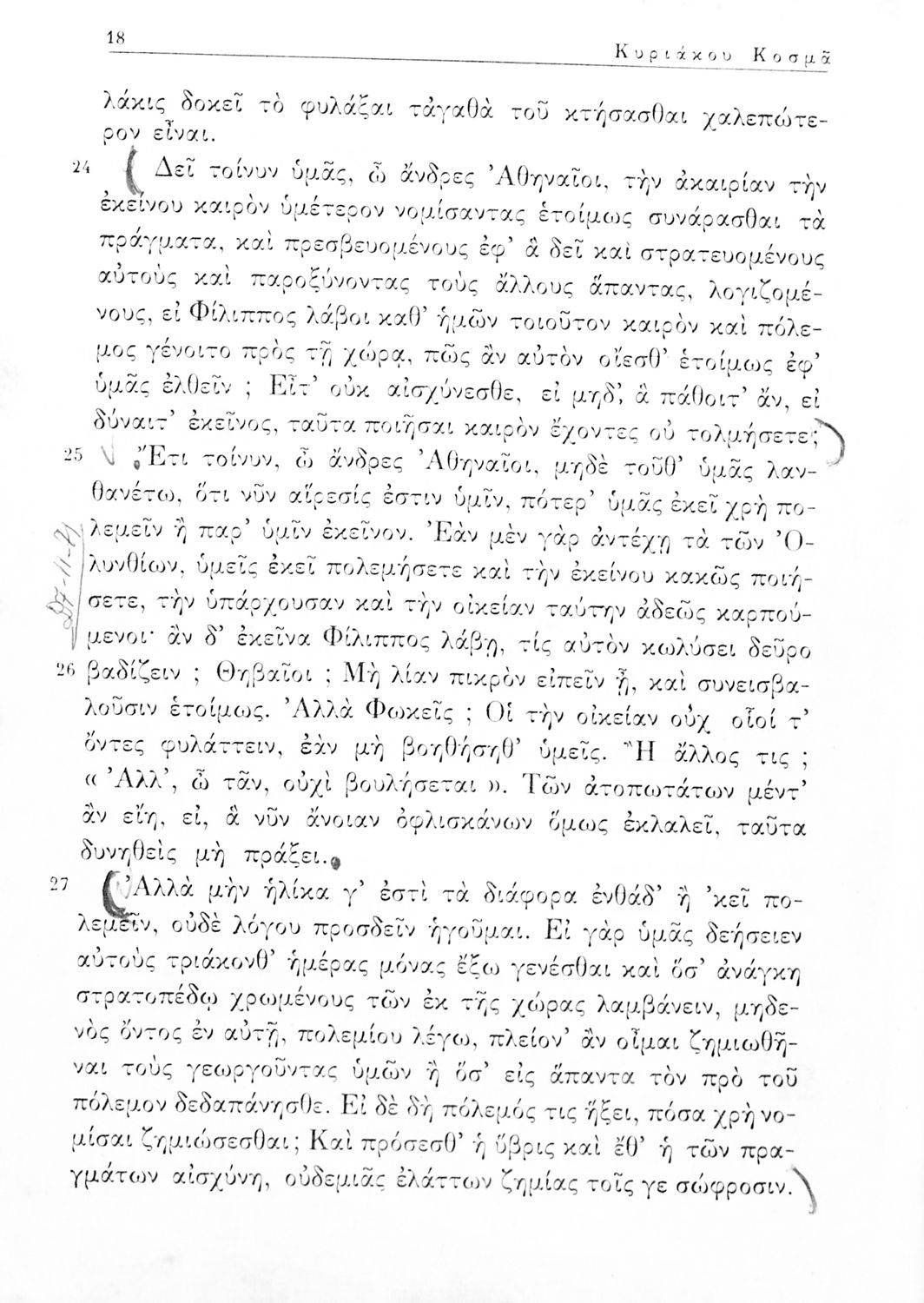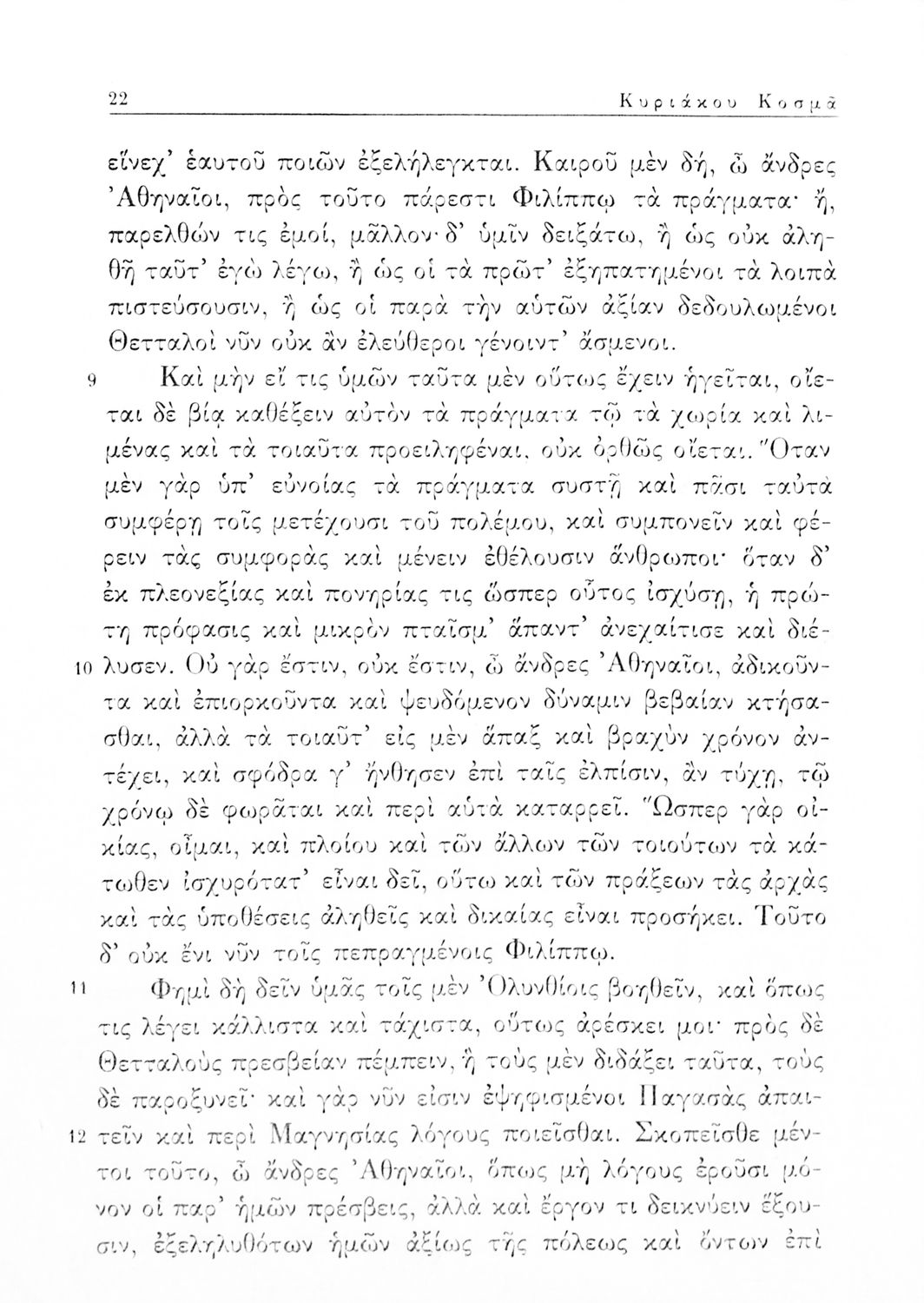 Σχολικό εγχειρίδιο Αρχαίων Ελληνικών Γυμνασίου που περιλαμβάνει τους Ολυνθιακούς Α΄ και Β΄ και τους Φιλιππικούς Α΄ και Β' του Δημοσθένη, εισαγωγή και ερμηνευτικά σχόλια.