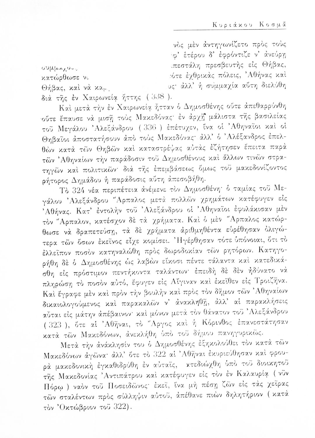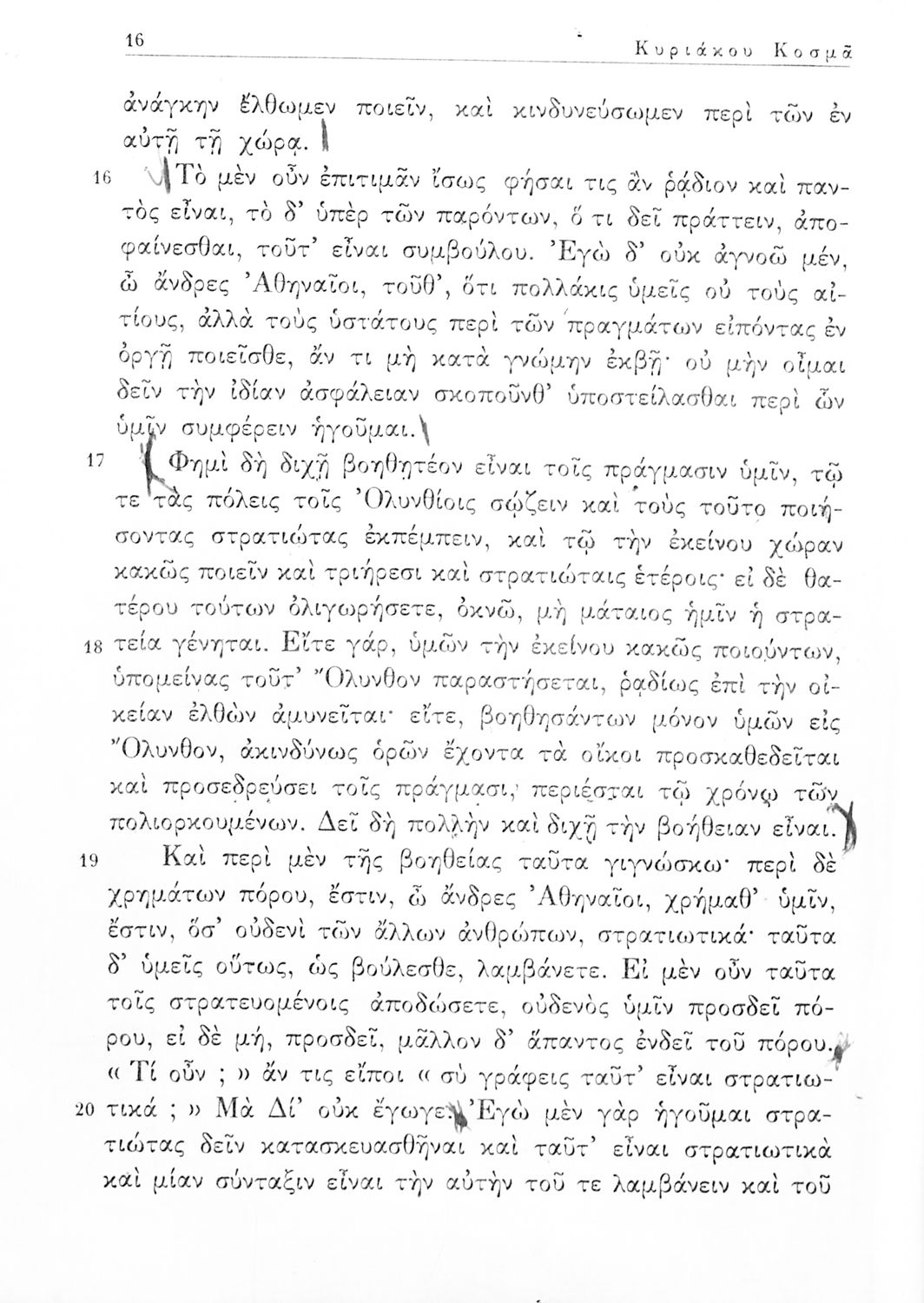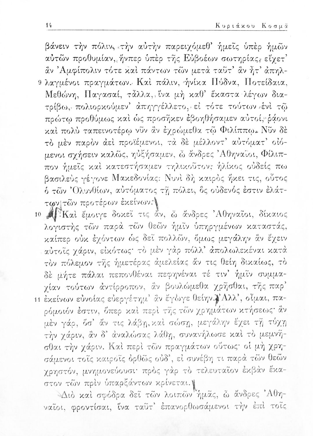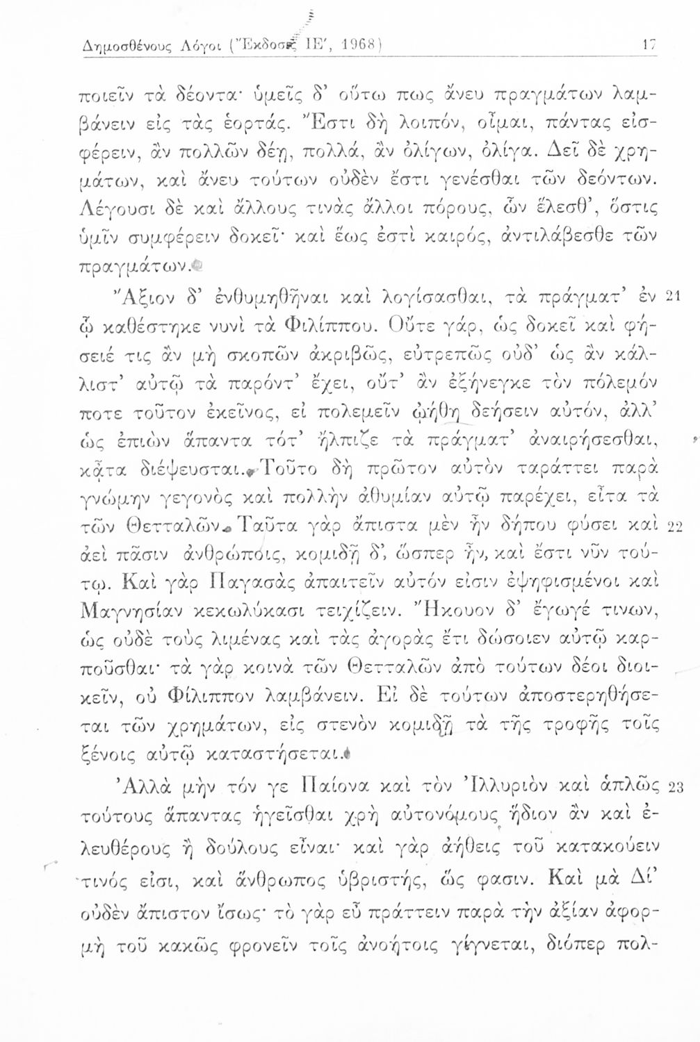 Σχολικό εγχειρίδιο Αρχαίων Ελληνικών Γυμνασίου που περιλαμβάνει τους Ολυνθιακούς Α΄ και Β΄ και τους Φιλιππικούς Α΄ και Β' του Δημοσθένη, εισαγωγή και ερμηνευτικά σχόλια.