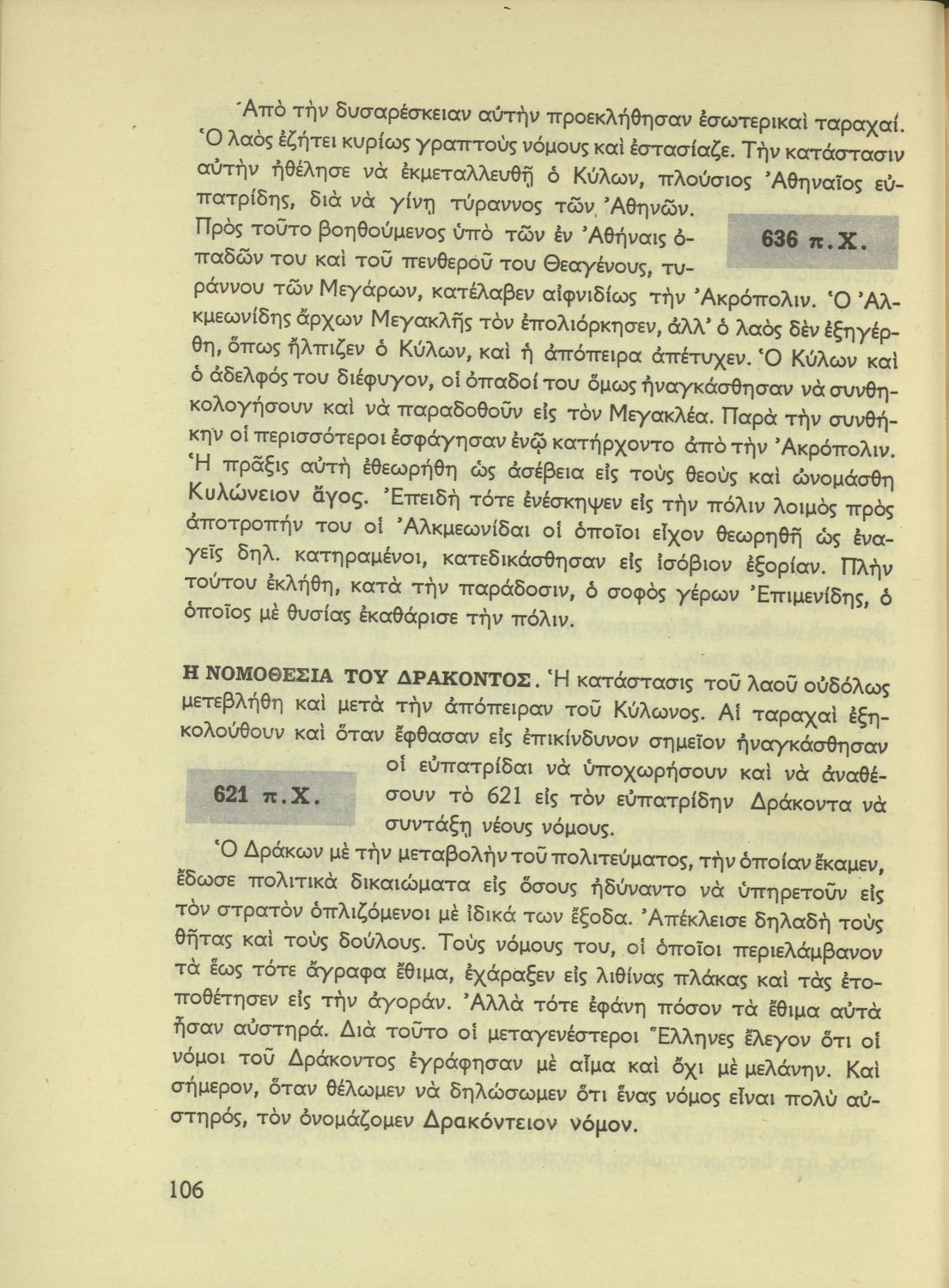 Σχολικό εγχειρίδιο Ιστορίας Α΄ Γυμνασίου που καλύπτει την περίοδο από την εμφάνιση των πρώτων πολιτισμών ως το τέλος της Μακεδονικής Ηγεμονίας. Φέρει το σύμβολο της δικτατορίας.