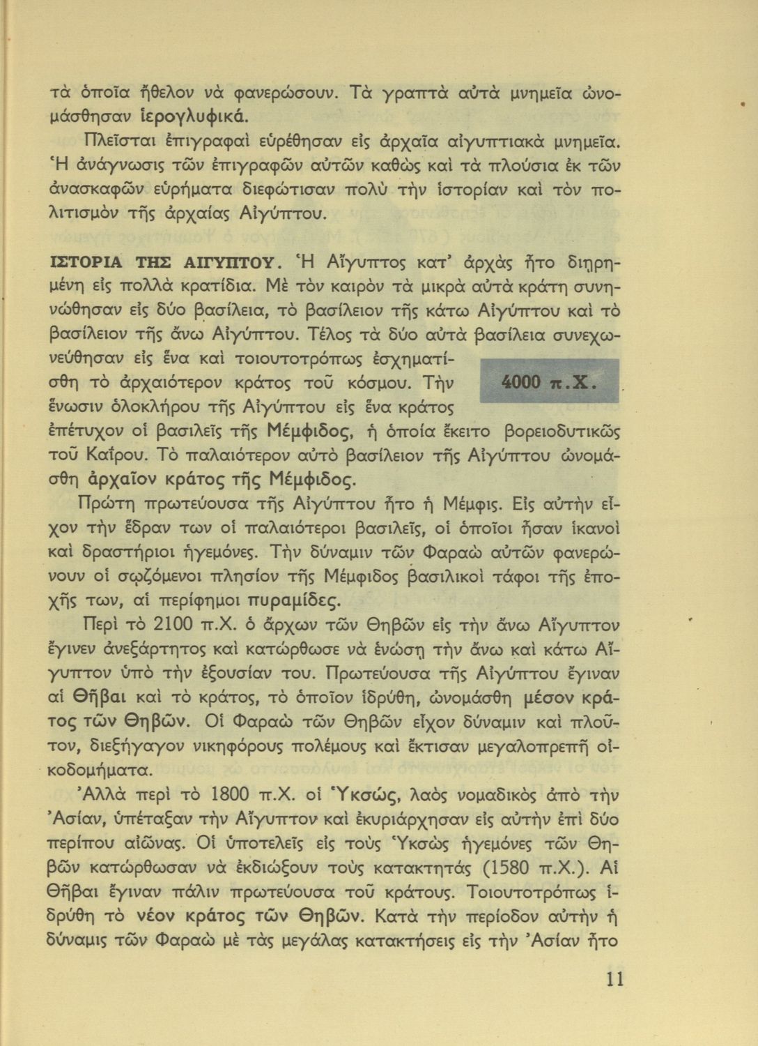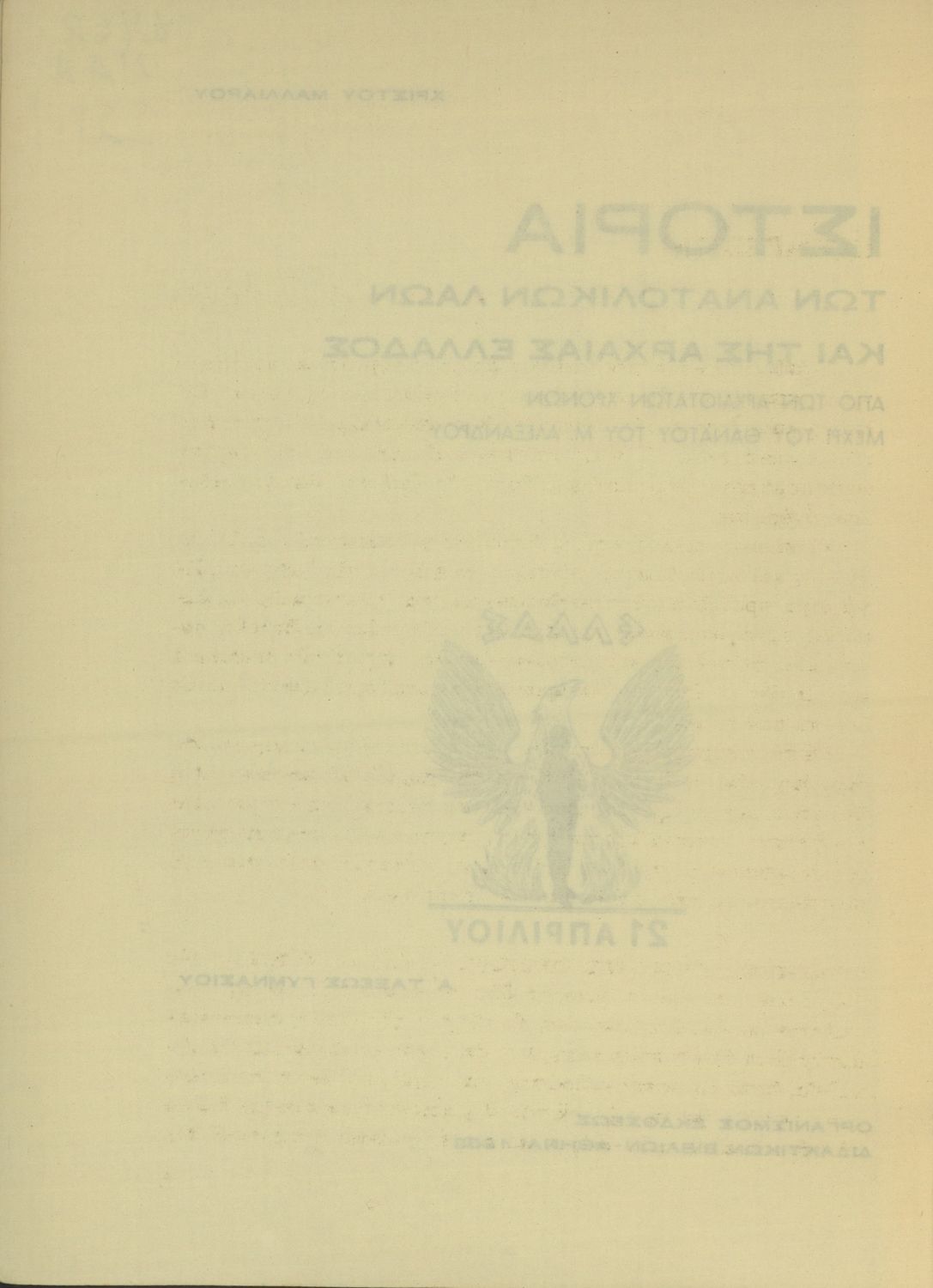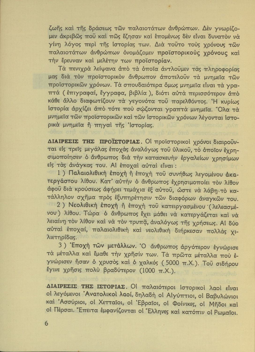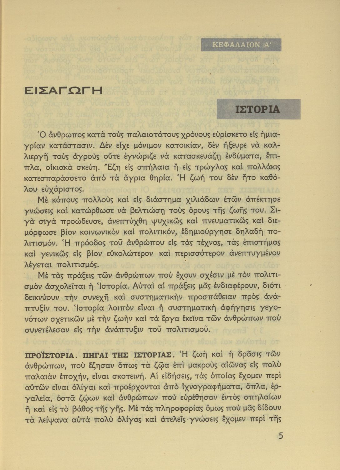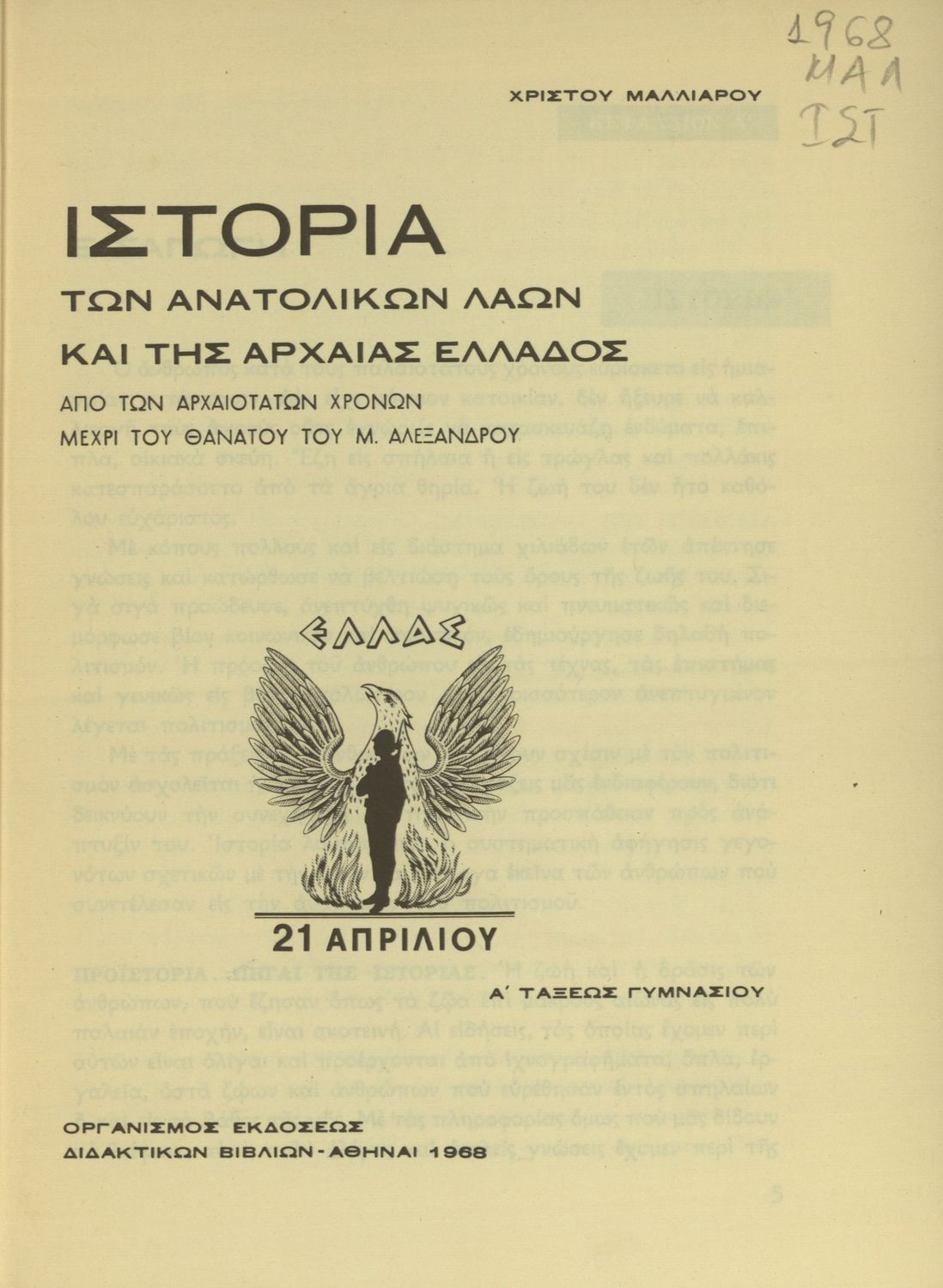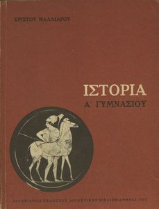Σχολικό εγχειρίδιο Ιστορίας Α΄ Γυμνασίου που καλύπτει την περίοδο από την εμφάνιση των πρώτων πολιτισμών ως το τέλος της Μακεδονικής Ηγεμονίας. Φέρει το σύμβολο της δικτατορίας.