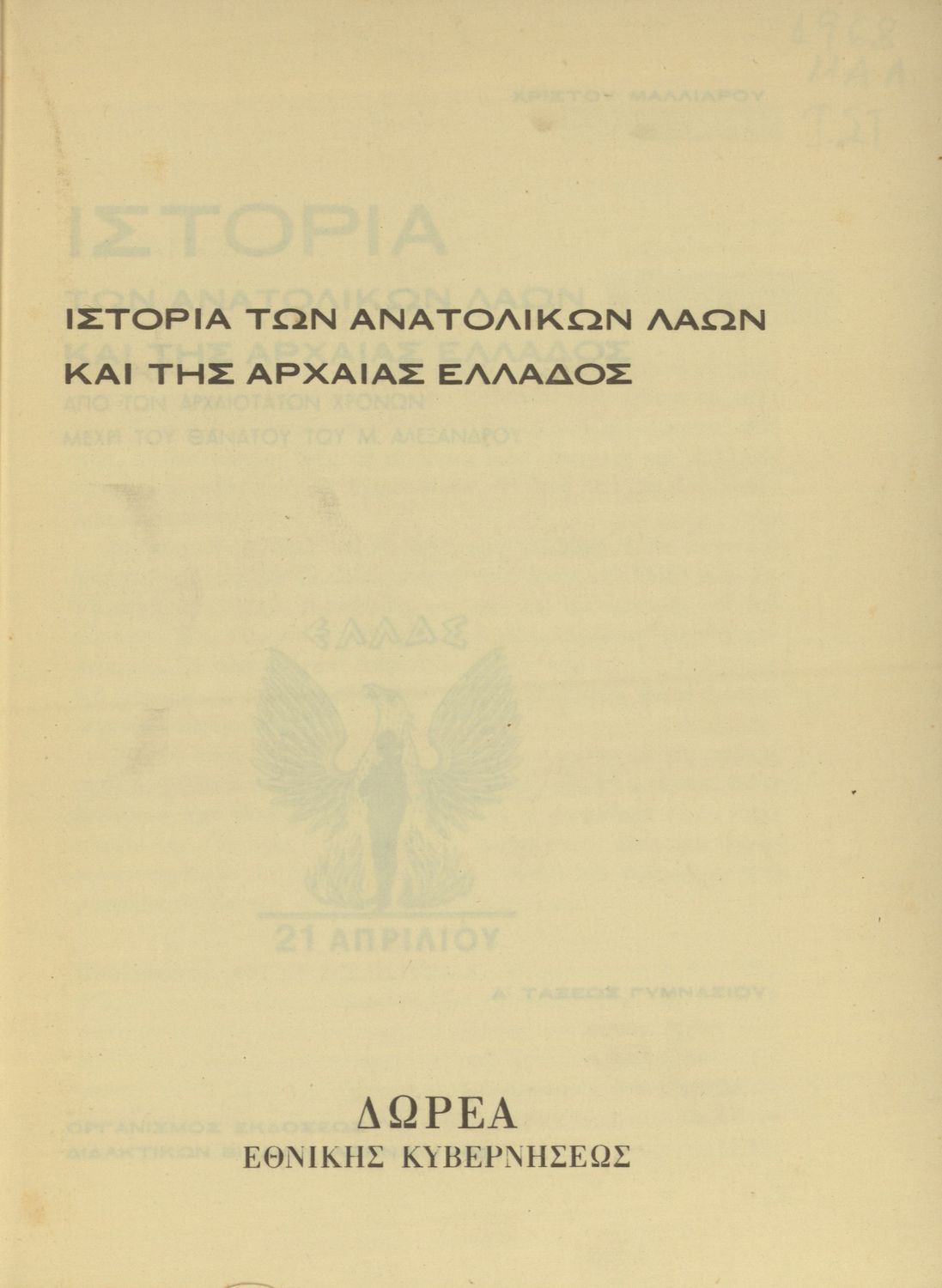 Τίτλος: Ιστορία των ανατολικών λαών και της αρχαίας Ελλάδος. Από των μηδικών πολέμων μέχρι του θανάτου του Μ. Αλεξάνδρου Α' Γυμνασίου