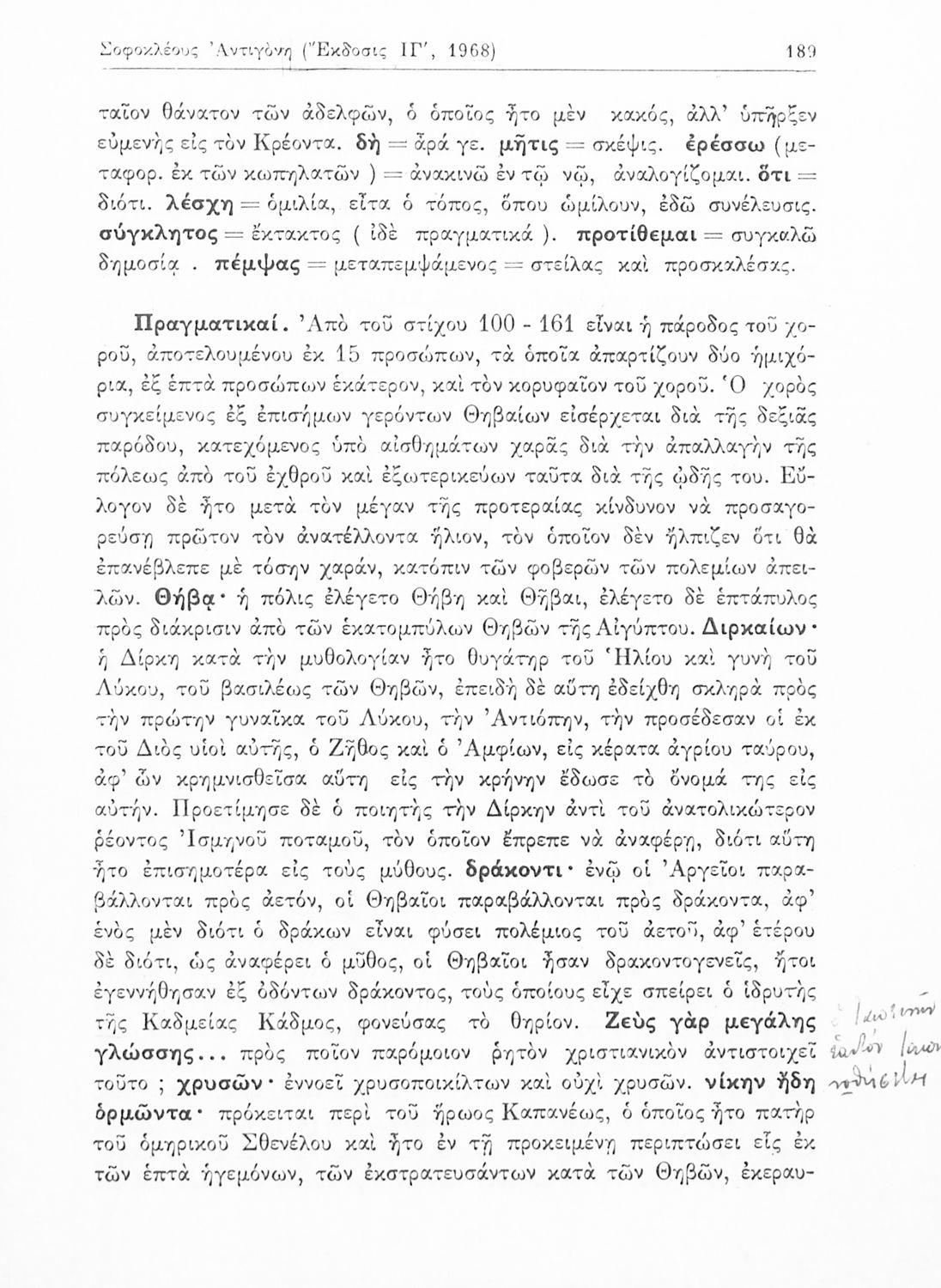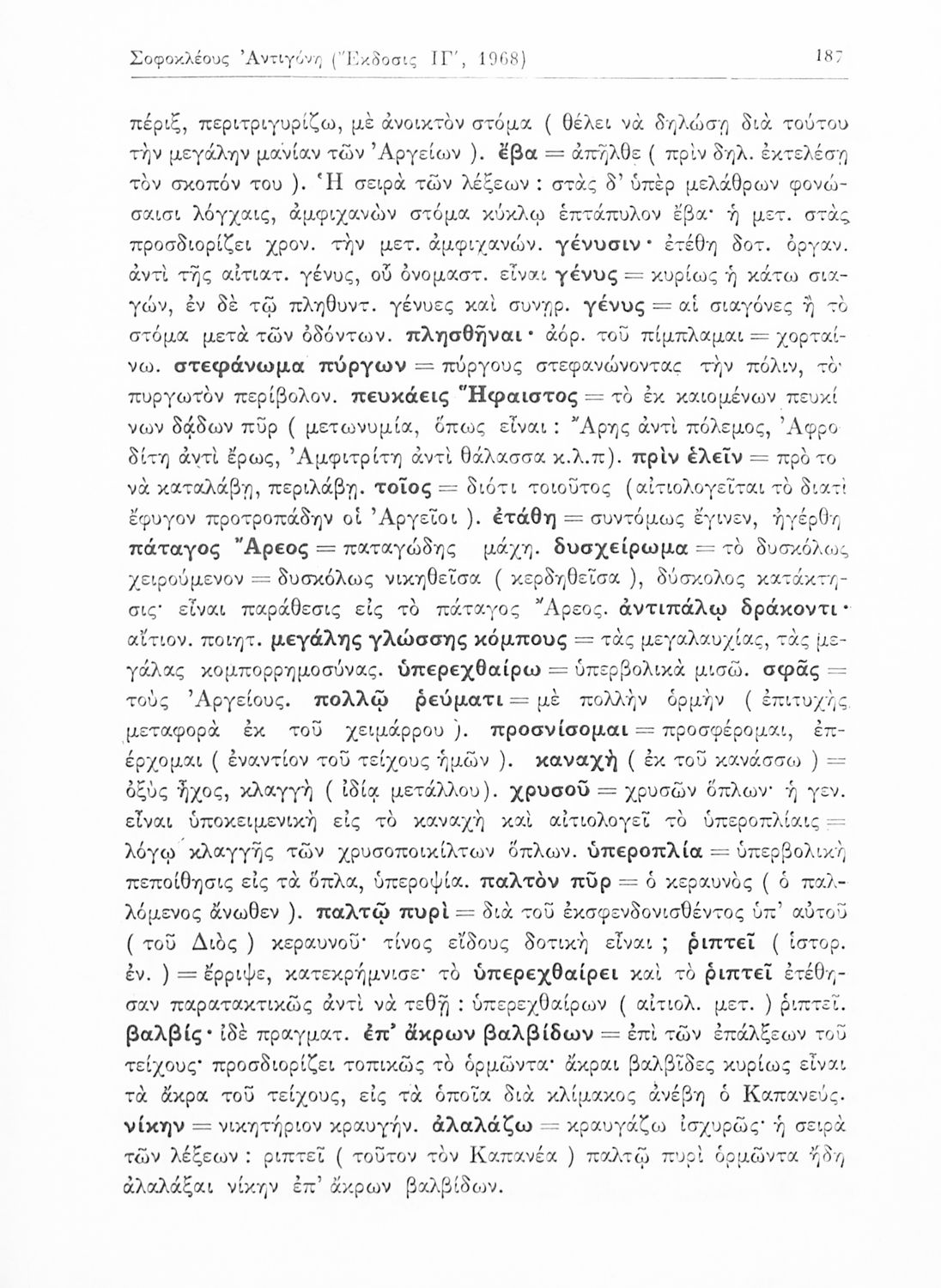 Παιδαγωγικό βοήθημα Αρχαίων Ελληνικών. Περιέχει τη τραγωδία του Σοφοκλή, την Αντιγόνη με σχόλια από τον Μιστριώτη που υπήρξε τακτικός καθηγητής των ελληνικών γραμμάτων στο εθνικό Πανεπιστήμιο.