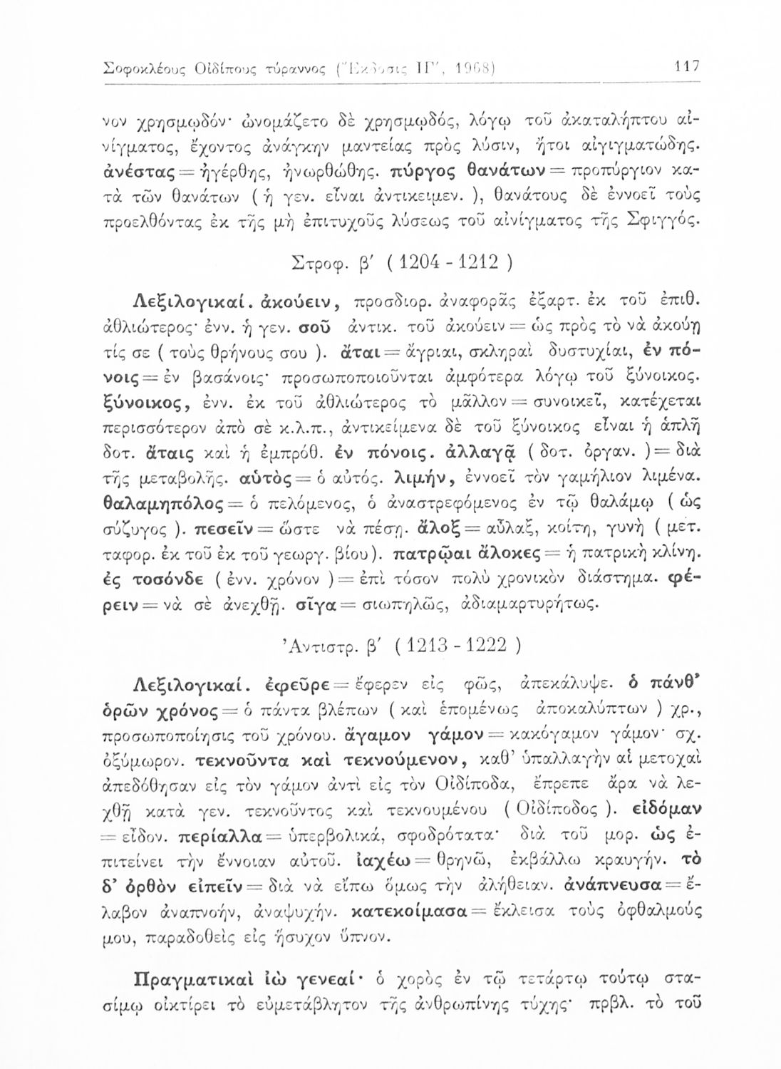 Σχολικό εγχειρίδιο Αρχαίων Ελληνικών Γυμνασίου το οποίο περιλαμβάνει το έργο του Σοφοκλή 'Οιδίπους Τύραννος'. Το βιβλίο ξεκινάει με μια εισαγωγή στην αρχαία ελληνική τραγωδία και βιογραφικά στοιχεία του Σοφοκλή. Στη συνέχεια παρουσιάζει το εν λόγω κείμενο το οποίο συνοδεύεται από ερμηνευτικές και γλωσσικές σημειώσεις.