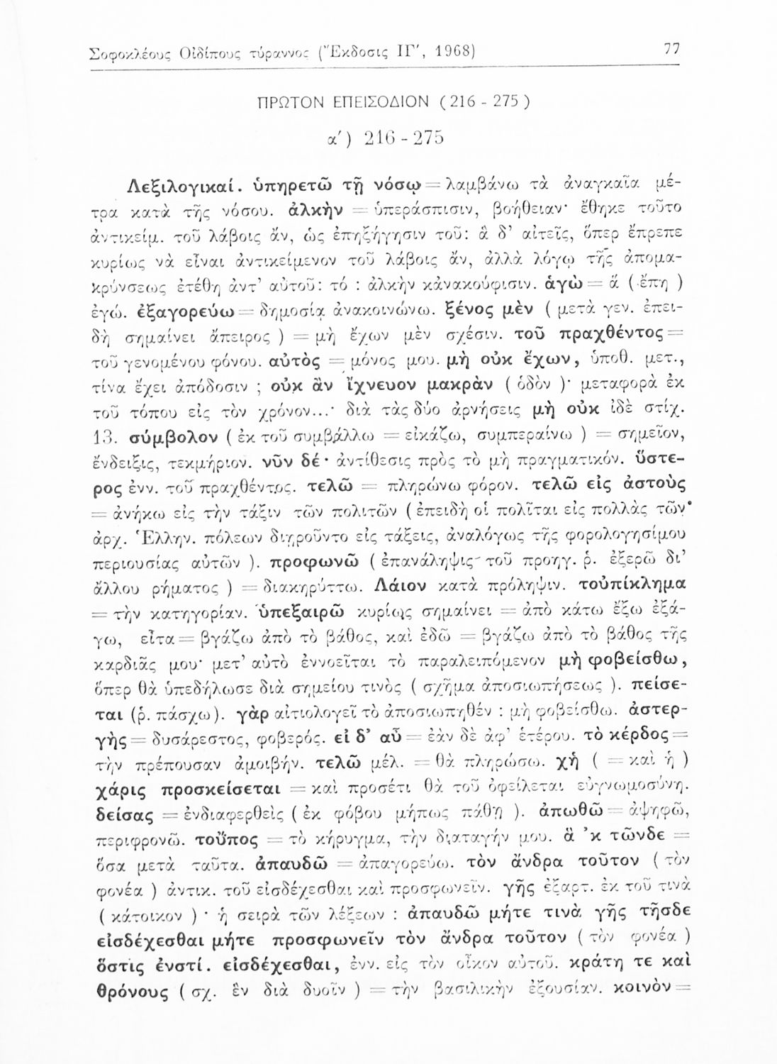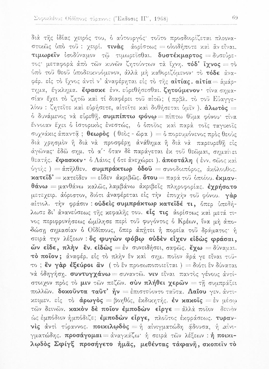 Σχολικό εγχειρίδιο του Γυμνασίου για το μάθημα των Αρχαίων Ελληνικών που περιέχει την τραγωδία του Σοφοκλή Οιδίπους Τύραννος, ερμηνευτικά και πραγματολογικά σχόλια και λεξιλογικές παρατηρήσεις.