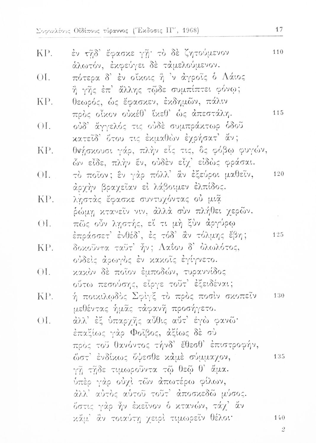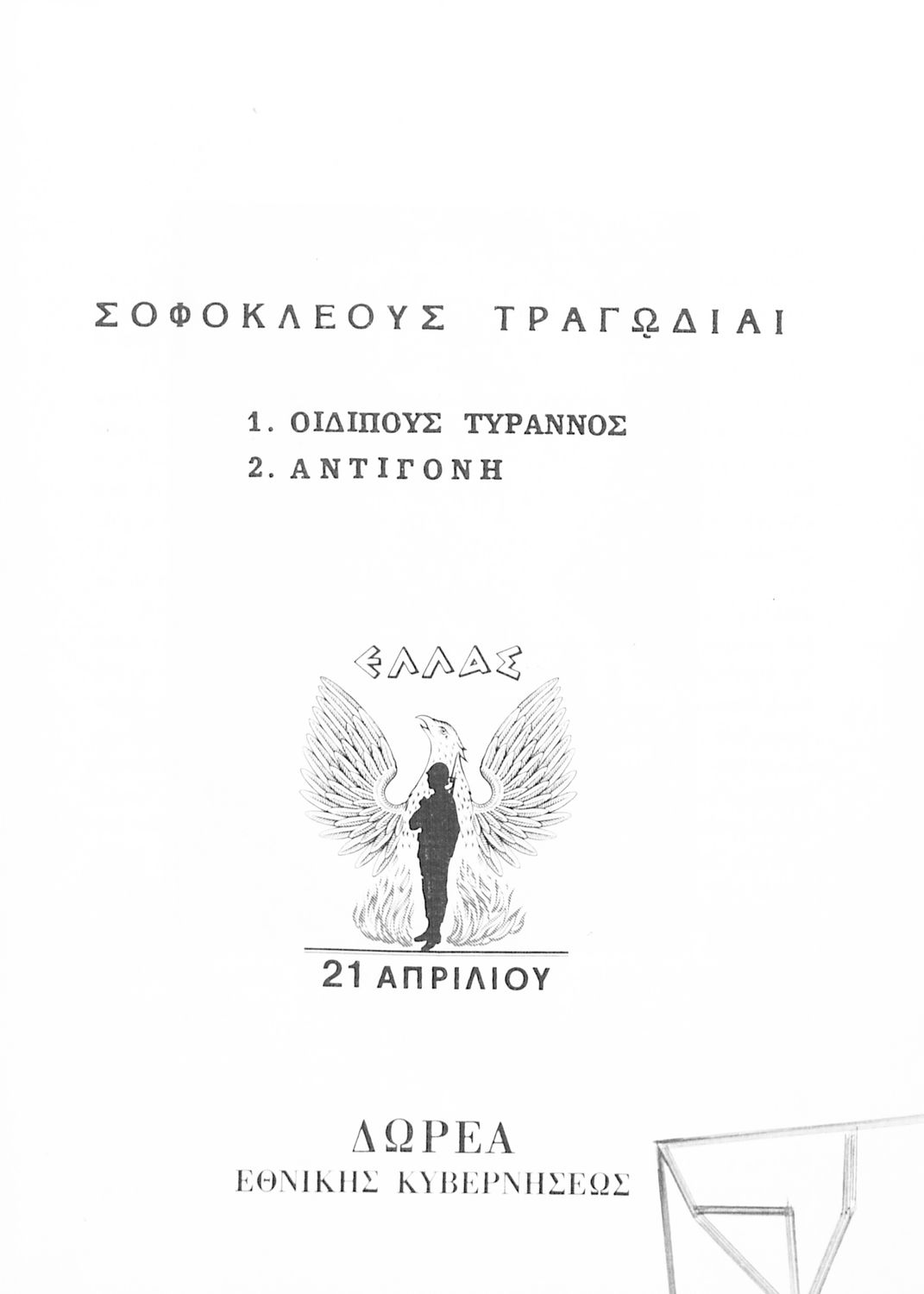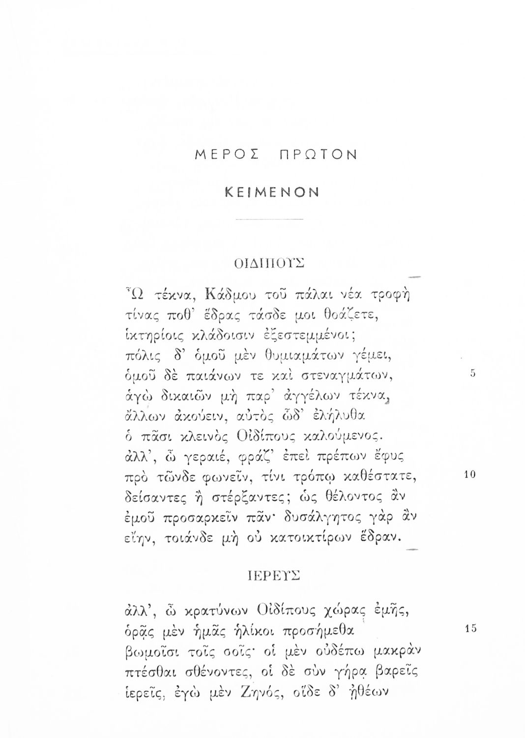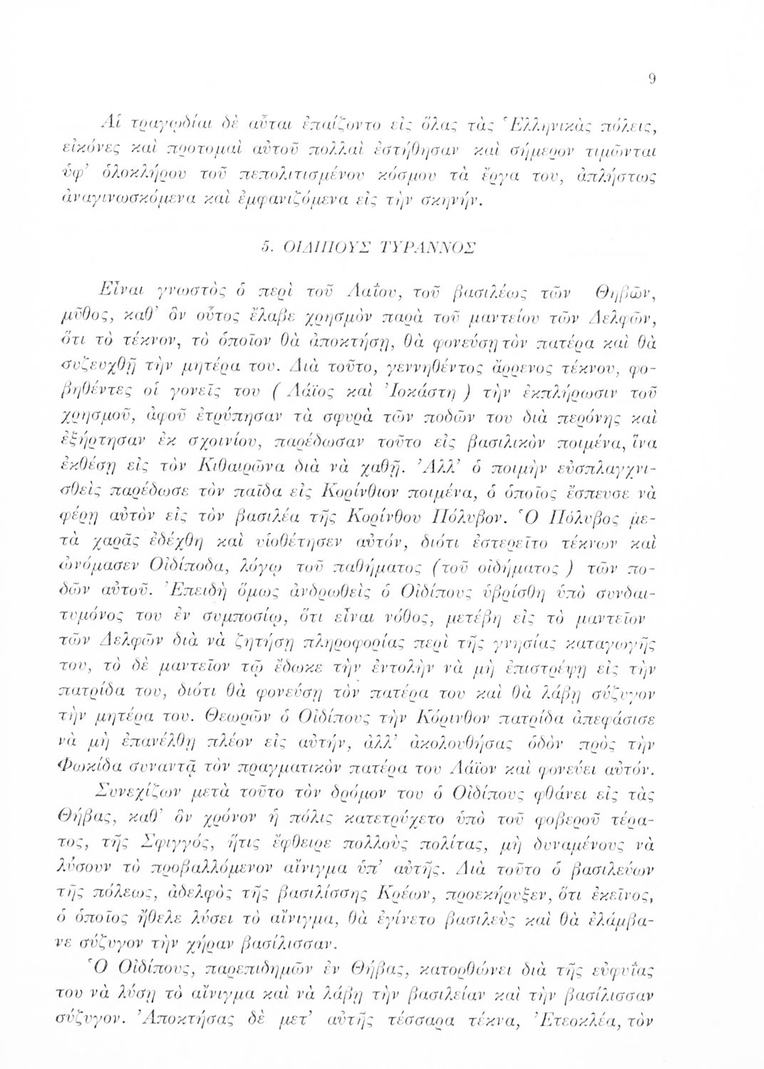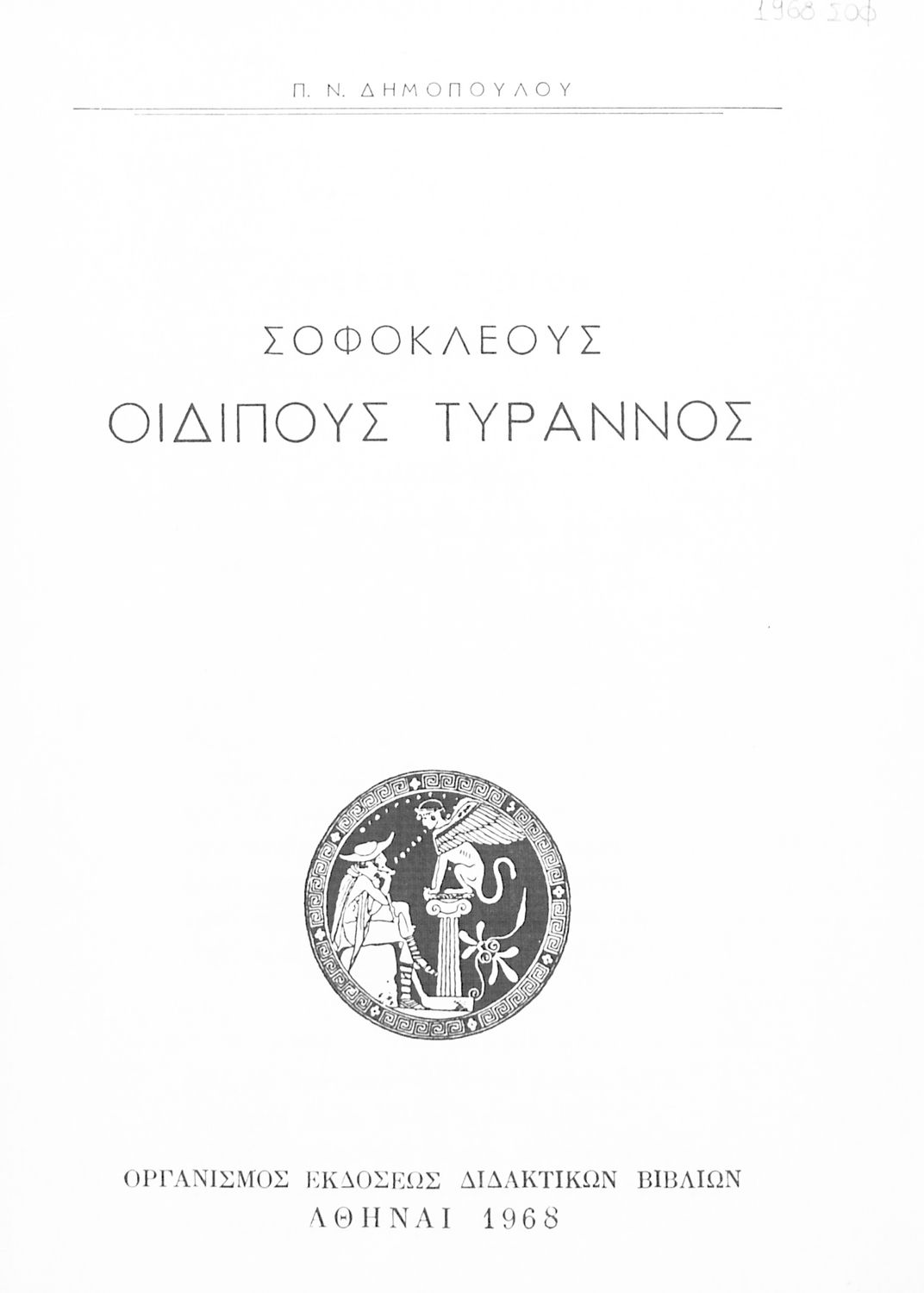 Σχολικό εγχειρίδιο Αρχαίων Ελληνικών Γυμνασίου το οποίο περιλαμβάνει το έργο του Σοφοκλή 'Οιδίπους Τύραννος'. Το βιβλίο ξεκινάει με μια εισαγωγή στην αρχαία ελληνική τραγωδία και βιογραφικά στοιχεία του Σοφοκλή. Στη συνέχεια παρουσιάζει το εν λόγω κείμενο το οποίο συνοδεύεται από ερμηνευτικές και γλωσσικές σημειώσεις.