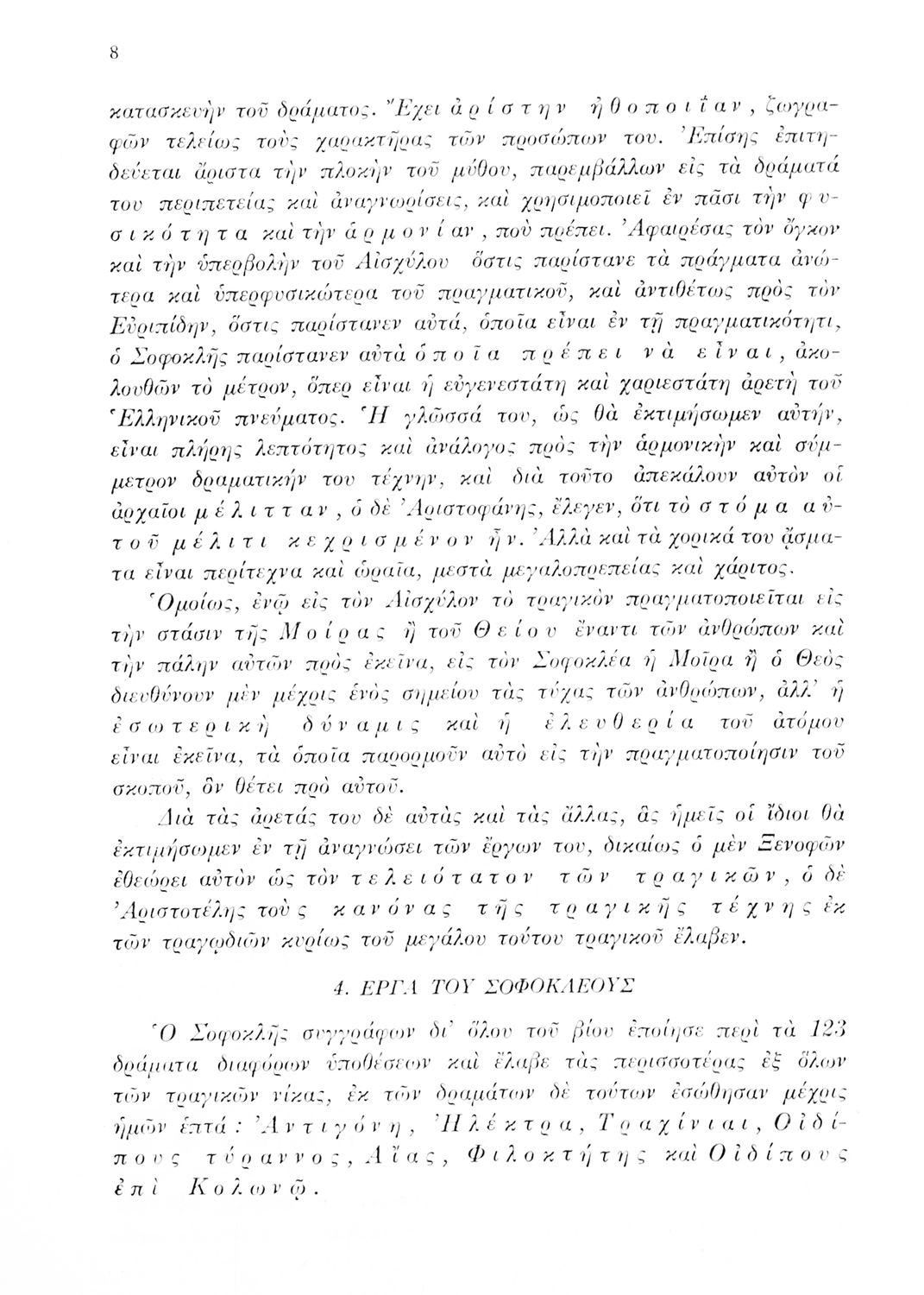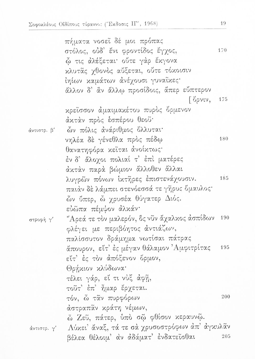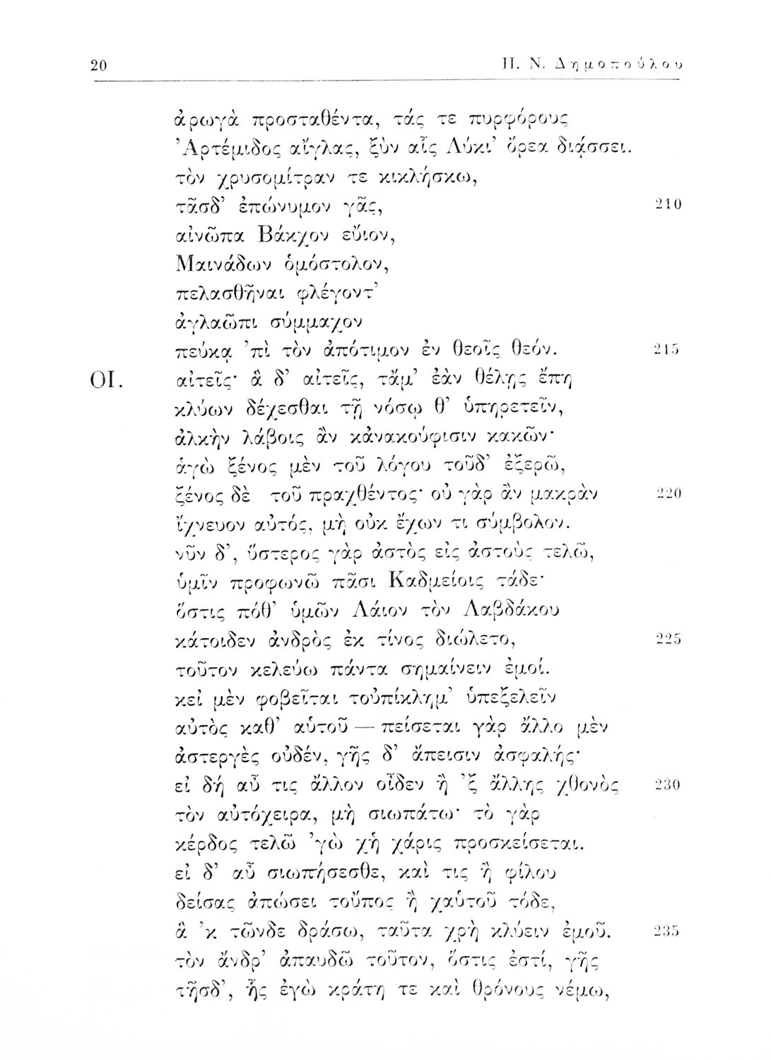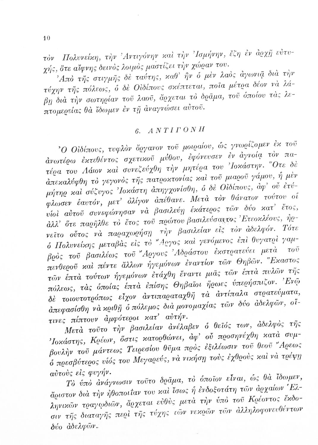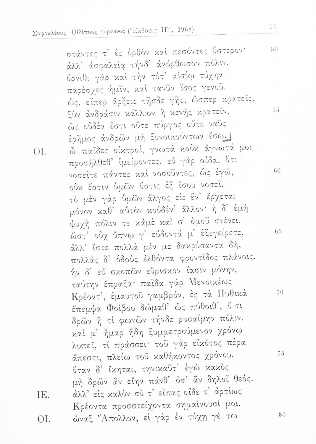 Σχολικό εγχειρίδιο Αρχαίων Ελληνικών Γυμνασίου το οποίο περιλαμβάνει το έργο του Σοφοκλή 'Οιδίπους Τύραννος'. Το βιβλίο ξεκινάει με μια εισαγωγή στην αρχαία ελληνική τραγωδία και βιογραφικά στοιχεία του Σοφοκλή. Στη συνέχεια παρουσιάζει το εν λόγω κείμενο το οποίο συνοδεύεται από ερμηνευτικές και γλωσσικές σημειώσεις.