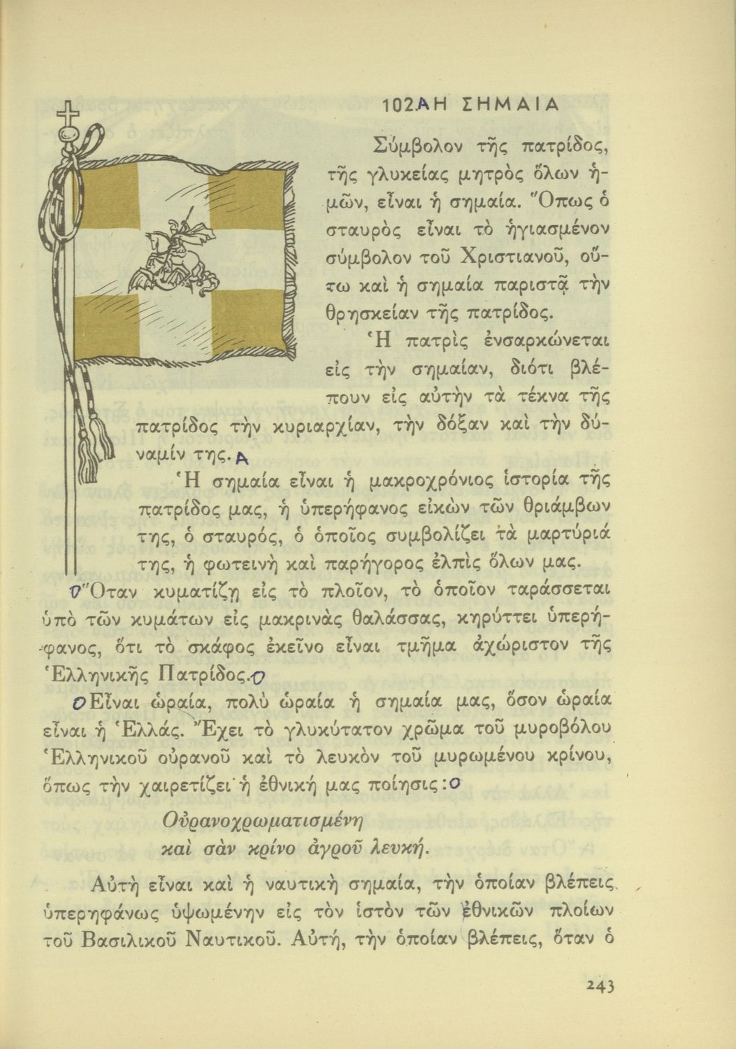 Αναγνωστικό ΣΤ΄ Δημοτικού που αντλεί τα θέματά του από τη θρησκευτική, εθνική, οικογενειακή, κοινωνική και επαγγελματική ζωή και την σύγχρονη ελληνική ιστορία. Φέρει το σύμβολο της δικτατορίας.
