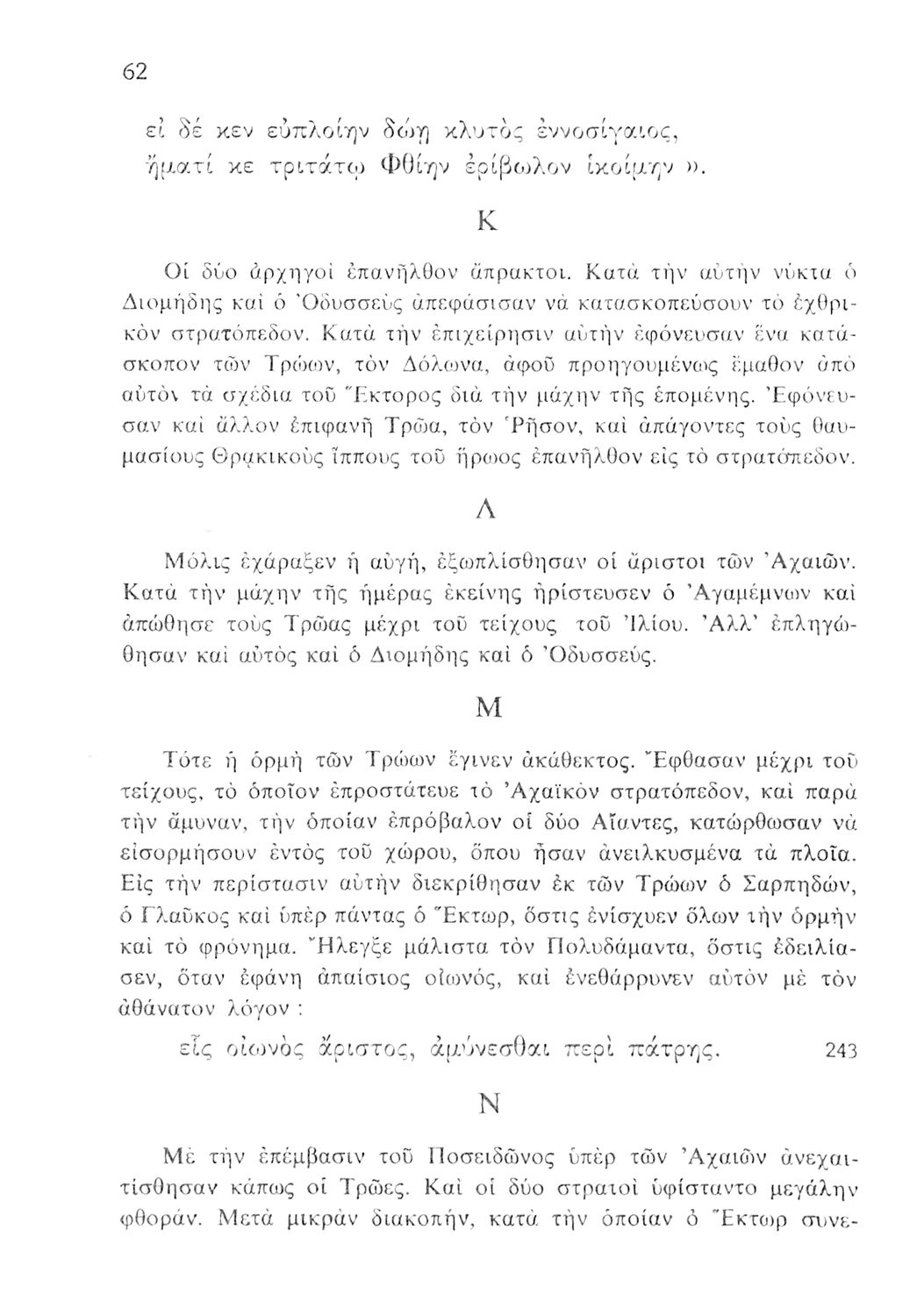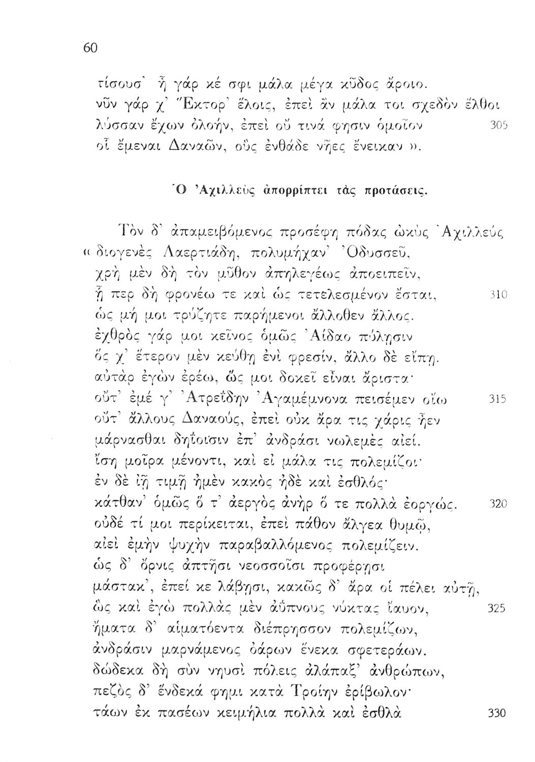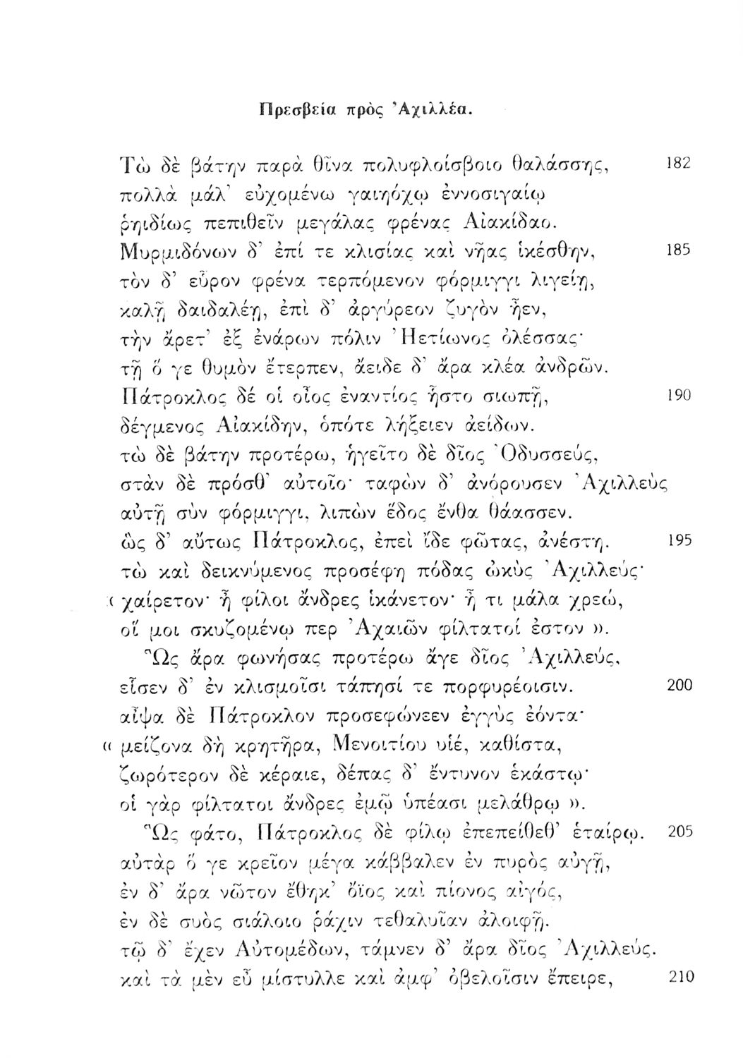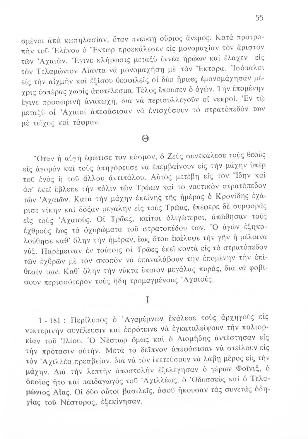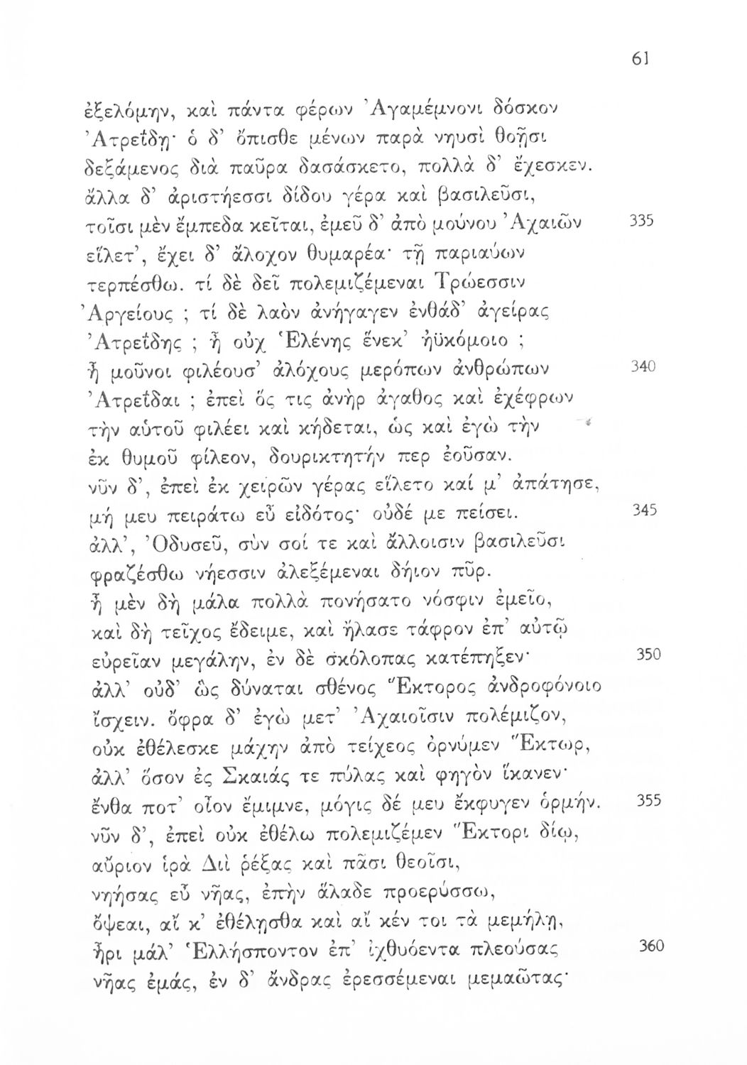 Σχολικό εγχειρίδιο Αρχαίων Ελληνικών των τριών τάξεων του Λυκείου. Το βιβλίο περιέχει αποσπάσματα από το ομηρικό έπος της 'Ιλιάδας'. Το βιβλίο ξεκινάει για την ιστορία του Τρωικού πόλεμου και συνεχίζει με αποσπάσματα από το ίδιο το έργο τα οποία συνοδεύονται από γλωσσικές και ερμηνευτικές σημειώσεις.