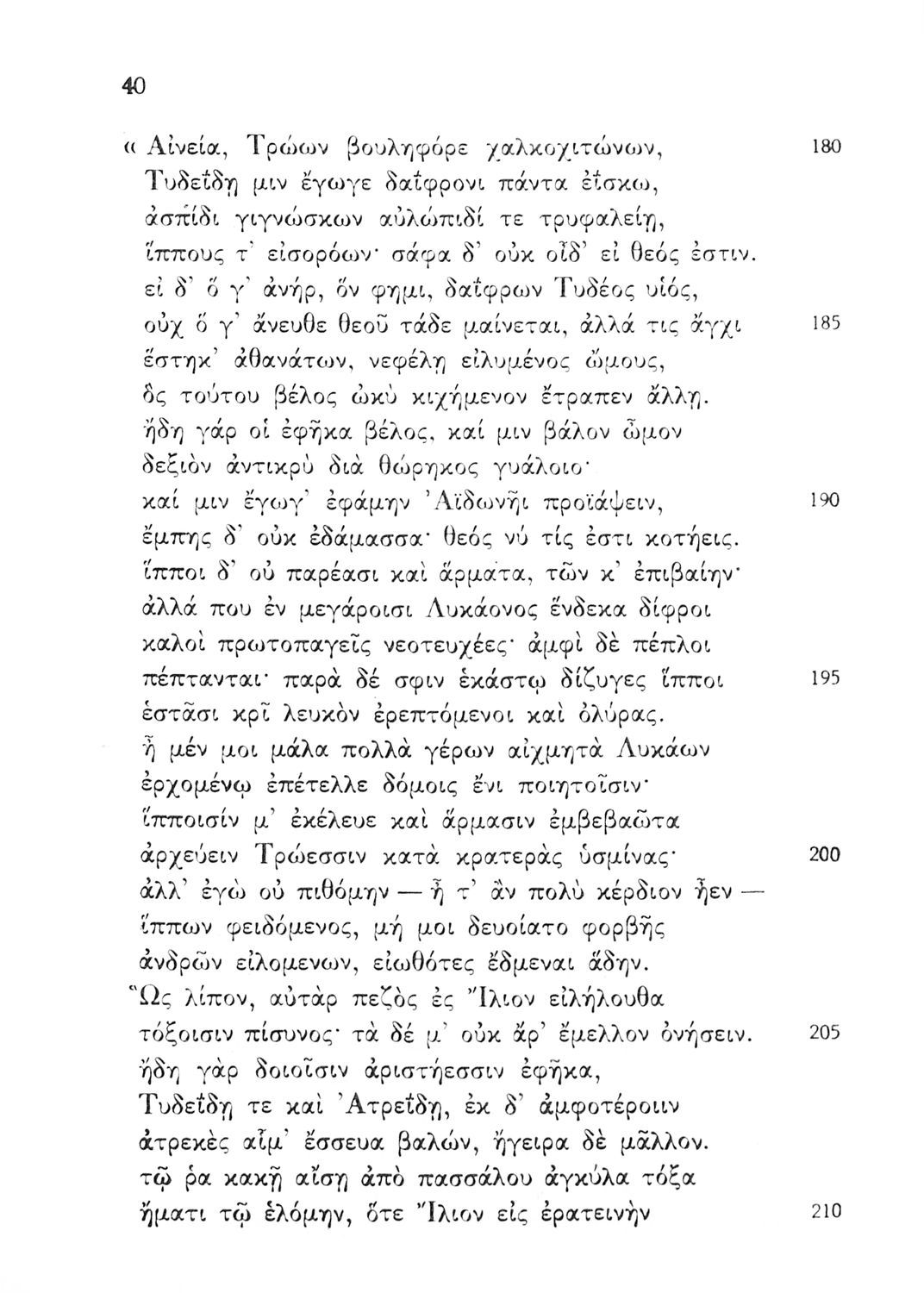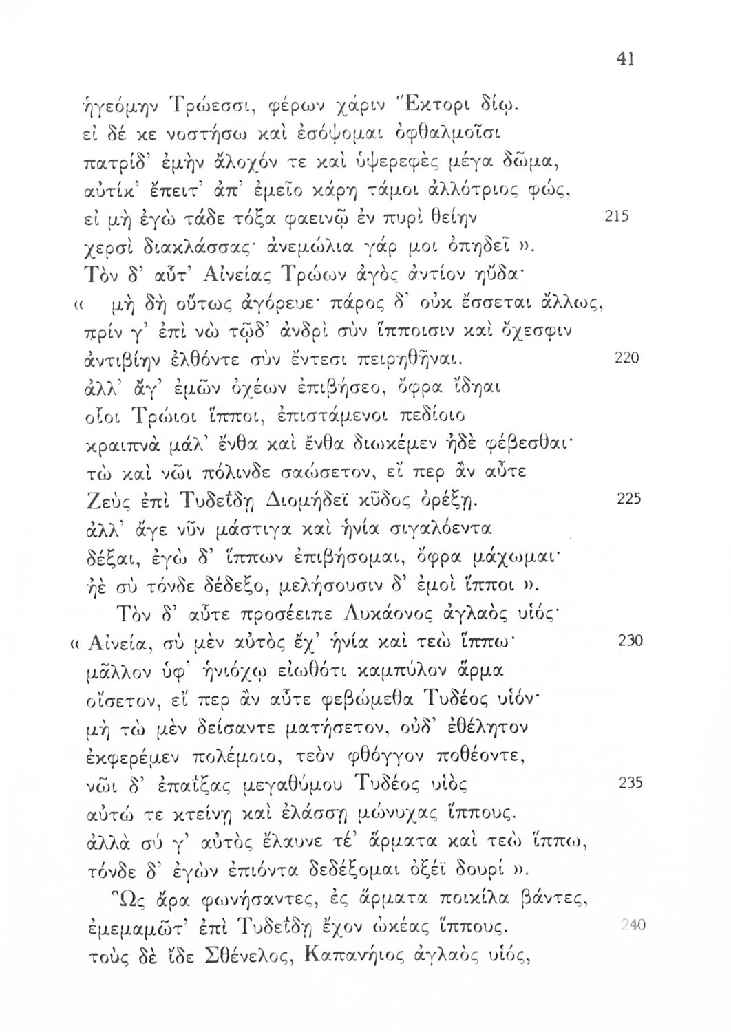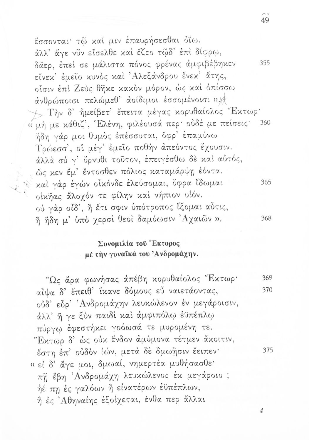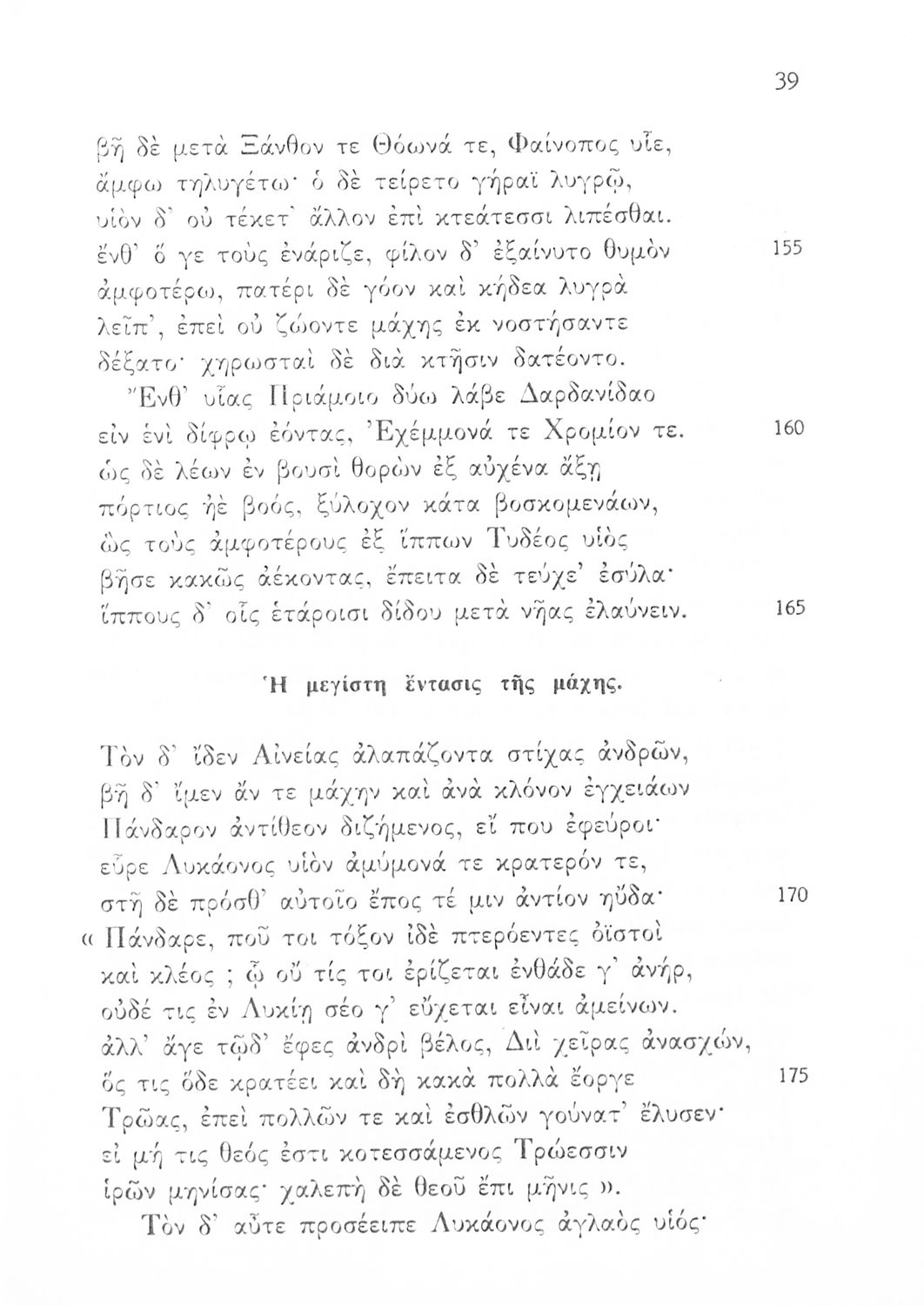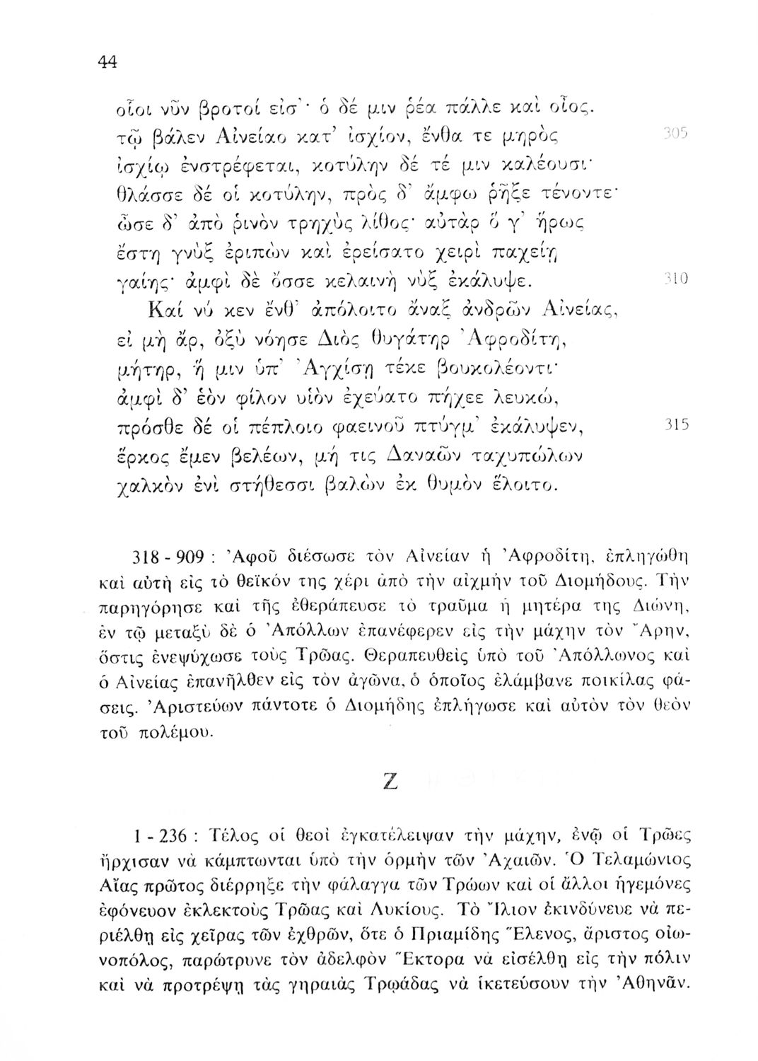 Σχολικό εγχειρίδιο Αρχαίων Ελληνικών των τριών τάξεων του Λυκείου. Το βιβλίο περιέχει αποσπάσματα από το ομηρικό έπος της 'Ιλιάδας'. Το βιβλίο ξεκινάει για την ιστορία του Τρωικού πόλεμου και συνεχίζει με αποσπάσματα από το ίδιο το έργο τα οποία συνοδεύονται από γλωσσικές και ερμηνευτικές σημειώσεις.