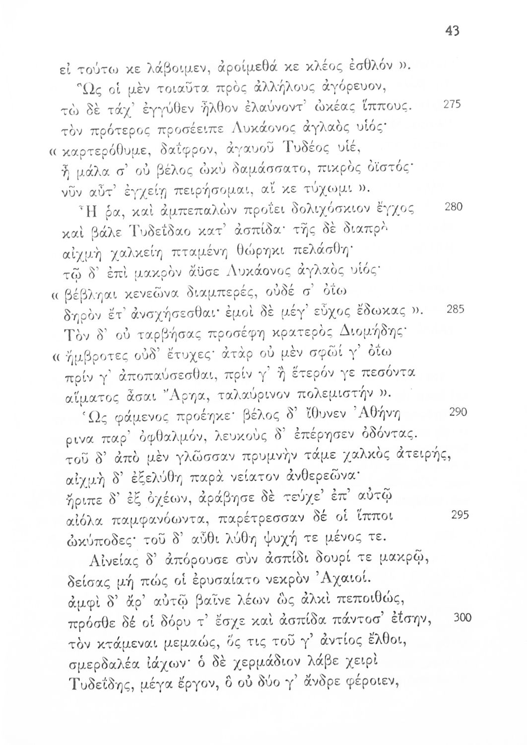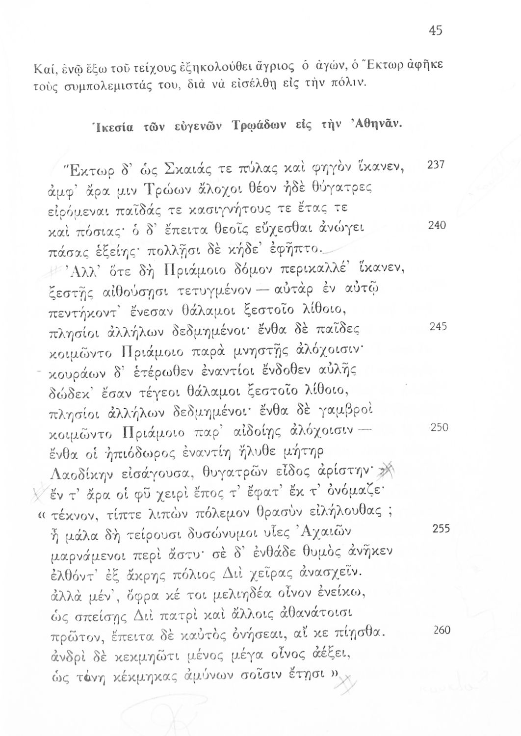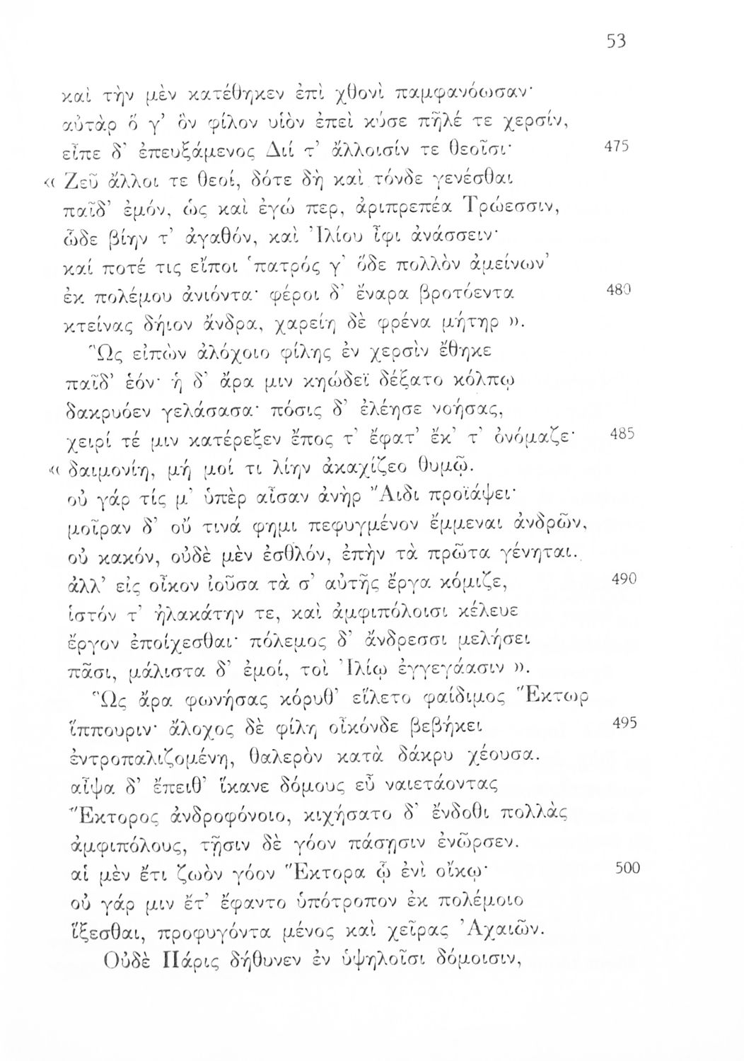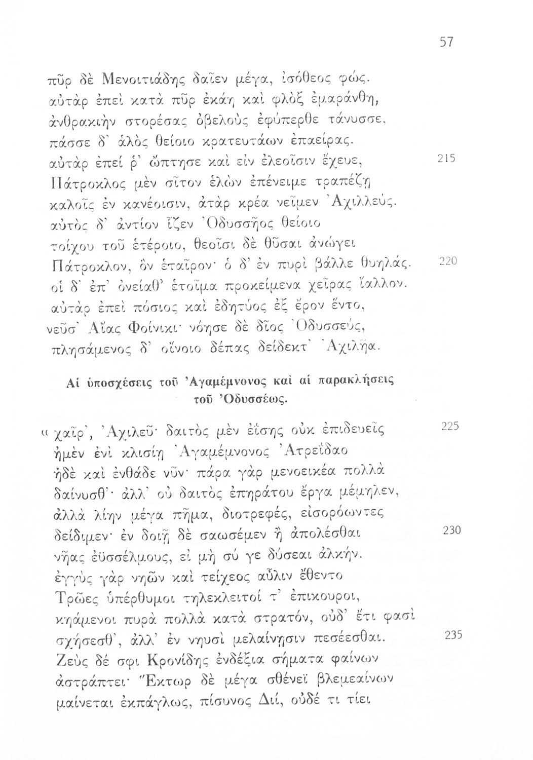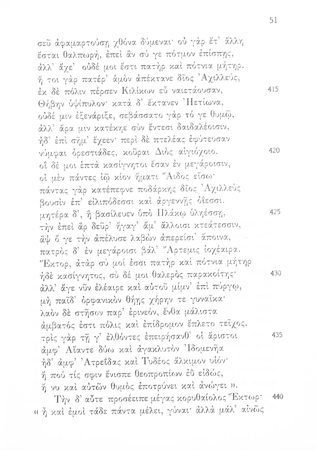 Σχολικό εγχειρίδιο Αρχαίων Ελληνικών των τριών τάξεων του Λυκείου. Το βιβλίο περιέχει αποσπάσματα από το ομηρικό έπος της 'Ιλιάδας'. Το βιβλίο ξεκινάει για την ιστορία του Τρωικού πόλεμου και συνεχίζει με αποσπάσματα από το ίδιο το έργο τα οποία συνοδεύονται από γλωσσικές και ερμηνευτικές σημειώσεις.