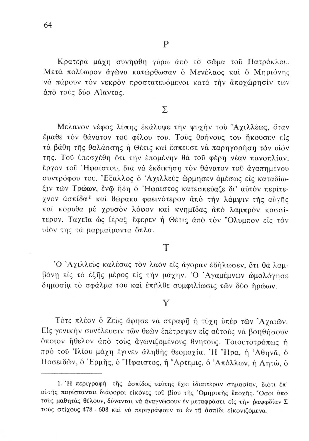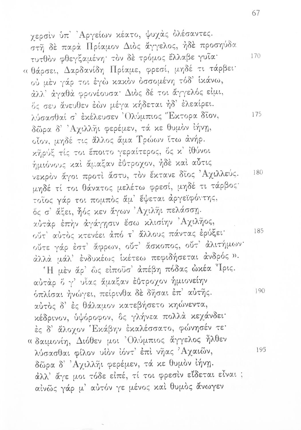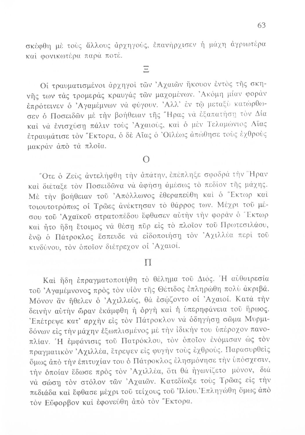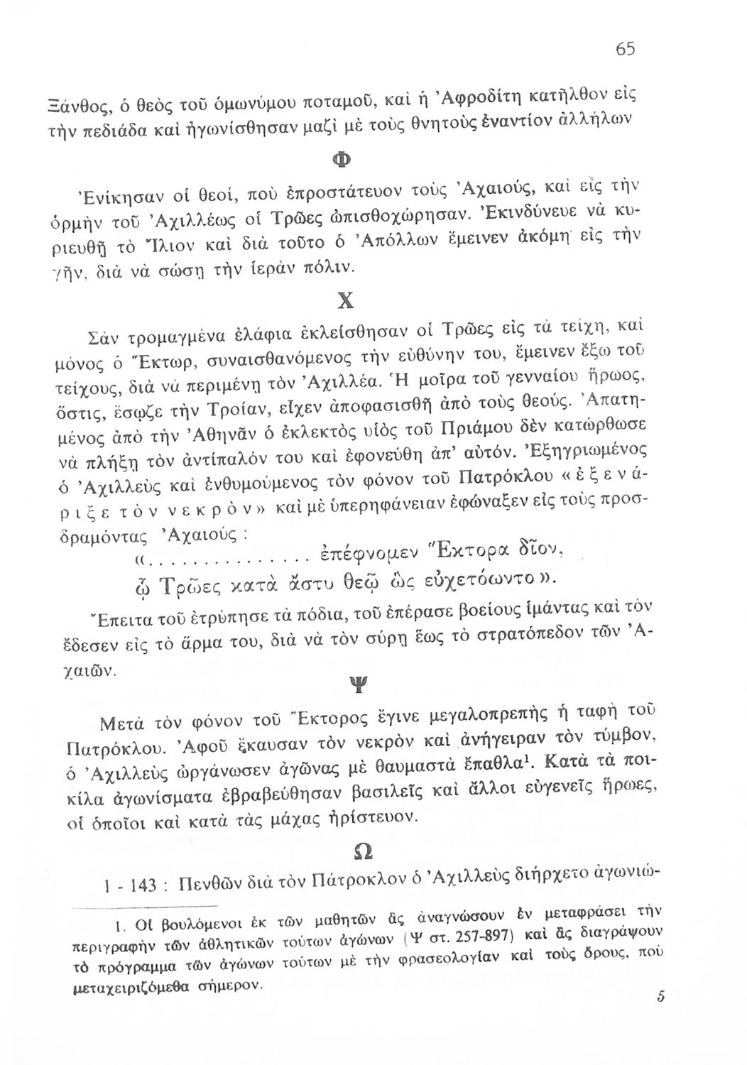 Σχολικό εγχειρίδιο Αρχαίων Ελληνικών των τριών τάξεων του Λυκείου. Το βιβλίο περιέχει αποσπάσματα από το ομηρικό έπος της 'Ιλιάδας'. Το βιβλίο ξεκινάει για την ιστορία του Τρωικού πόλεμου και συνεχίζει με αποσπάσματα από το ίδιο το έργο τα οποία συνοδεύονται από γλωσσικές και ερμηνευτικές σημειώσεις.