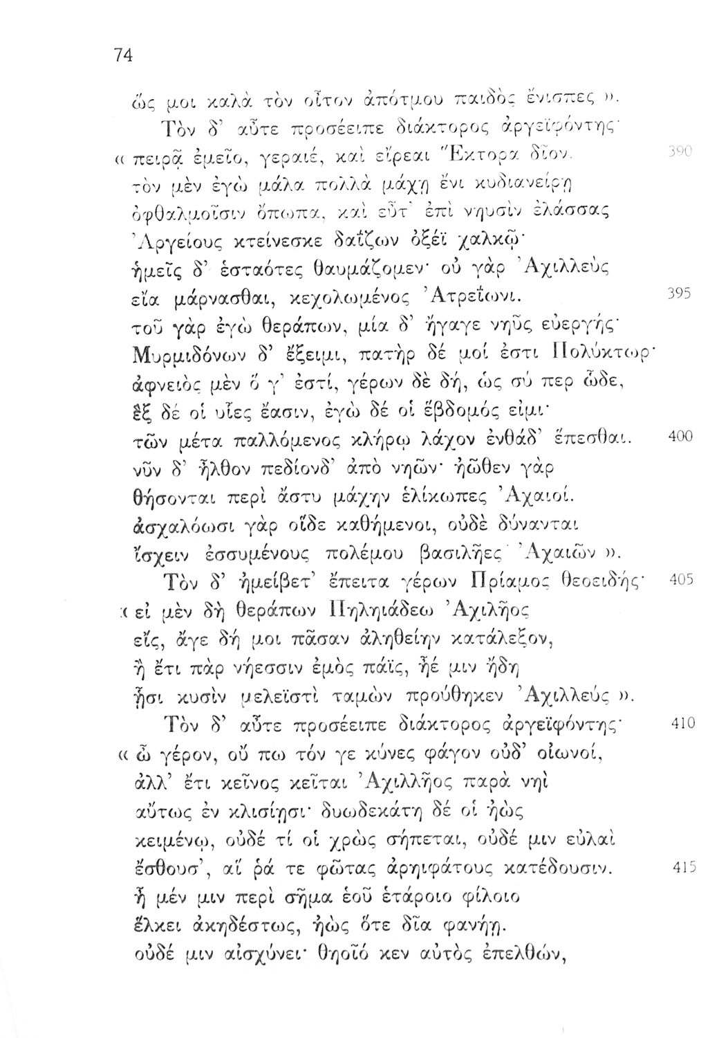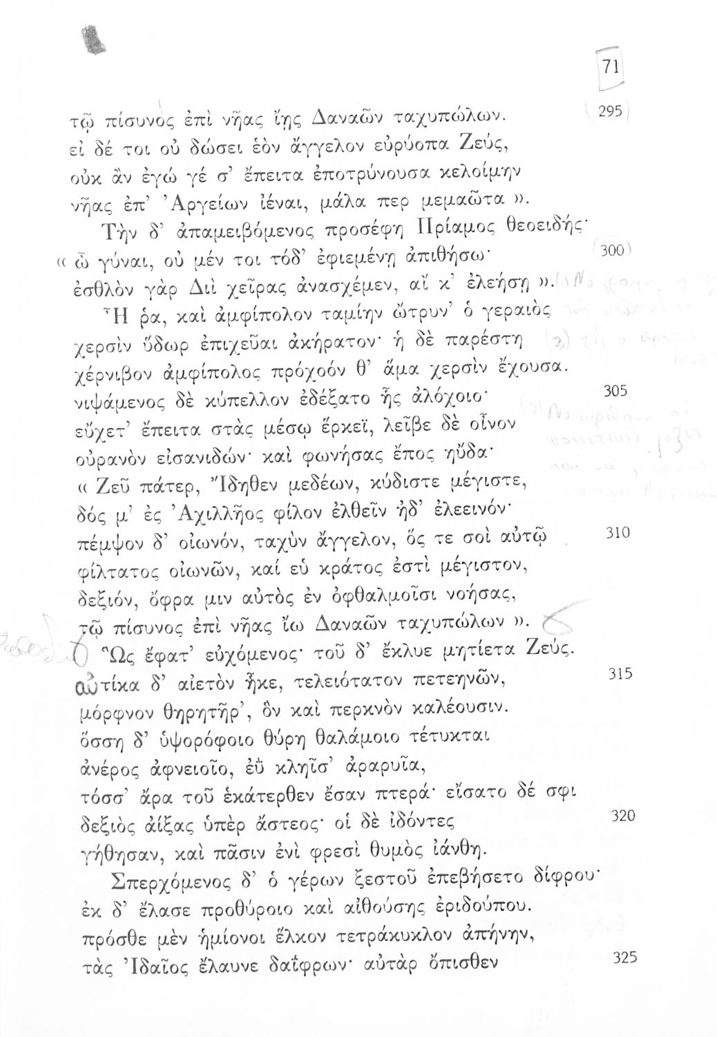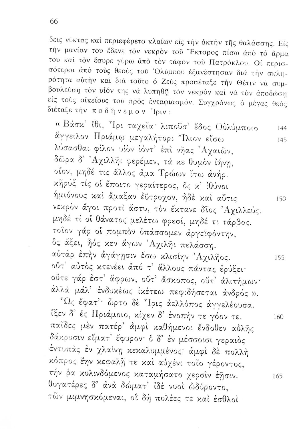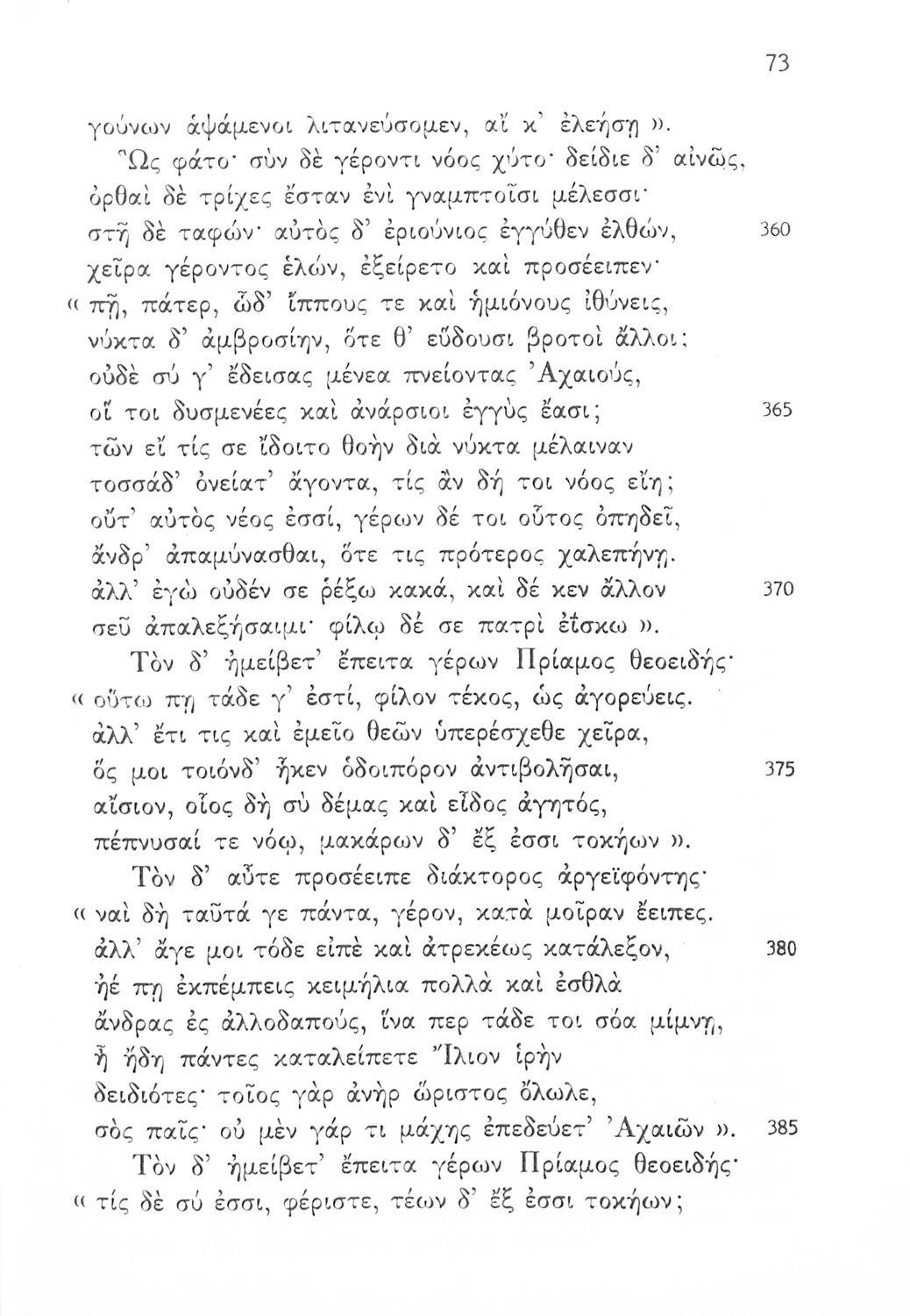 Σχολικό εγχειρίδιο Αρχαίων Ελληνικών των τριών τάξεων του Λυκείου. Το βιβλίο περιέχει αποσπάσματα από το ομηρικό έπος της 'Ιλιάδας'. Το βιβλίο ξεκινάει για την ιστορία του Τρωικού πόλεμου και συνεχίζει με αποσπάσματα από το ίδιο το έργο τα οποία συνοδεύονται από γλωσσικές και ερμηνευτικές σημειώσεις.