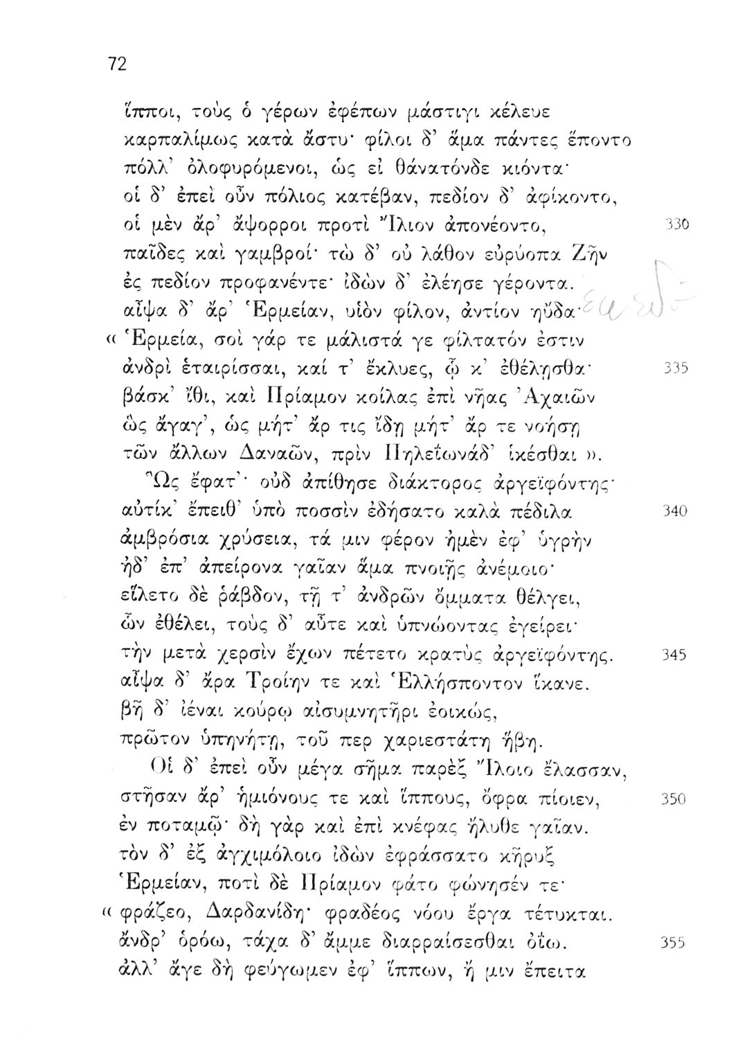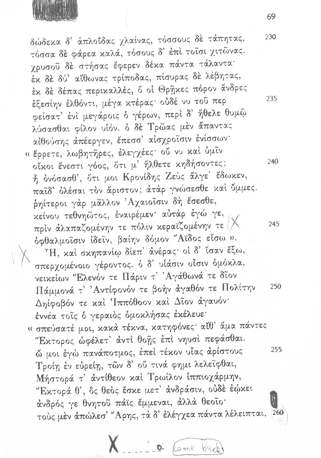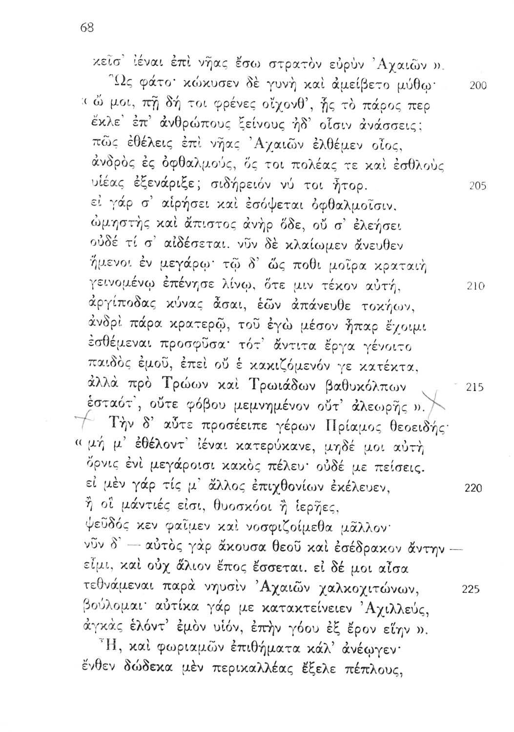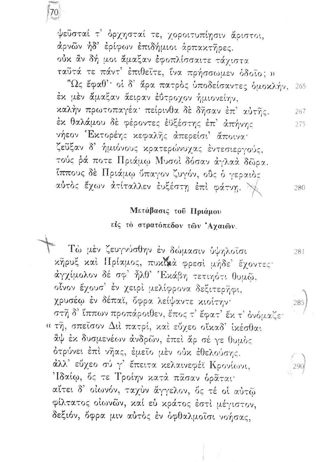 Σχολικό εγχειρίδιο Αρχαίων Ελληνικών των τριών τάξεων του Λυκείου. Το βιβλίο περιέχει αποσπάσματα από το ομηρικό έπος της 'Ιλιάδας'. Το βιβλίο ξεκινάει για την ιστορία του Τρωικού πόλεμου και συνεχίζει με αποσπάσματα από το ίδιο το έργο τα οποία συνοδεύονται από γλωσσικές και ερμηνευτικές σημειώσεις.