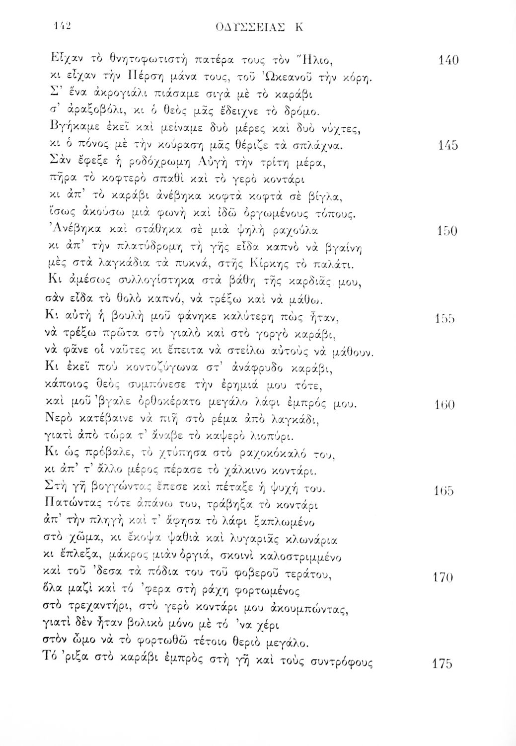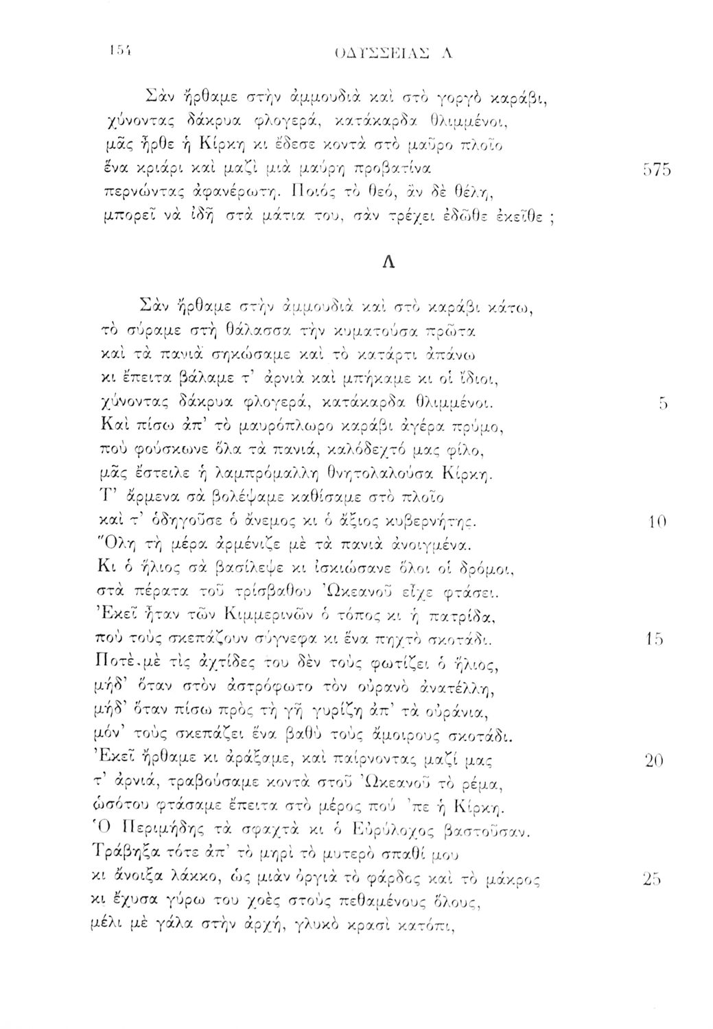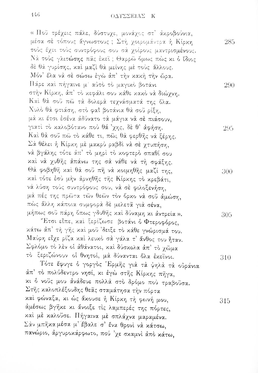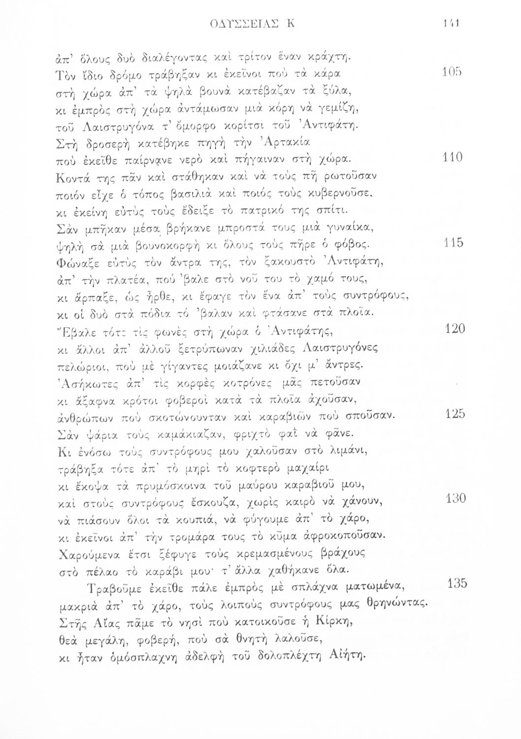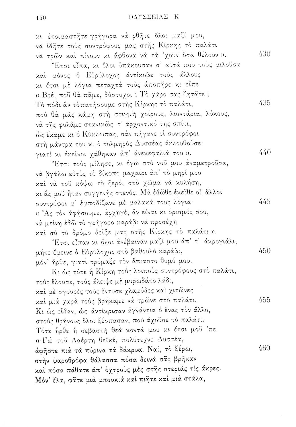 Σχολικό εγχειρίδιο της Δευτεροβάθμιας Εκπαίδευσης για το μάθημα των Αρχαίων Ελληνικών. Πρόκειται για το κείμενο της Οδύσσειας μεταφρασμένο, με πραγματολογικές παρατηρήσεις. Στο τέλος περιλαμβάνει λεξιλόγιο.