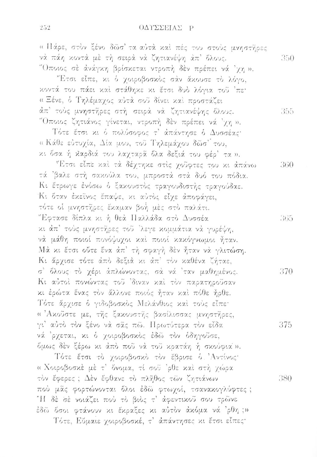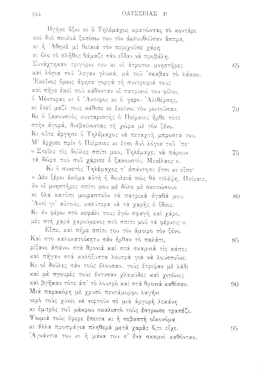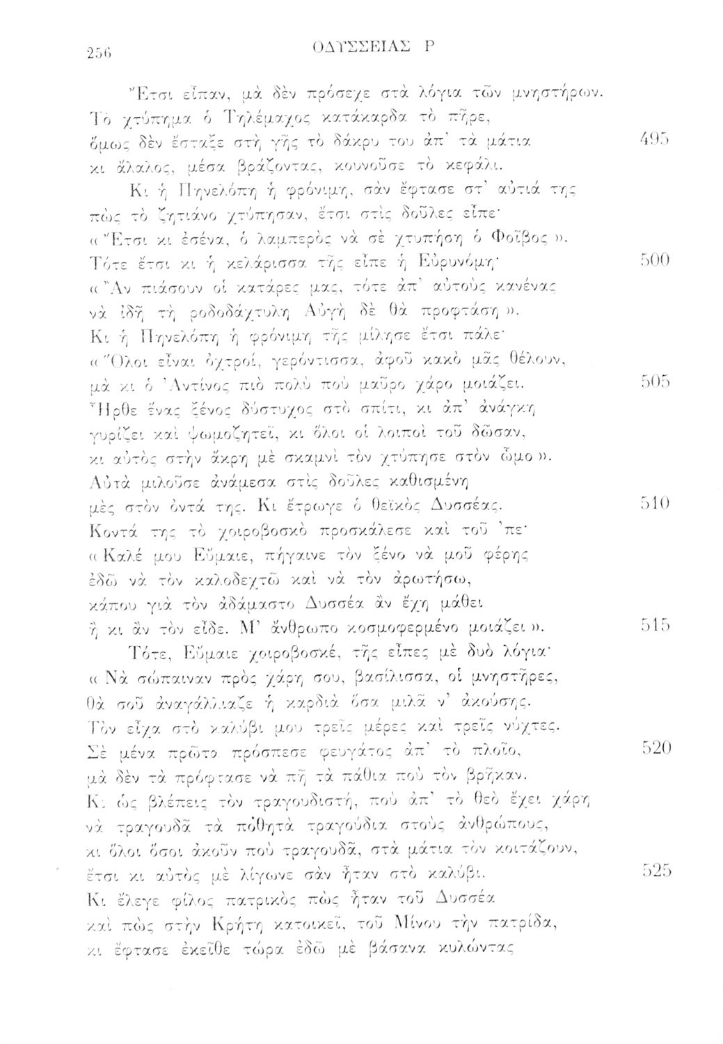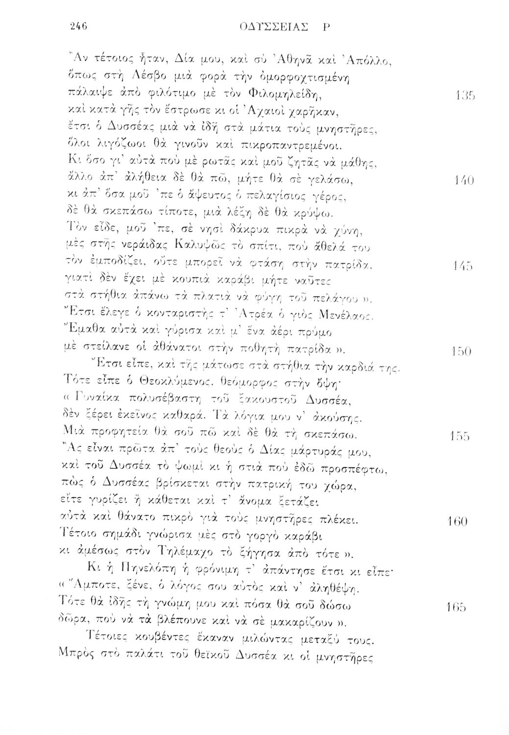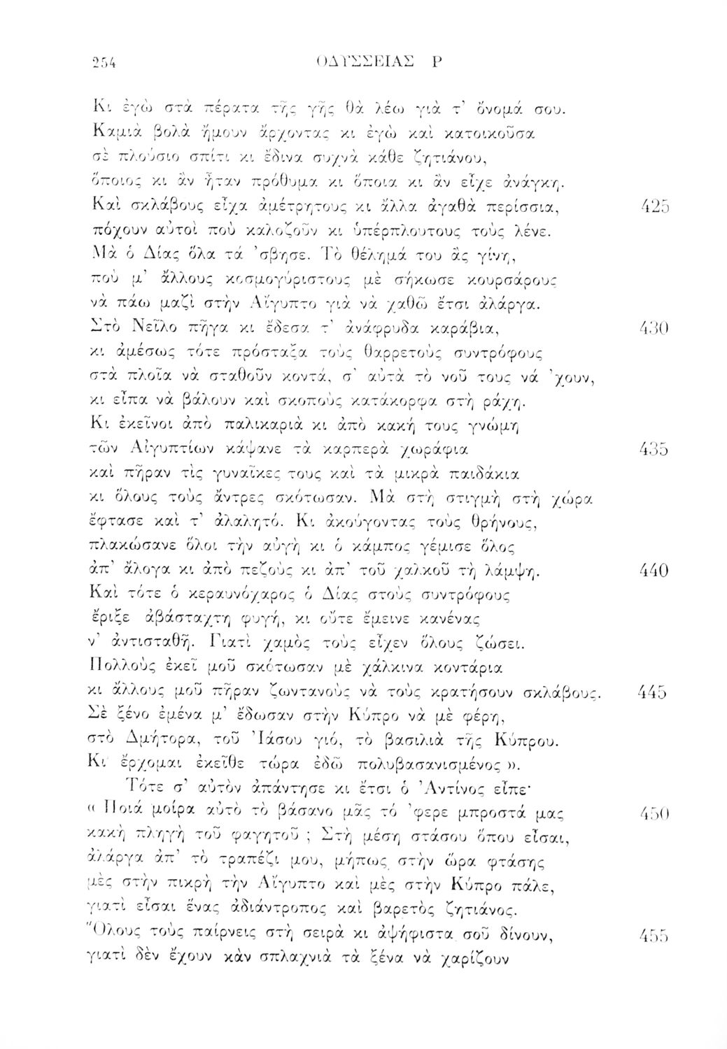 Σχολικό εγχειρίδιο της Δευτεροβάθμιας Εκπαίδευσης για το μάθημα των Αρχαίων Ελληνικών. Πρόκειται για το κείμενο της Οδύσσειας μεταφρασμένο, με πραγματολογικές παρατηρήσεις. Στο τέλος περιλαμβάνει λεξιλόγιο.