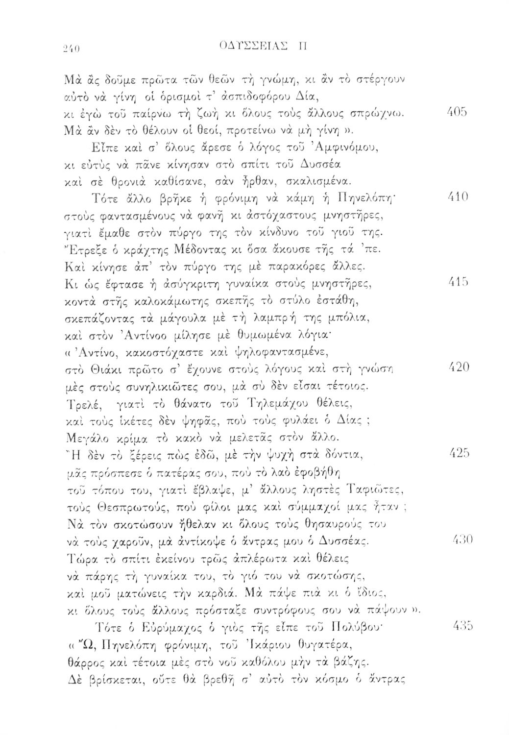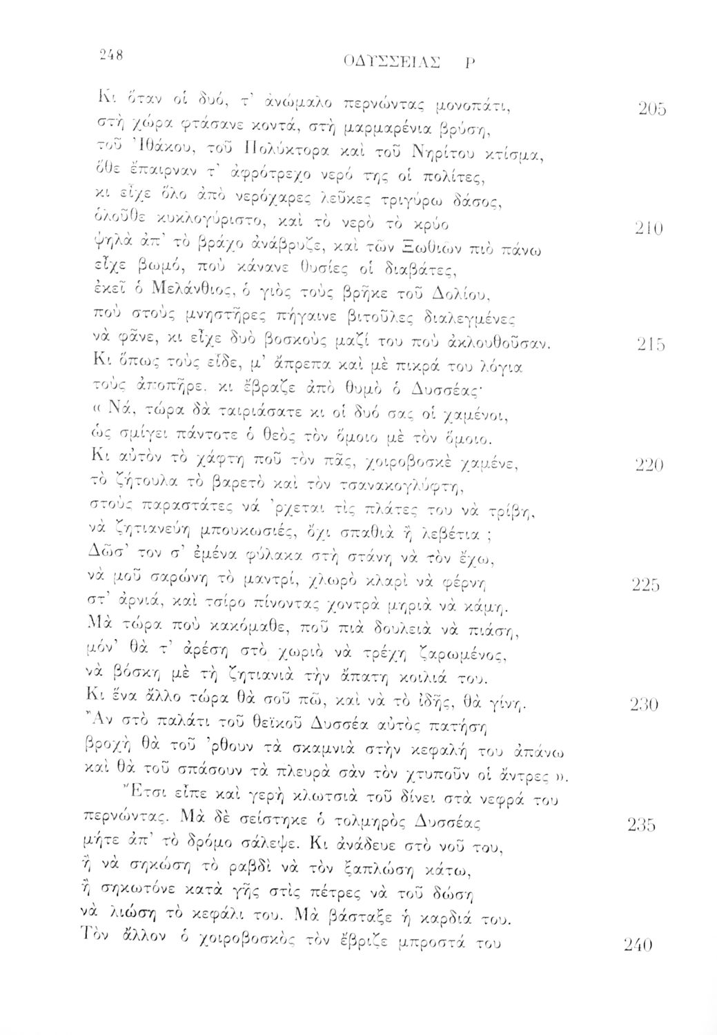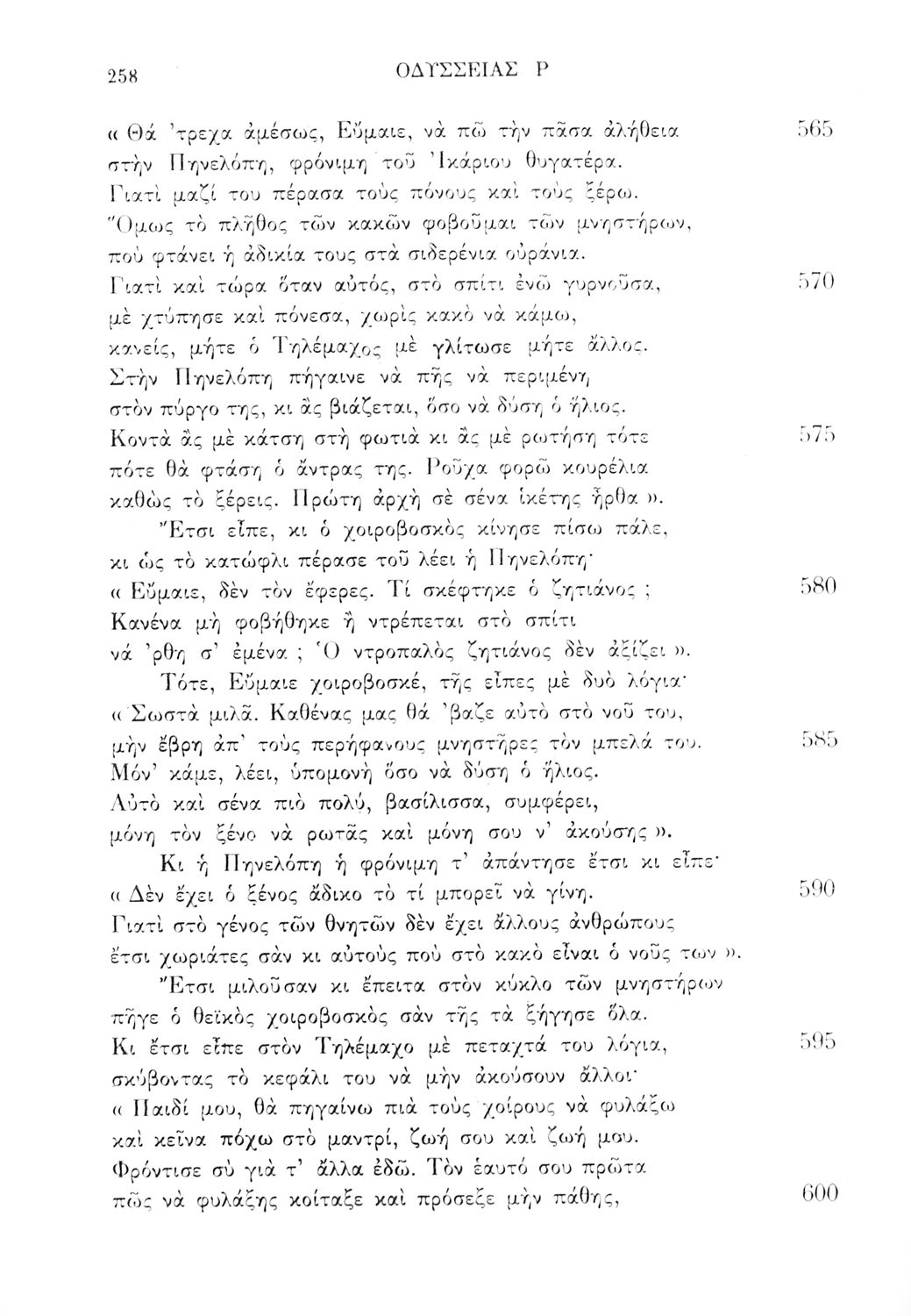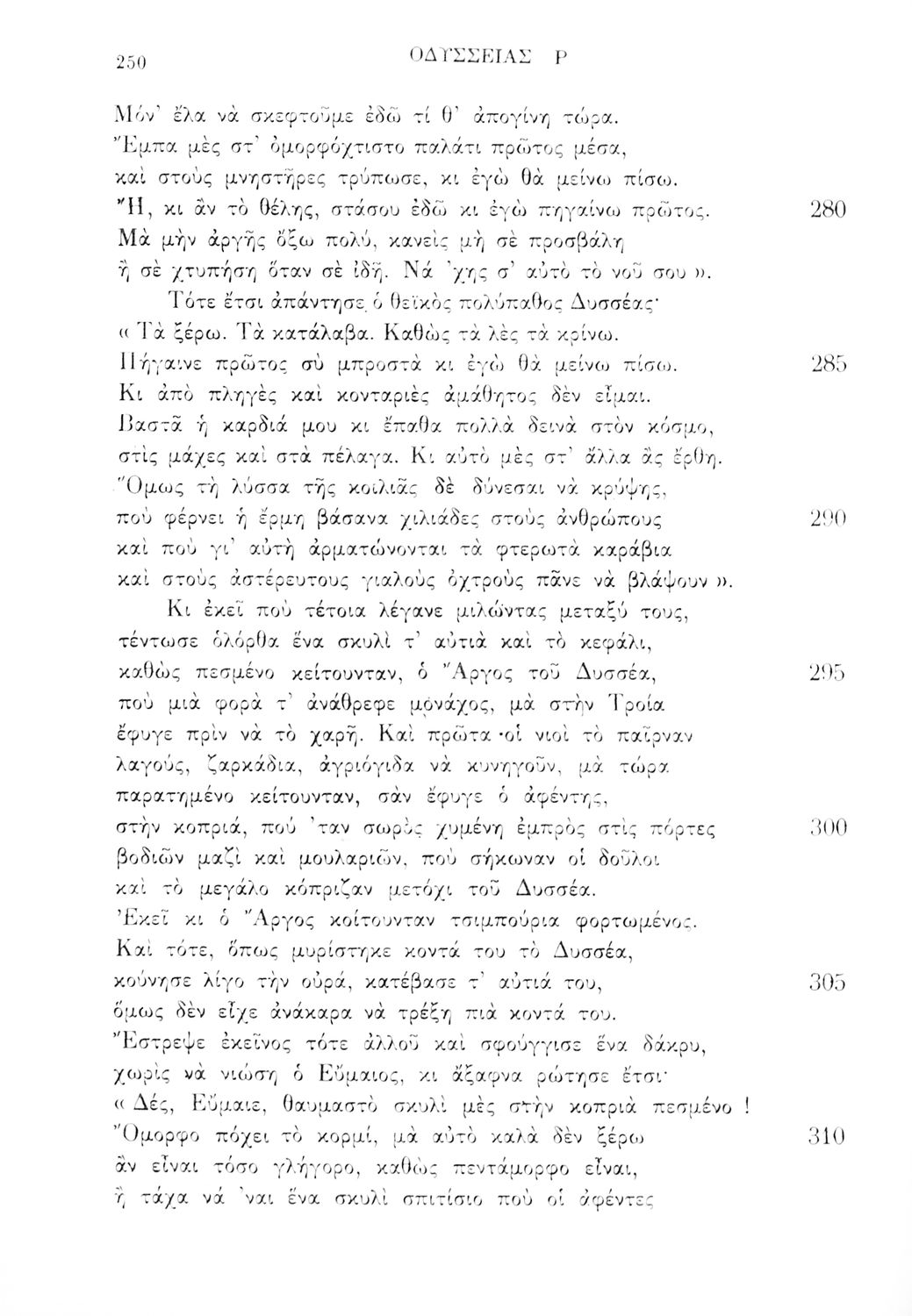 Σχολικό εγχειρίδιο της Δευτεροβάθμιας Εκπαίδευσης για το μάθημα των Αρχαίων Ελληνικών. Πρόκειται για το κείμενο της Οδύσσειας μεταφρασμένο, με πραγματολογικές παρατηρήσεις. Στο τέλος περιλαμβάνει λεξιλόγιο.