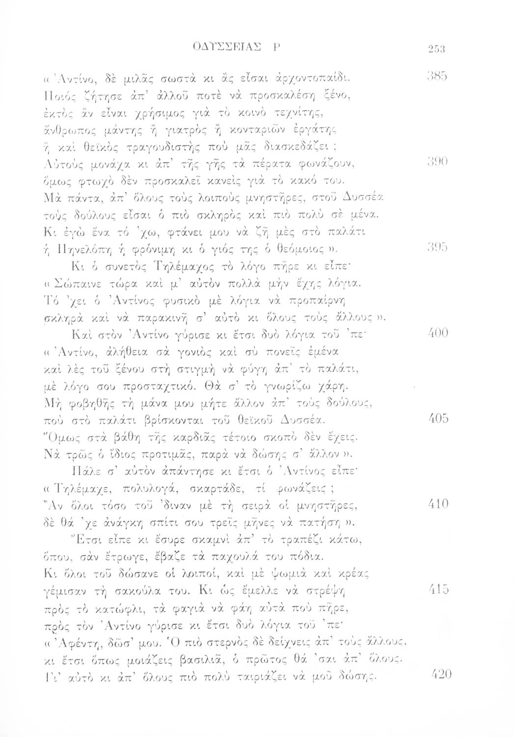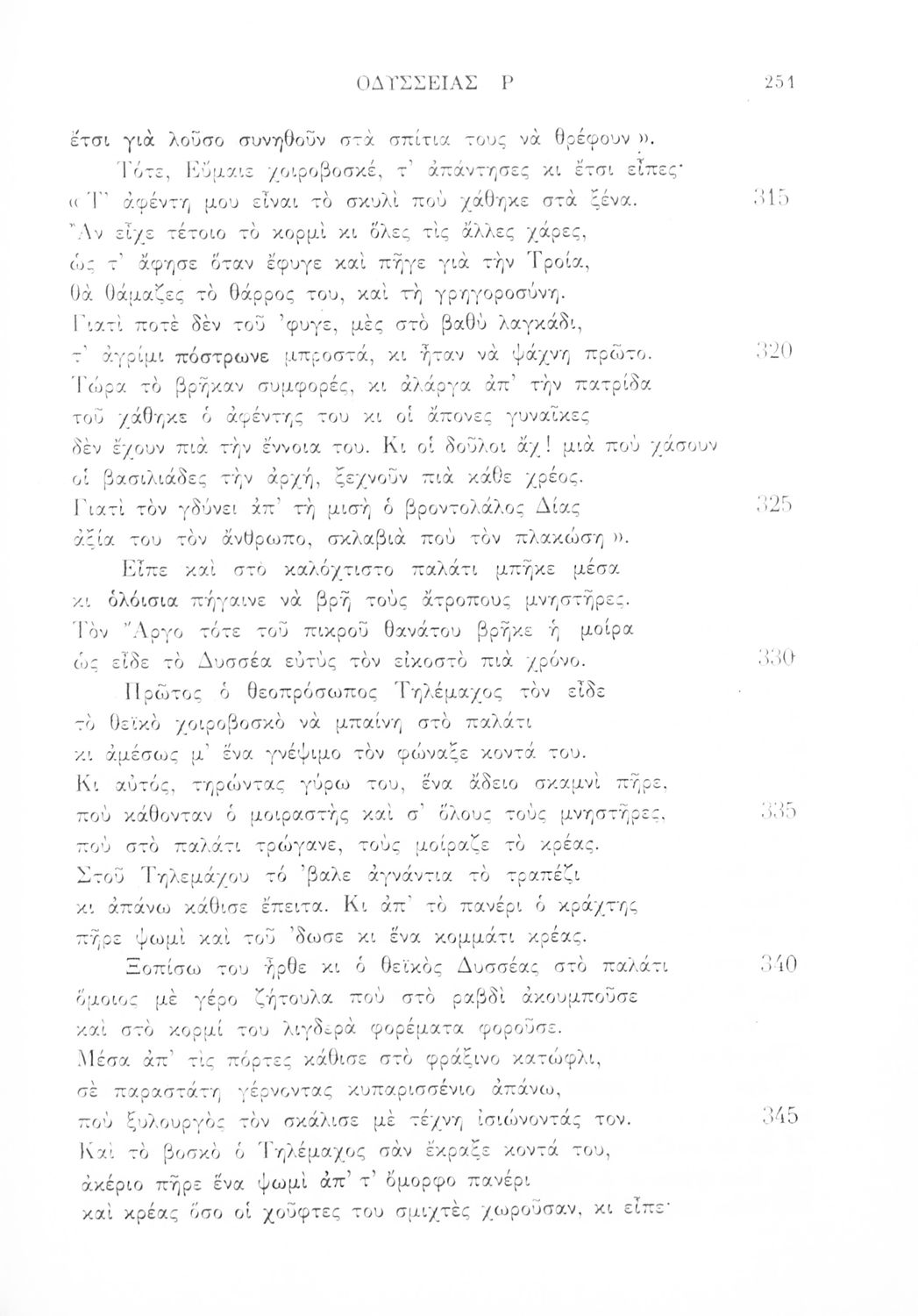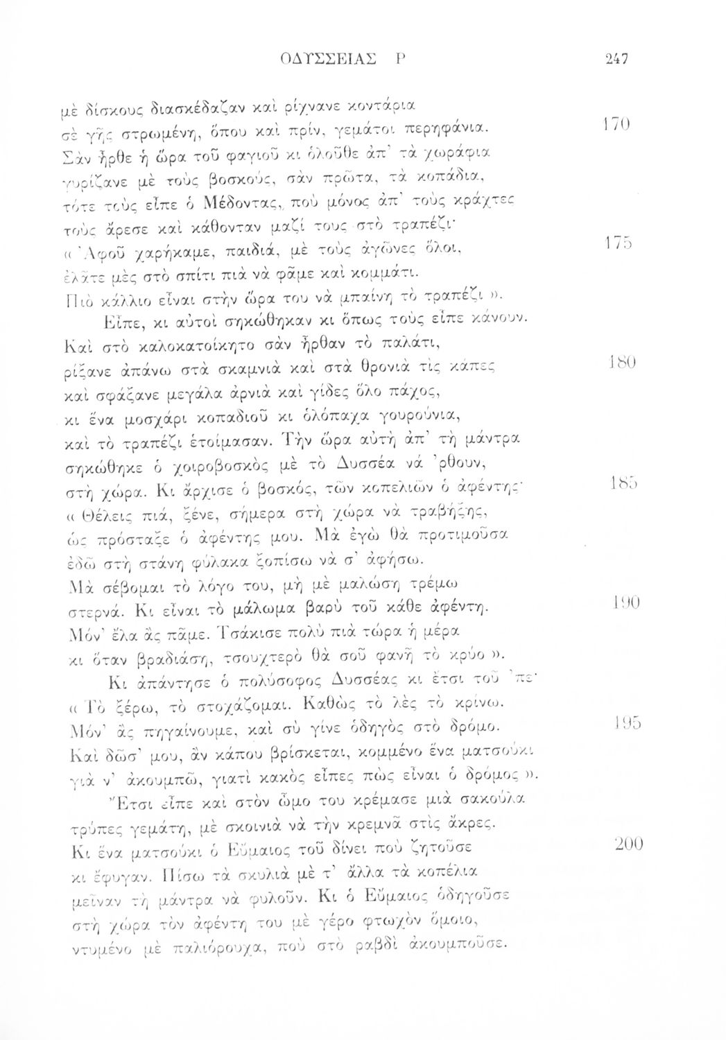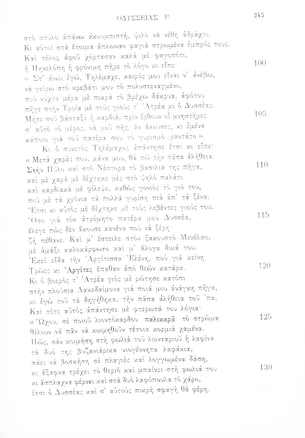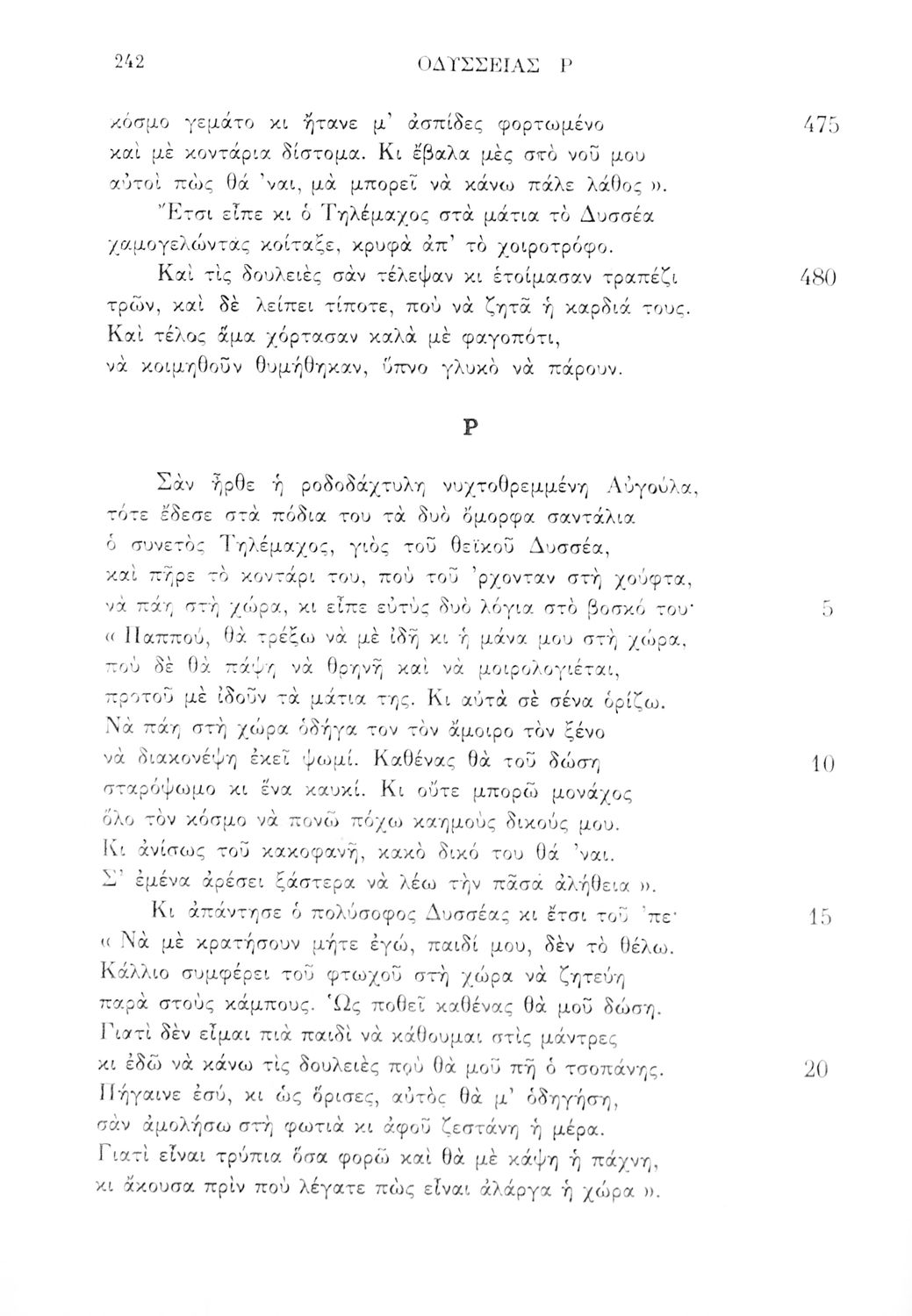 Σχολικό εγχειρίδιο της Δευτεροβάθμιας Εκπαίδευσης για το μάθημα των Αρχαίων Ελληνικών. Πρόκειται για το κείμενο της Οδύσσειας μεταφρασμένο, με πραγματολογικές παρατηρήσεις. Στο τέλος περιλαμβάνει λεξιλόγιο.