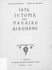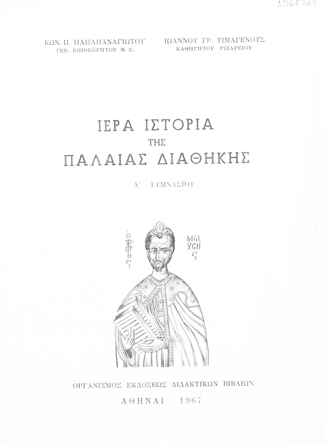 Κωδικός αναγνώρισης: 02-00655 Τίτλος: Ιερά ιστορία της Παλαιάς Διαθήκης Α΄ Γυμνασίου Συγγραφέας: Κων. Π. Παπαπαναγιώτου, Ιωάννης Γρ. Τιμαγένης Εικονογράφος: Τάσος Χατζής Μέγεθος και υπόστρωμα: Σχολικό εγχειρίδιο, μαλακό εξώφυλλο, 167 σελίδες. Σκίτσα (ασπρόμαυρα), εικόνες (ασπρόμαυρες). |