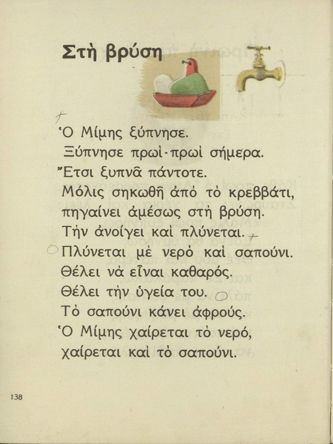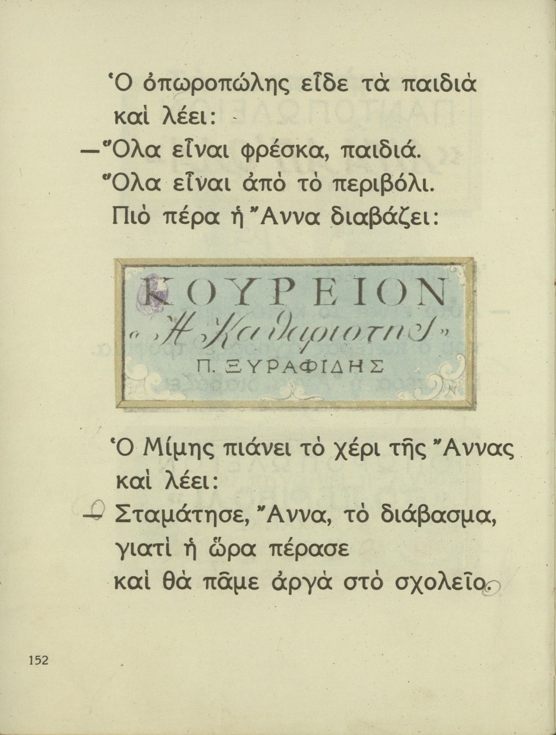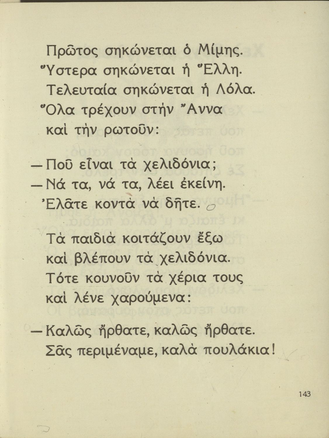 Αναγνωστικό Α΄ Δημοτικού που περιέχει γράμματα, συλλαβές, λέξεις, προτάσεις, κείμενα και ποιήματα για την εκμάθηση της Γλώσσας. Τα θέματα βασίζονται στην θρησκευτική, εθνική, οικογενειακή, κοινωνική, καθημερινή ζωή του τόπου. Ήρωες του βιβλίου ο Μίμης και η Άννα.