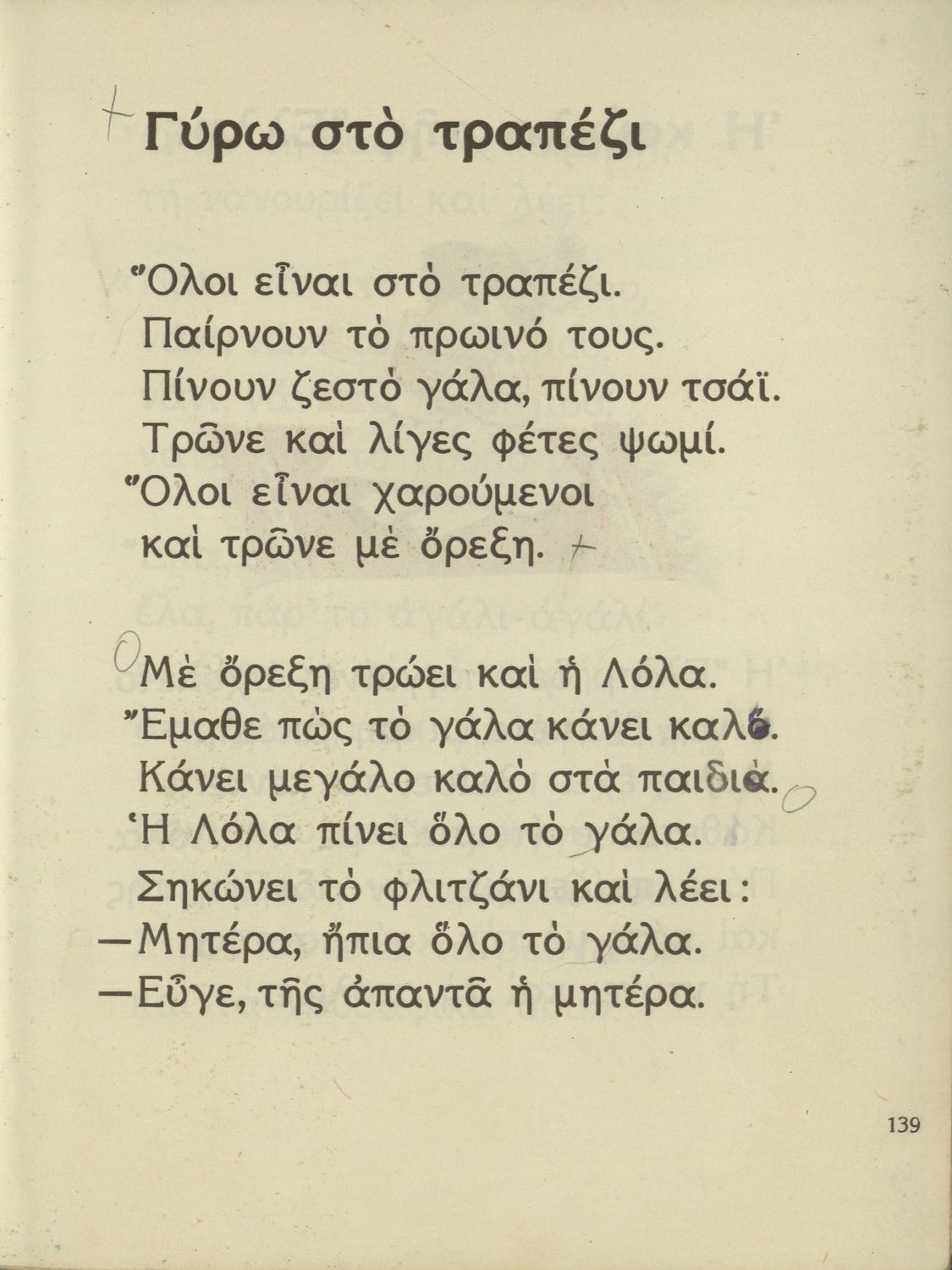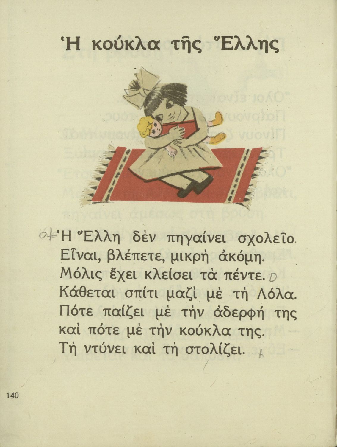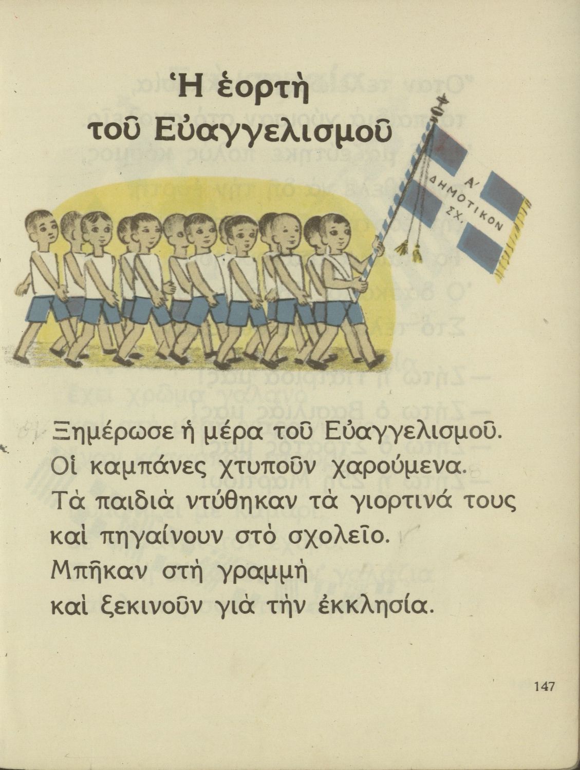 Αναγνωστικό Α΄ Δημοτικού που περιέχει γράμματα, συλλαβές, λέξεις, προτάσεις και κείμενα εμπνευσμένα από την οικογενειακή και κοινωνική ζωή του τόπου. Φέρει το σύμβολο της δικτατορίας.