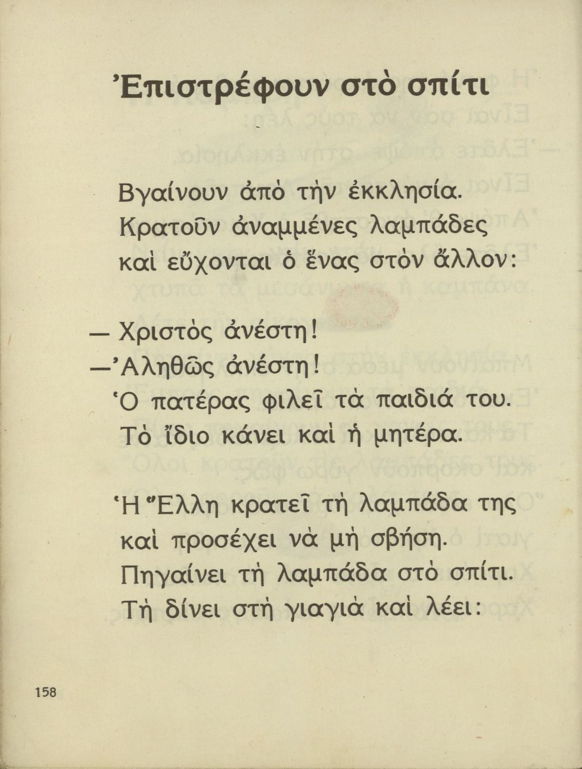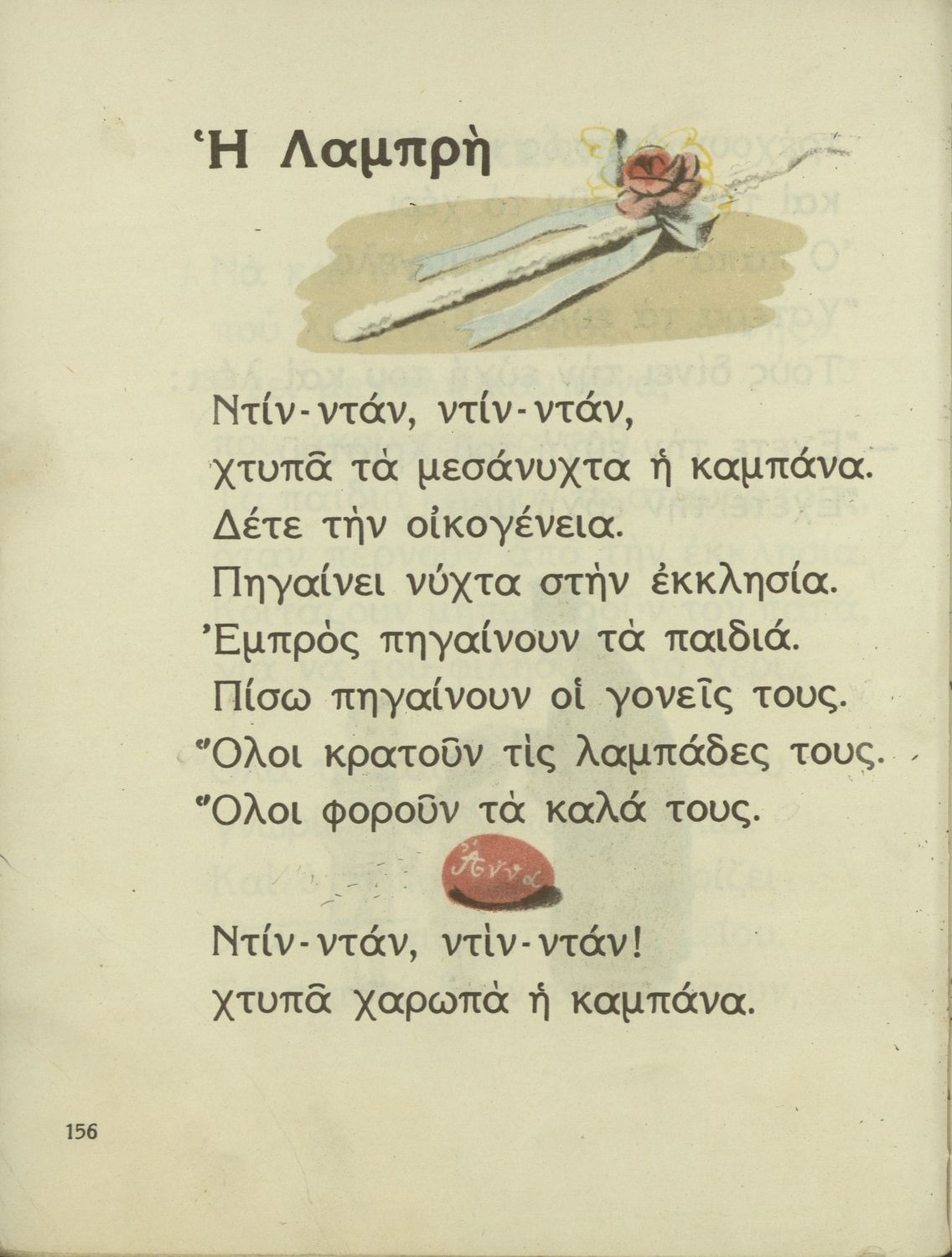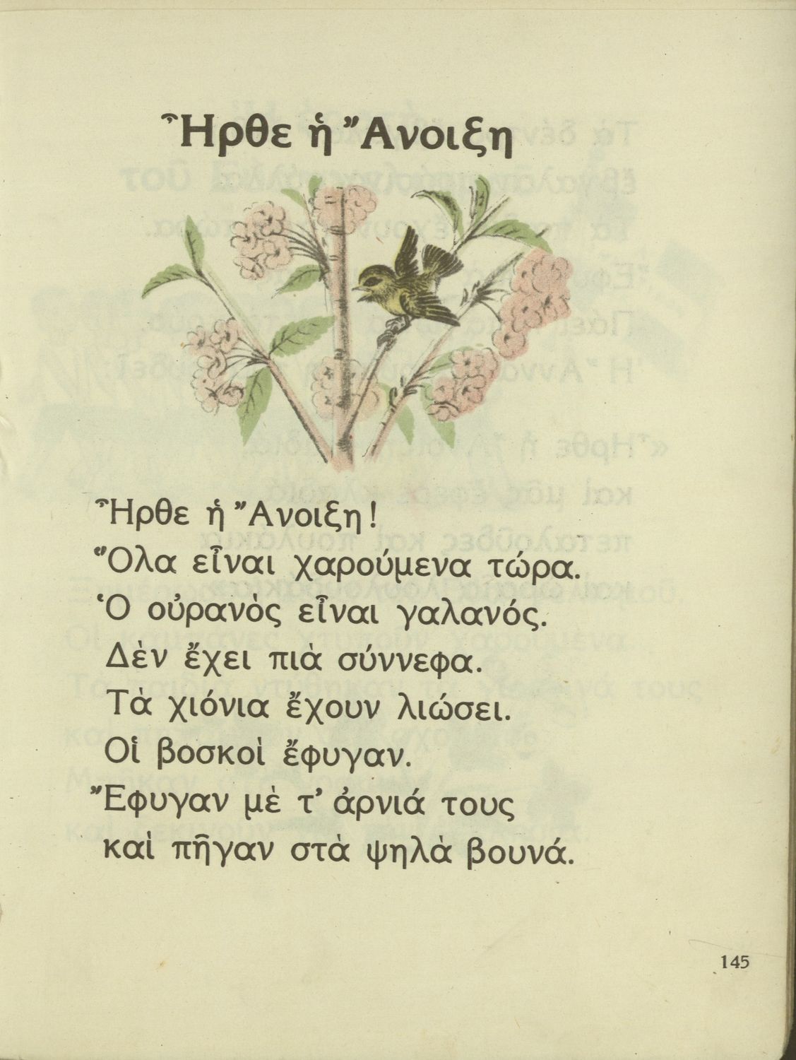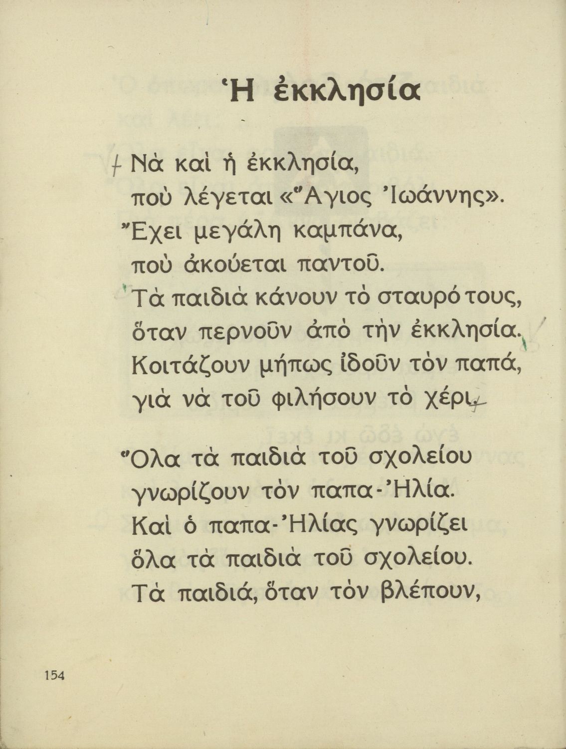 Αναγνωστικό Α΄ Δημοτικού που περιέχει γράμματα, συλλαβές, λέξεις, προτάσεις και κείμενα εμπνευσμένα από την οικογενειακή και κοινωνική ζωή του τόπου. Φέρει το σύμβολο της δικτατορίας.