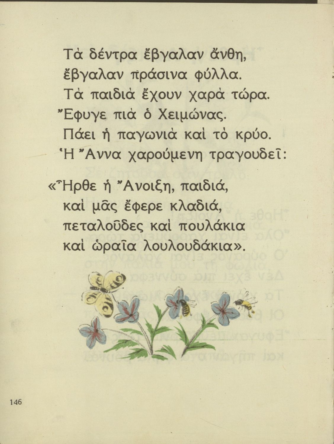 Αναγνωστικό Α΄ Δημοτικού που περιέχει ποιήματα και πεζά με σκηνές και προκρίνει τις αξίες της καλοσύνης, της υπευθυνότητας, της εργατικότητας, της αγάπης προς τα ζώα, αλλά και της διασκέδασης.