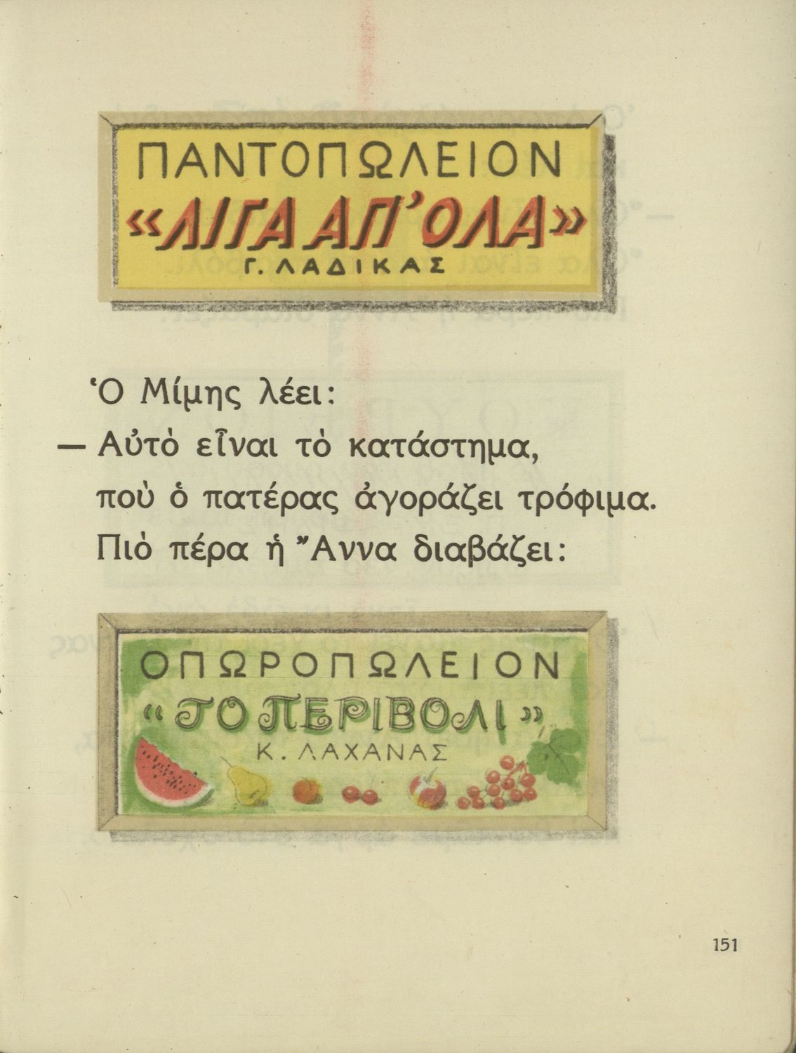 Παρουσίαση περιεχομένου: Αναγνωστικό Α΄ Δημοτικού που περιέχει γράμματα, συλλαβές, λέξεις, προτάσεις, κείμενα και ποιήματα για την εκμάθηση της Γλώσσας. Τα θέματα βασίζονται στην θρησκευτική, εθνική, οικογενειακή, κοινωνική, καθημερινή ζωή του τόπου. Ήρωες του βιβλίου ο Μίμης και η Άννα.