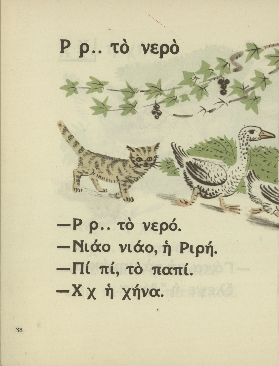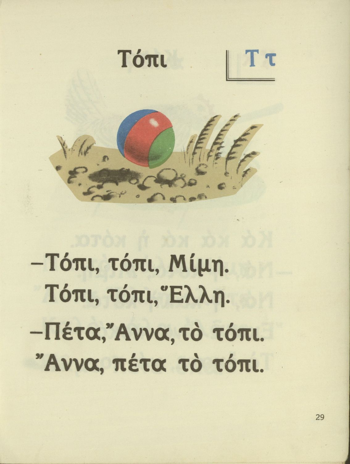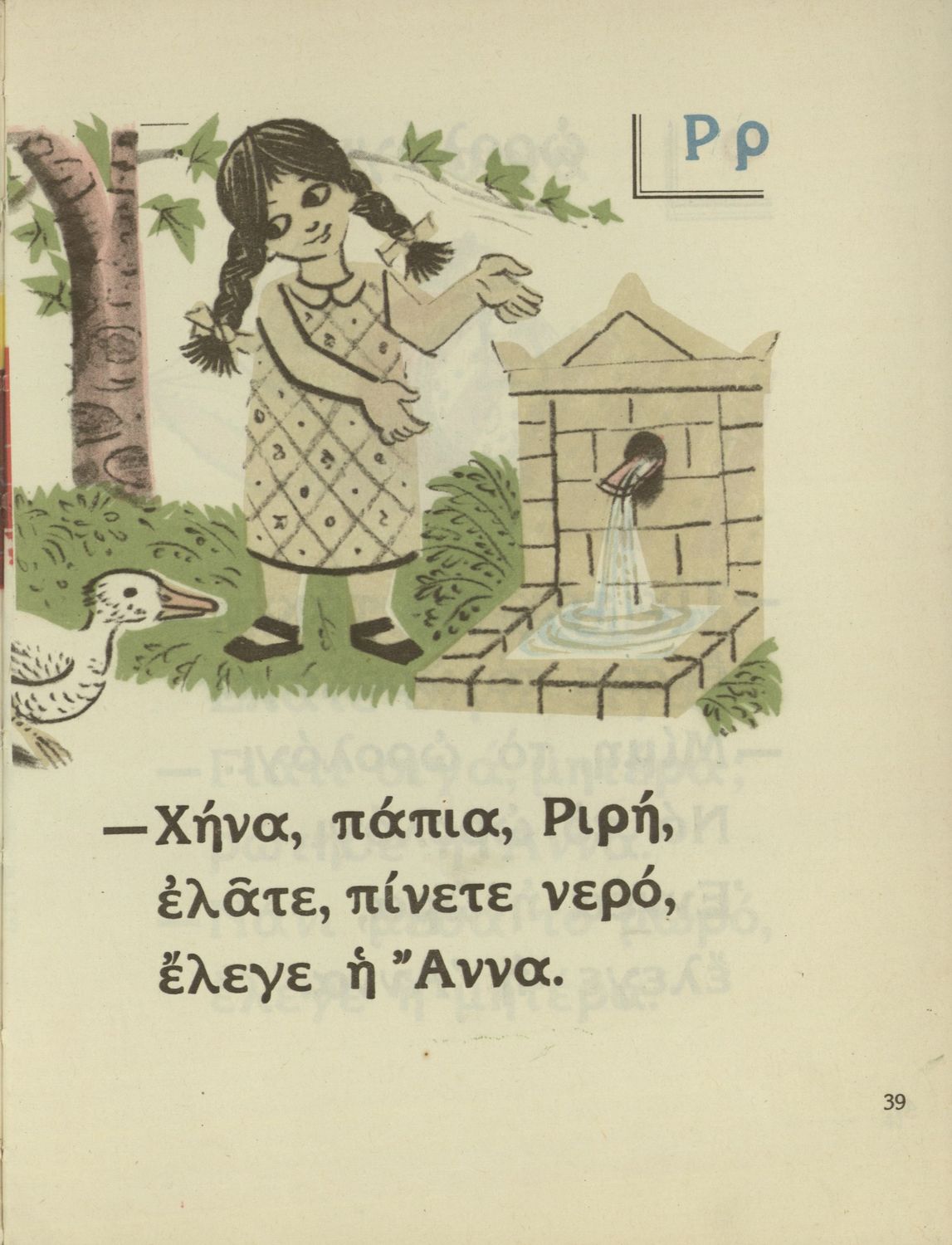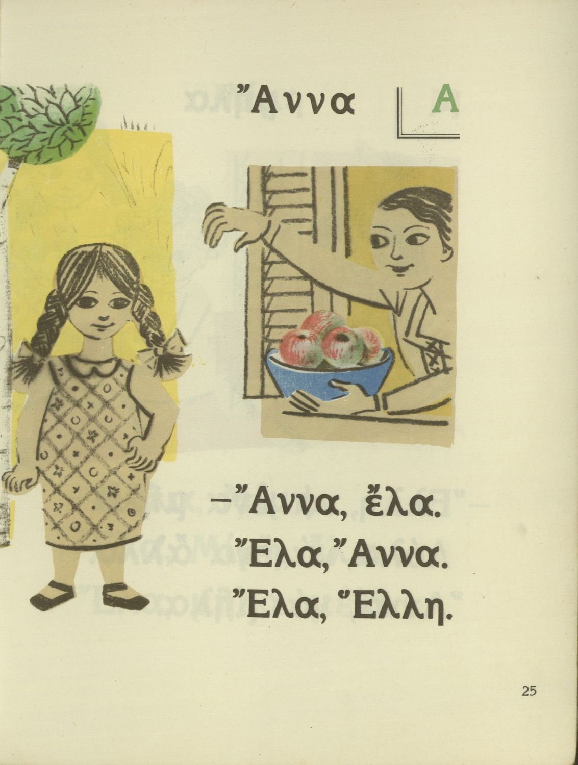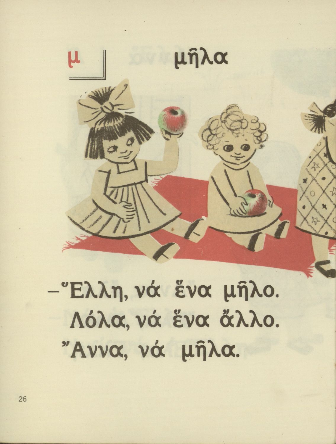 Αναγνωστικό Α΄ Δημοτικού που περιέχει γράμματα, συλλαβές, λέξεις, προτάσεις και κείμενα εμπνευσμένα από την οικογενειακή και κοινωνική ζωή του τόπου. Φέρει το σύμβολο της δικτατορίας.