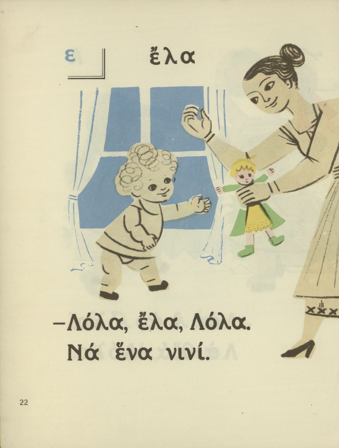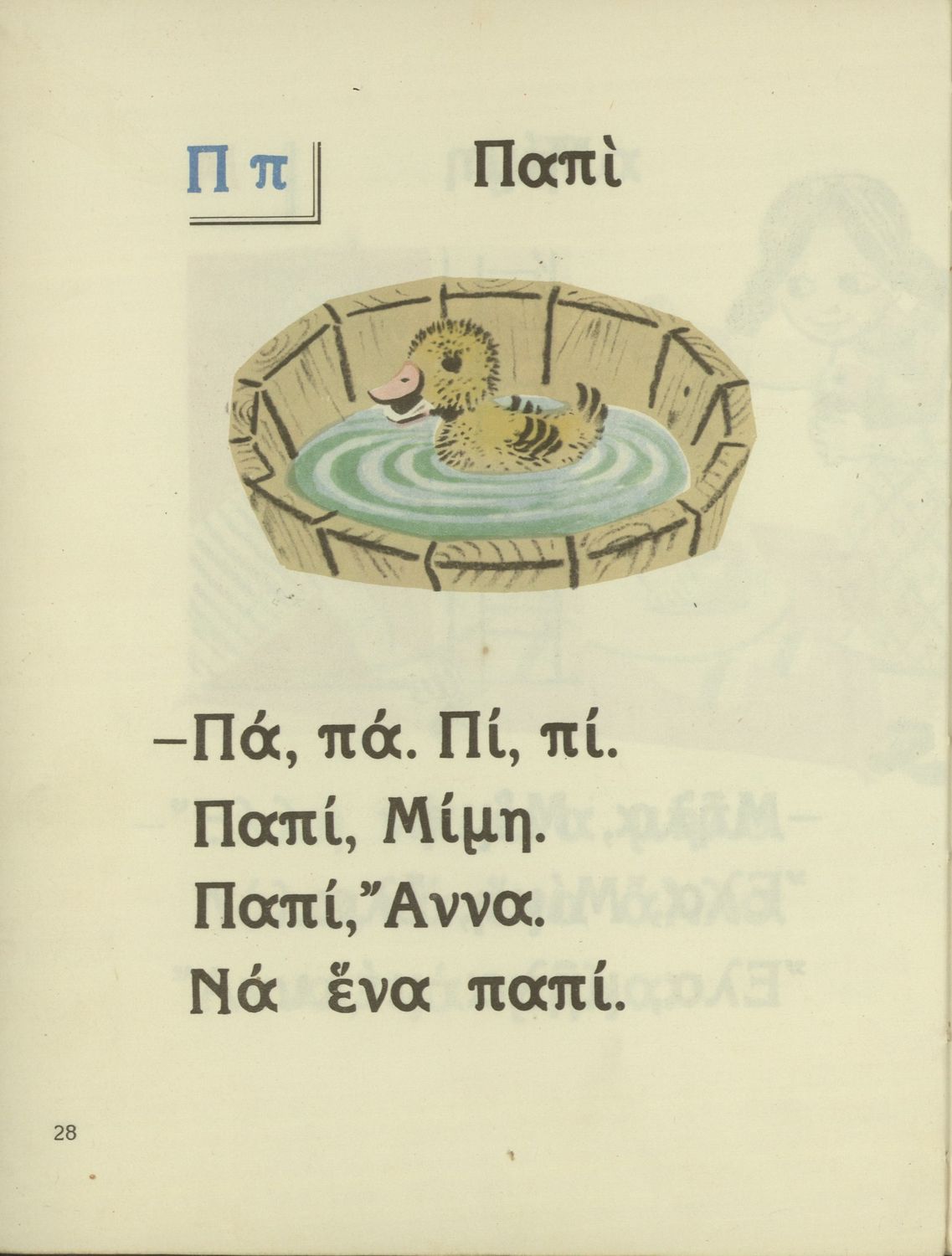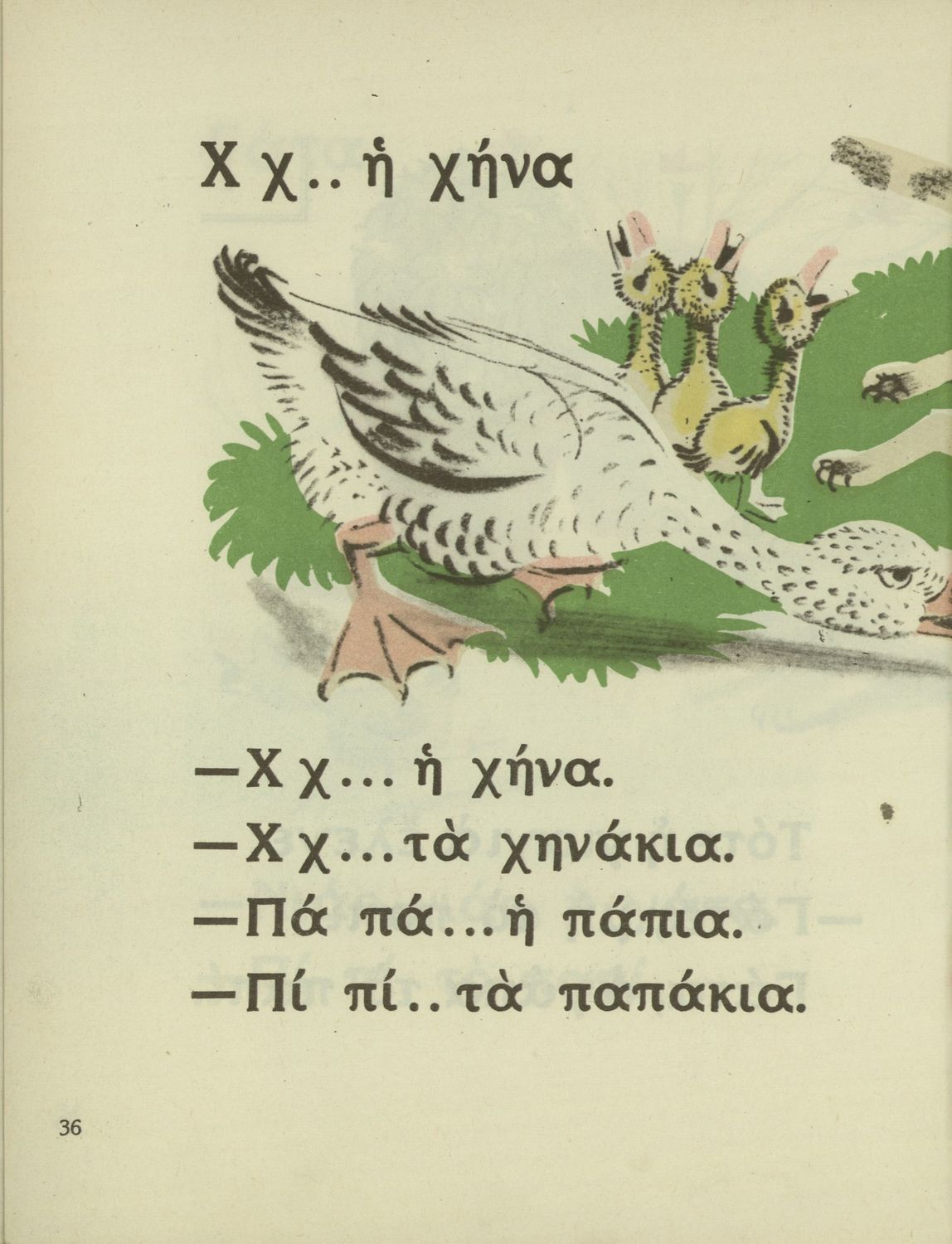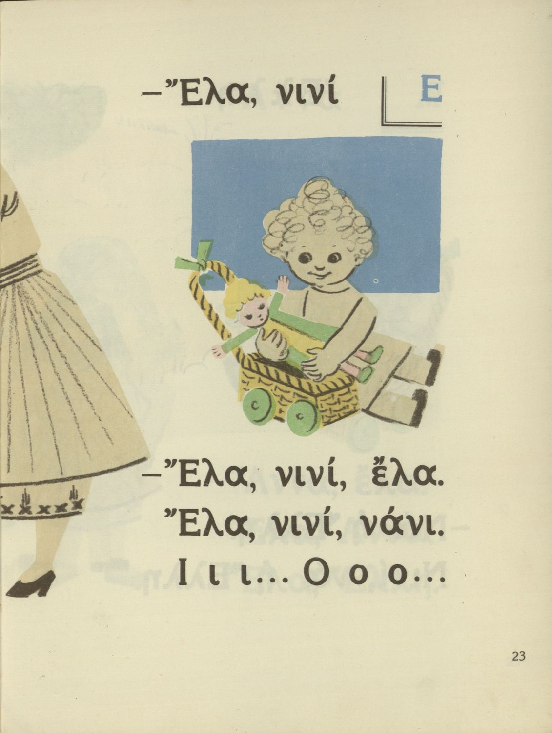 Αναγνωστικό Α΄ Δημοτικού που περιέχει γράμματα, συλλαβές, λέξεις, προτάσεις και κείμενα εμπνευσμένα από την οικογενειακή και κοινωνική ζωή του τόπου. Φέρει το σύμβολο της δικτατορίας.