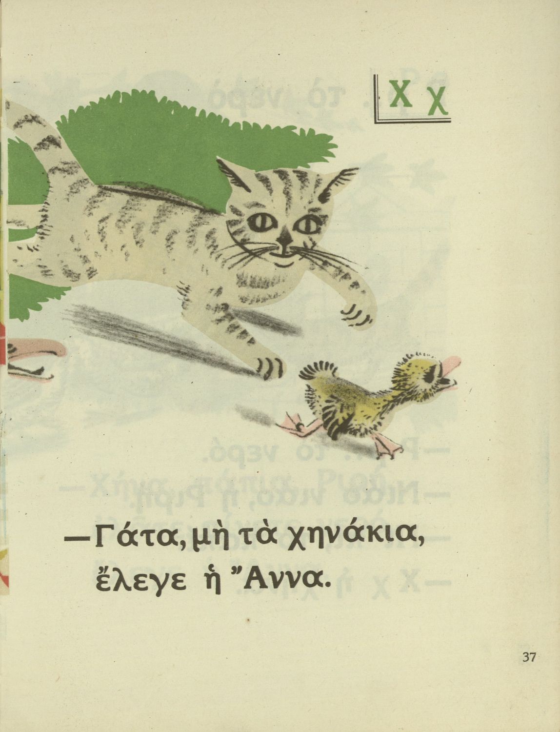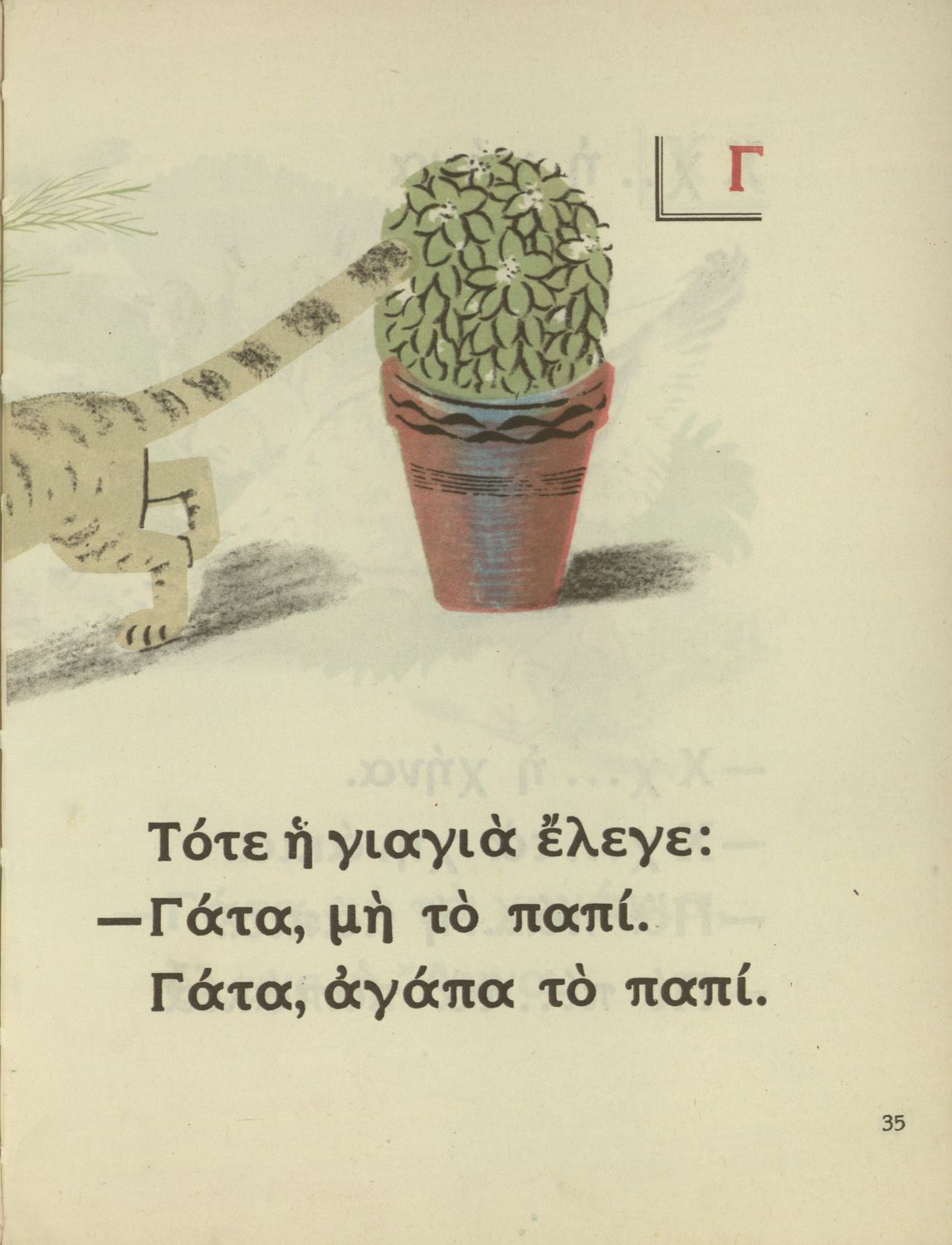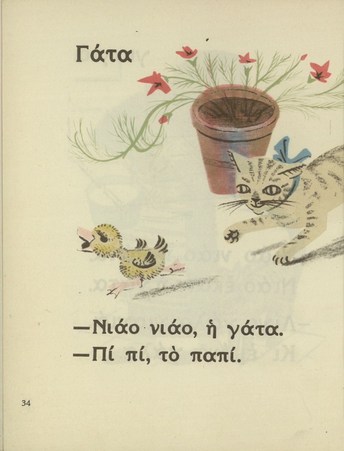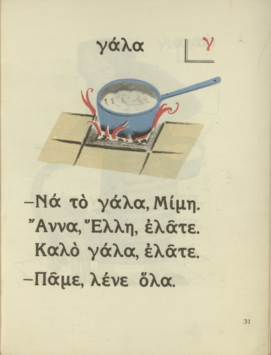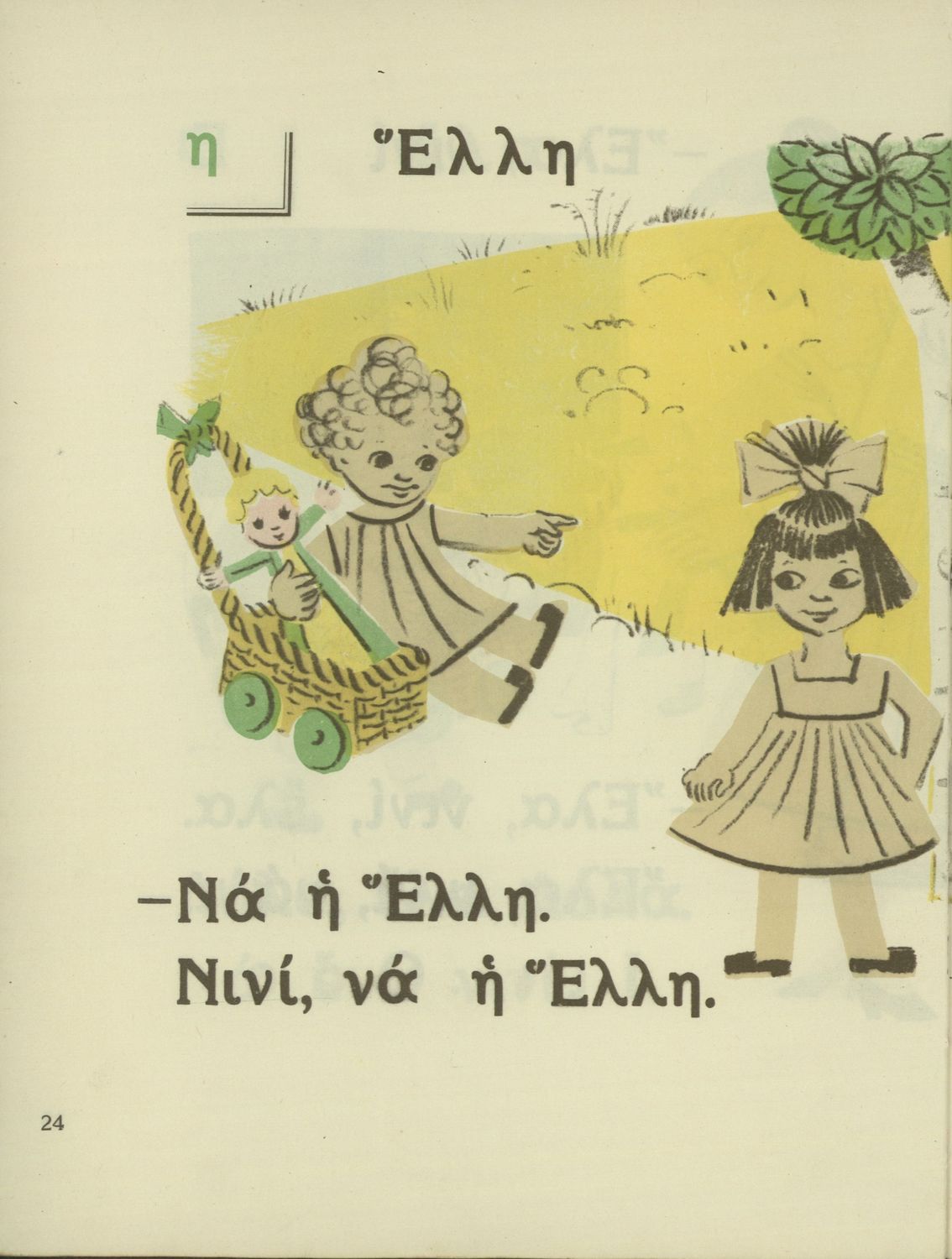 Αναγνωστικό Α΄ Δημοτικού που περιέχει γράμματα, συλλαβές, λέξεις, προτάσεις και κείμενα εμπνευσμένα από την οικογενειακή και κοινωνική ζωή του τόπου. Φέρει το σύμβολο της δικτατορίας.