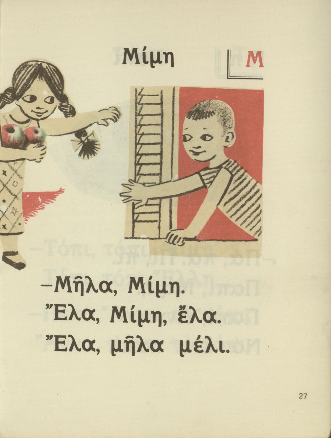 Παρουσίαση περιεχομένου: Αναγνωστικό Α΄ Δημοτικού που περιέχει γράμματα, συλλαβές, λέξεις, προτάσεις, κείμενα και ποιήματα για την εκμάθηση της Γλώσσας. Τα θέματα βασίζονται στην θρησκευτική, εθνική, οικογενειακή, κοινωνική, καθημερινή ζωή του τόπου. Ήρωες του βιβλίου ο Μίμης και η Άννα.