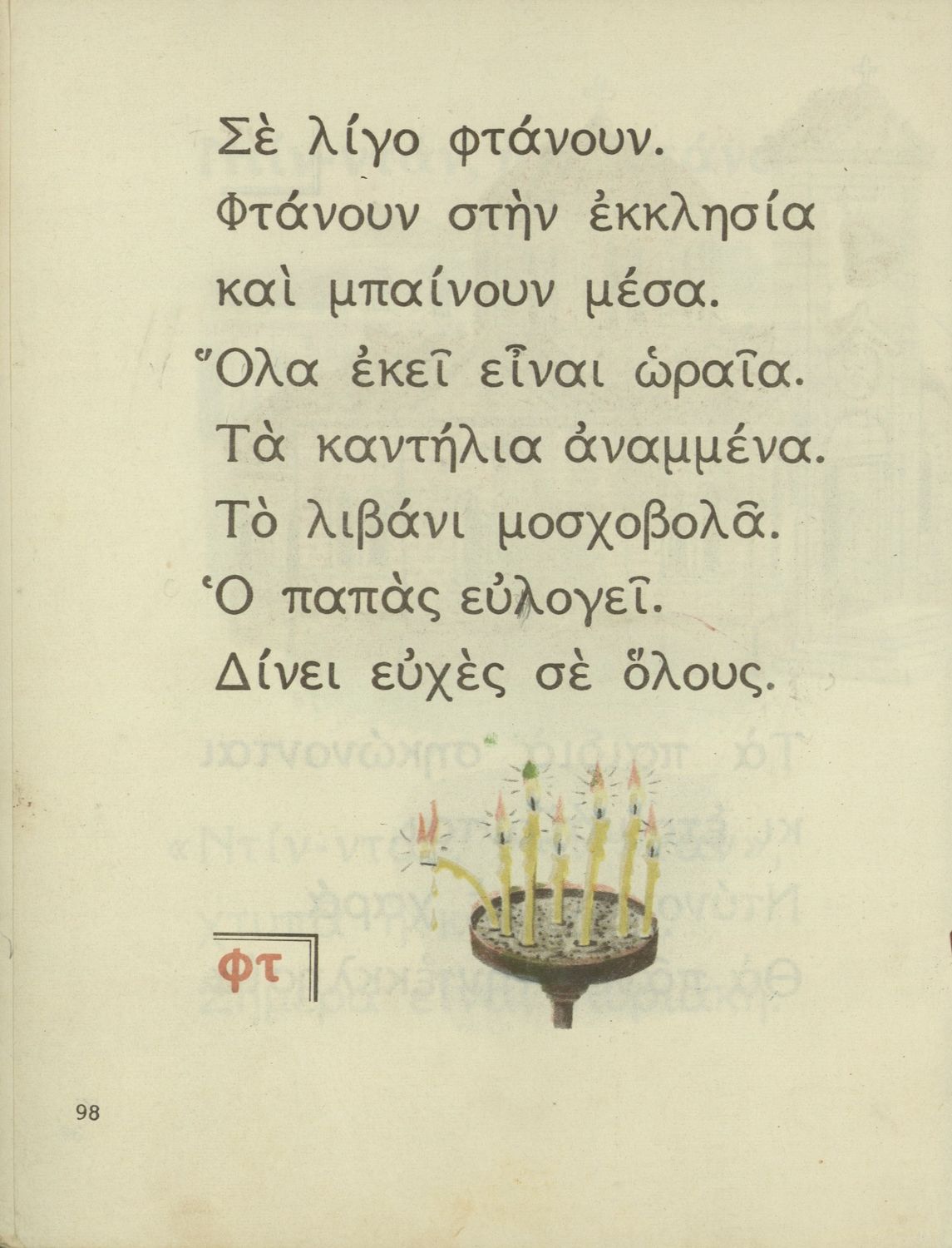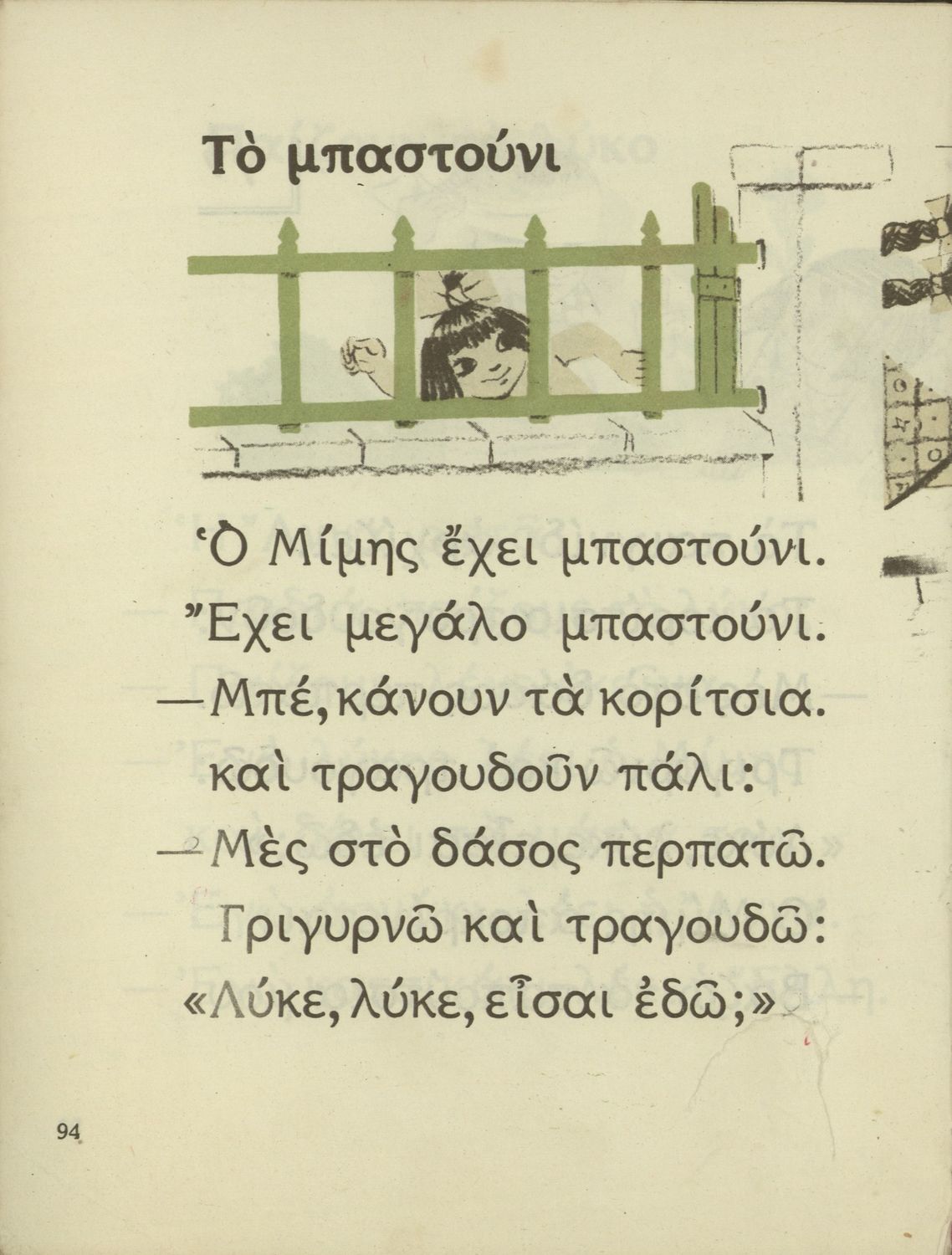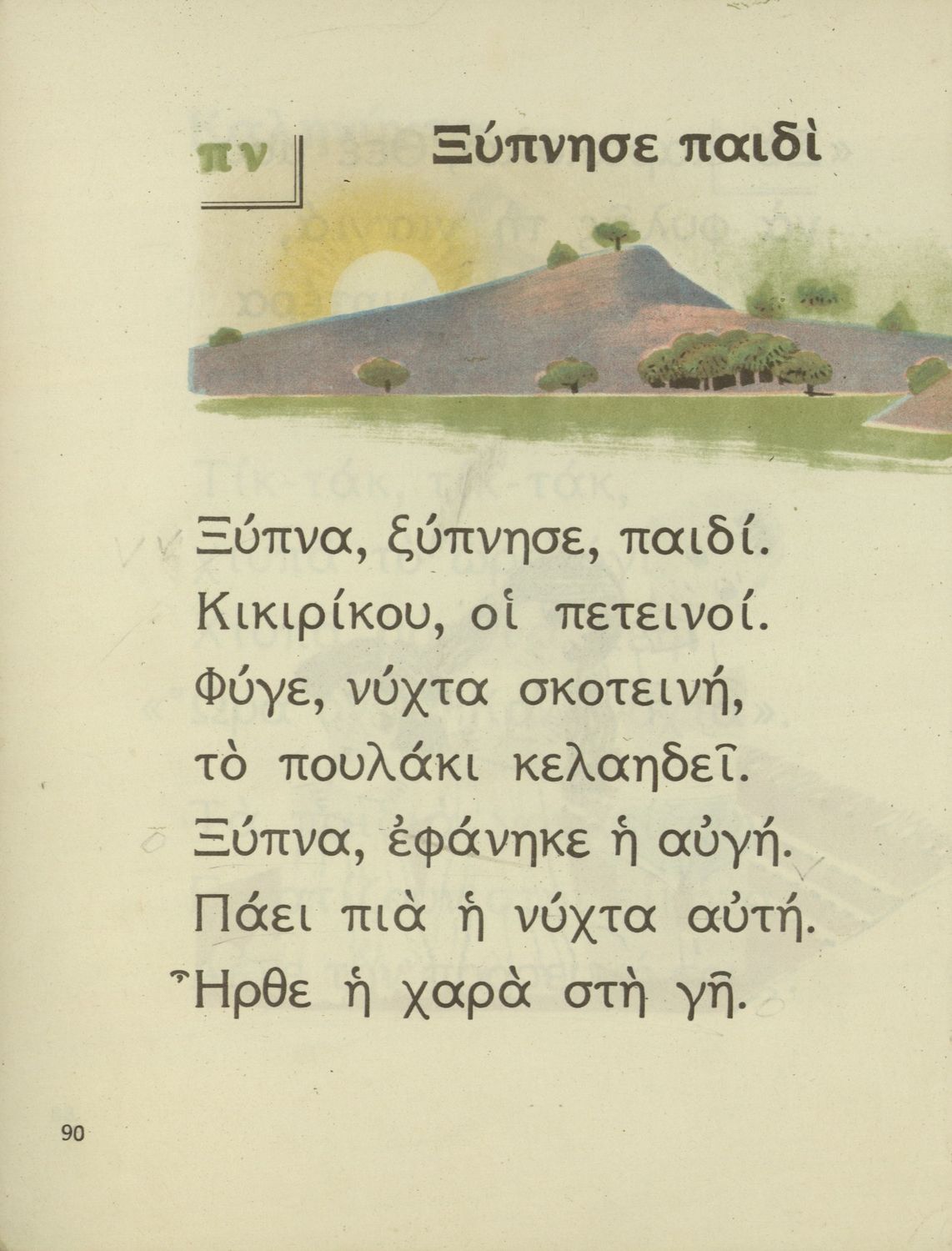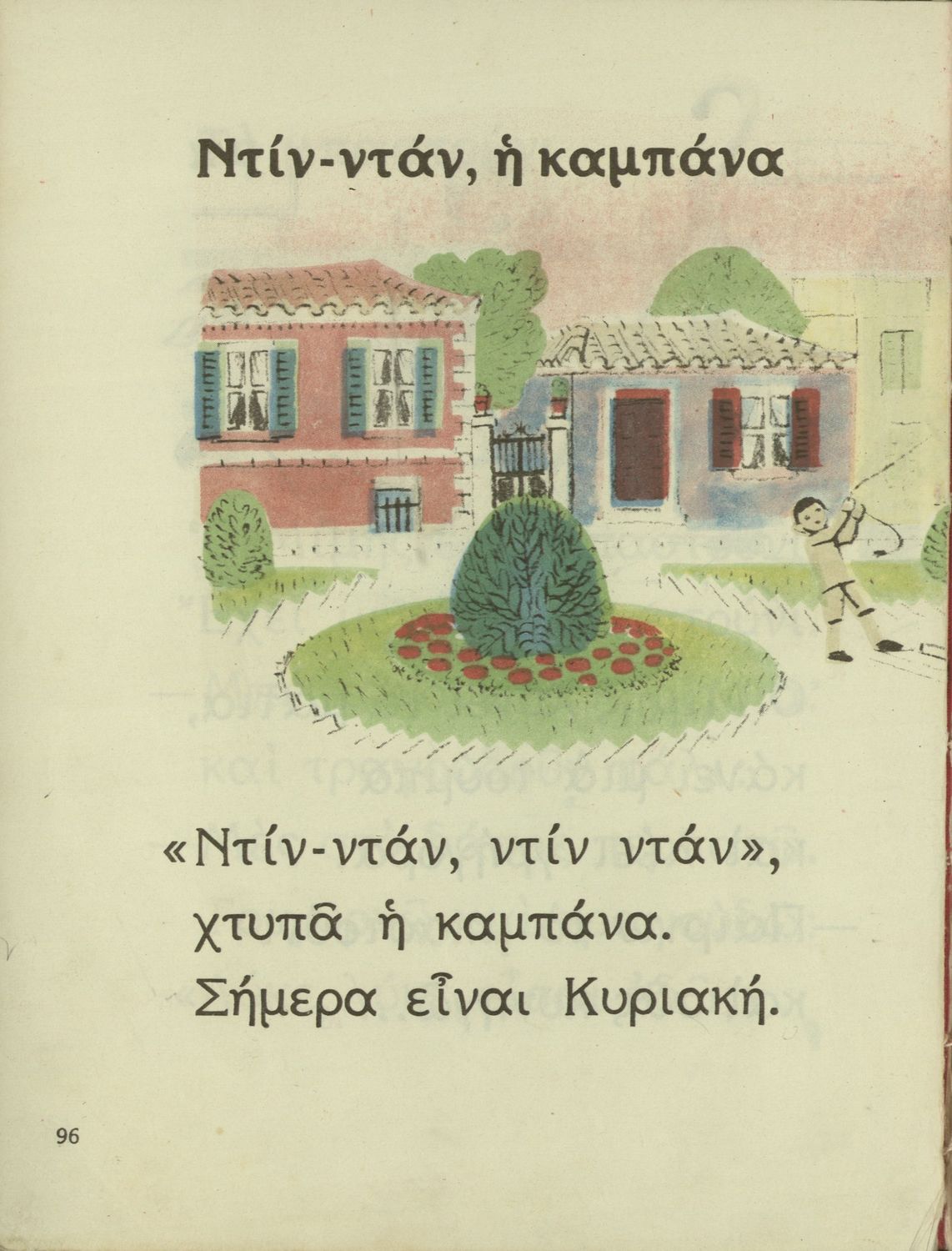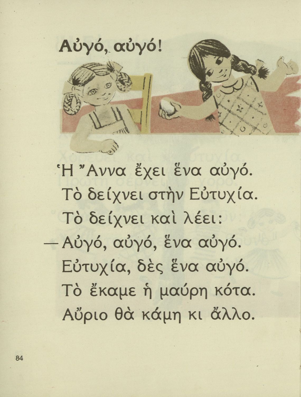 Αναγνωστικό Α΄ Δημοτικού που περιέχει γράμματα, συλλαβές, λέξεις, προτάσεις και κείμενα εμπνευσμένα από την οικογενειακή και κοινωνική ζωή του τόπου. Φέρει το σύμβολο της δικτατορίας.