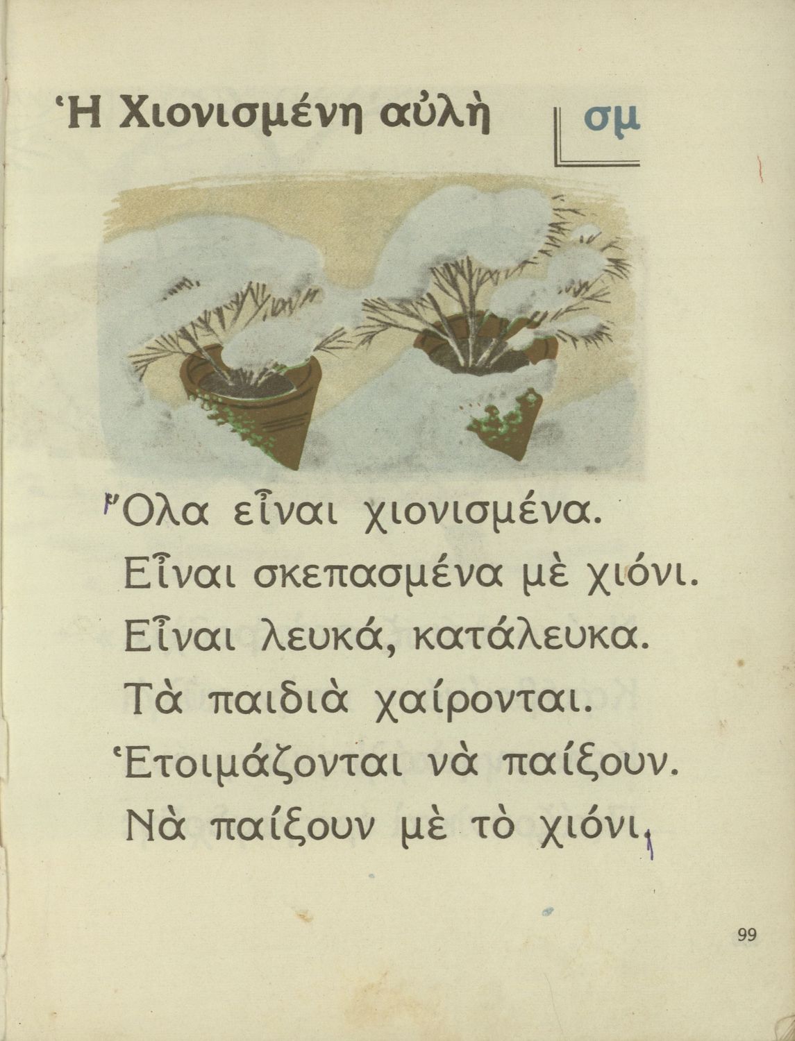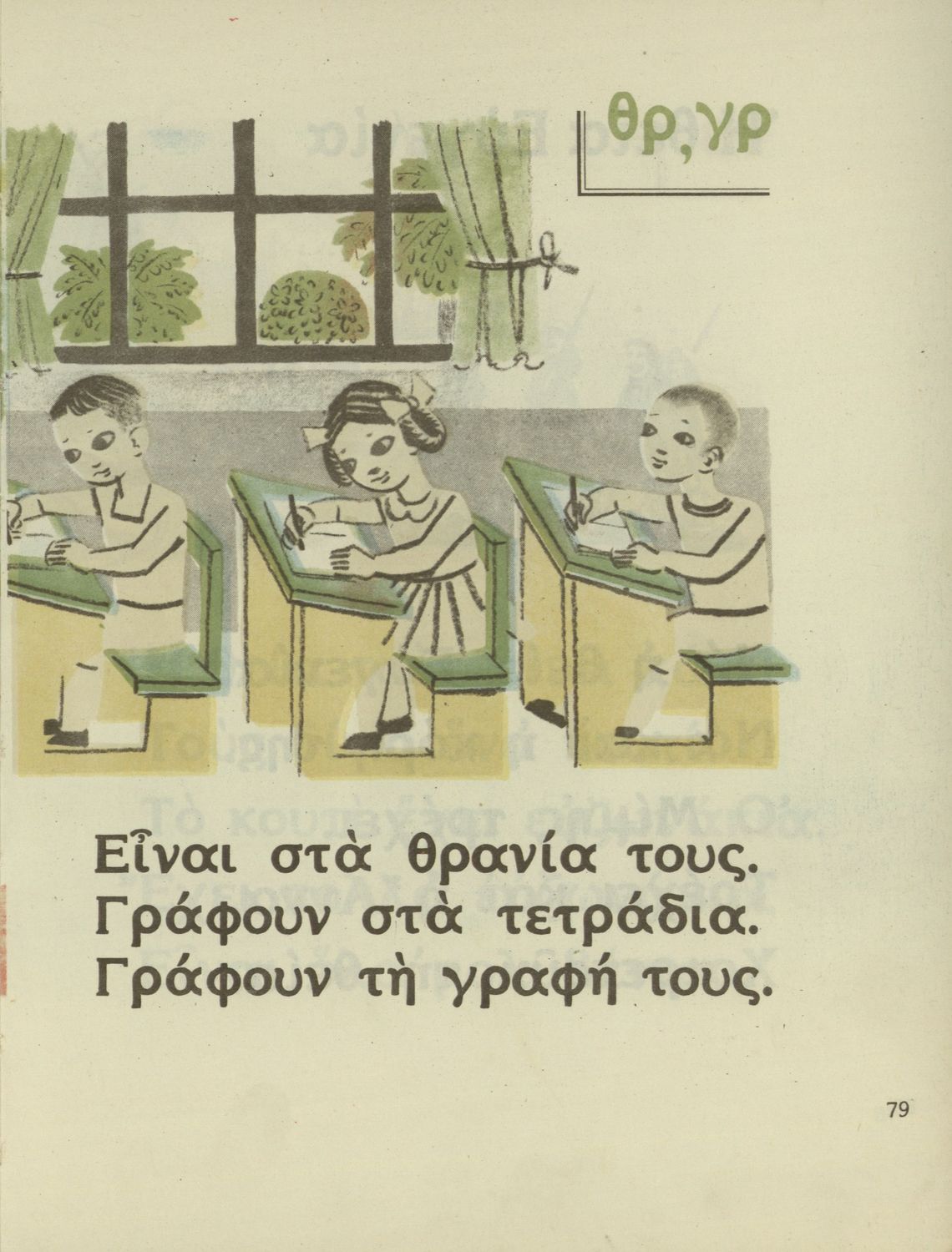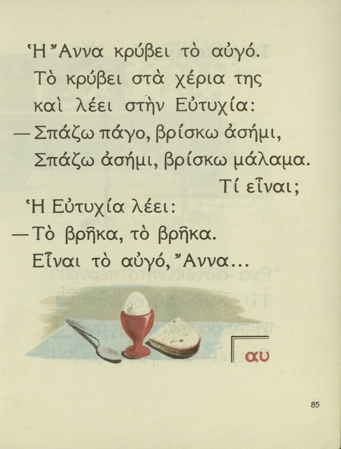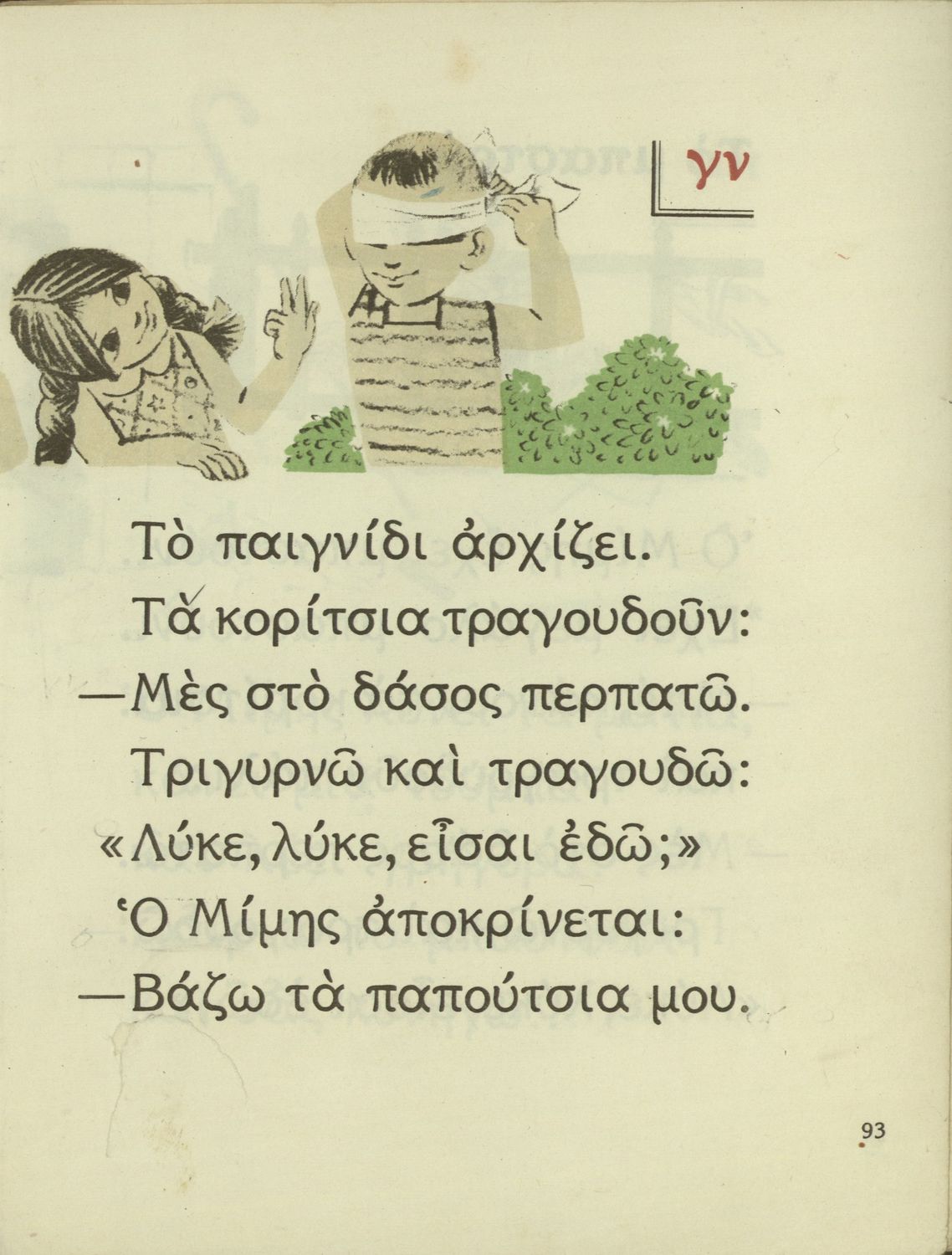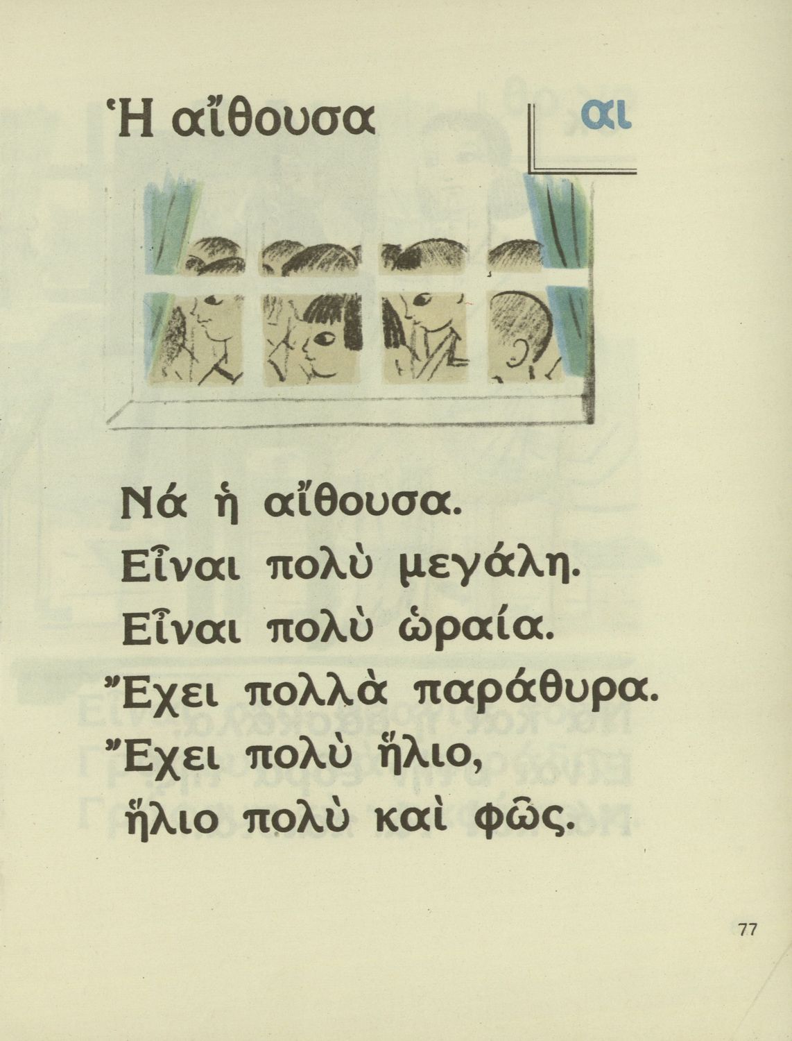 Αναγνωστικό Α΄ Δημοτικού που περιέχει γράμματα, συλλαβές, λέξεις, προτάσεις και κείμενα εμπνευσμένα από την οικογενειακή και κοινωνική ζωή του τόπου. Φέρει το σύμβολο της δικτατορίας.