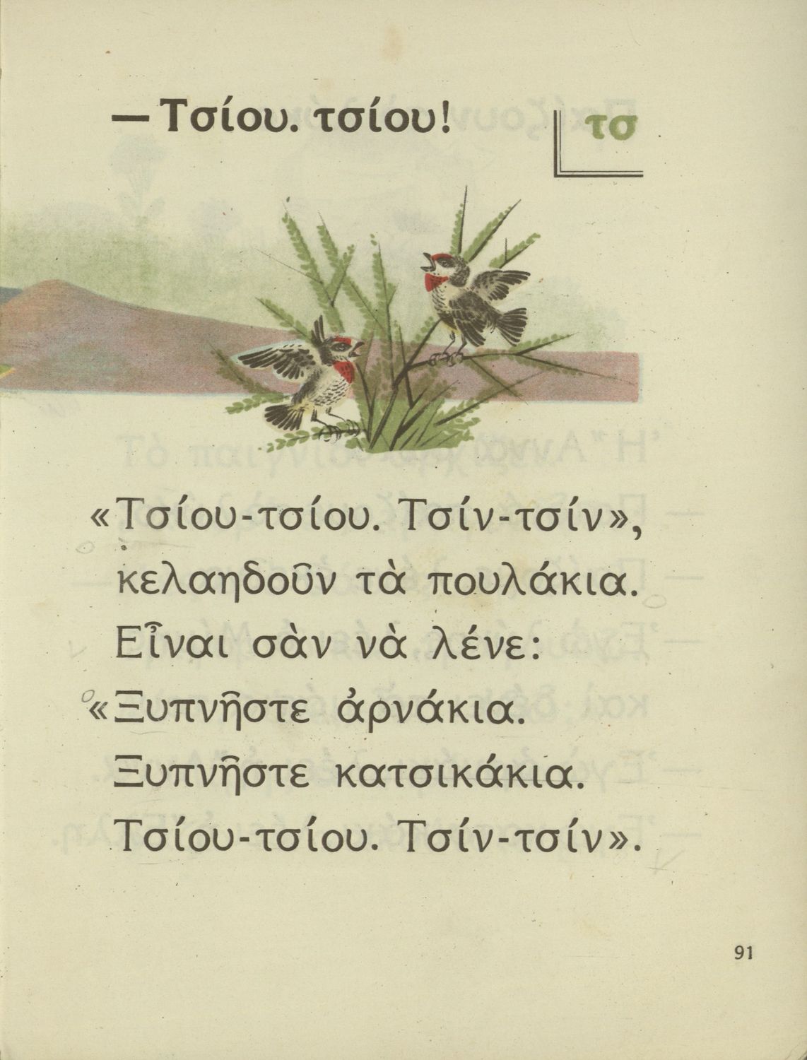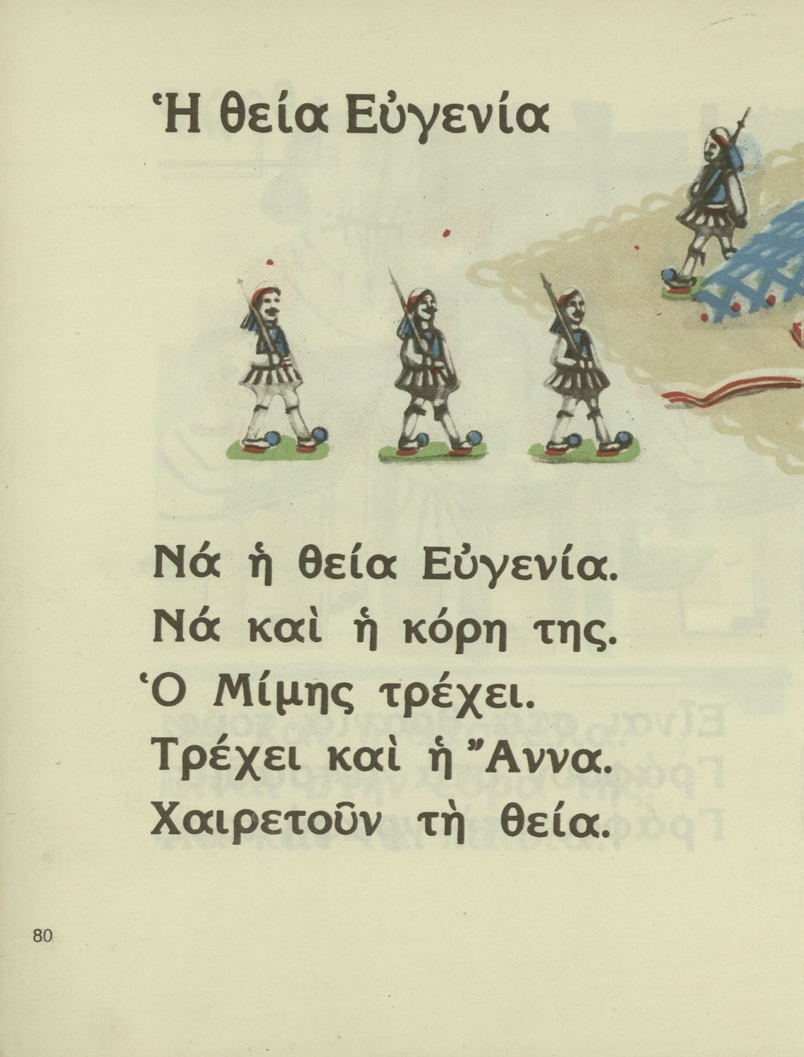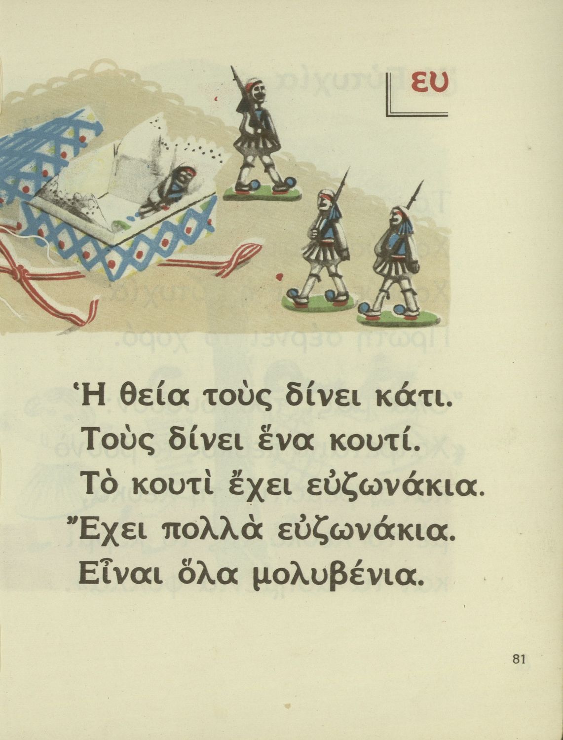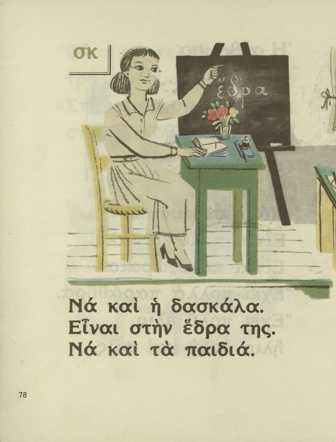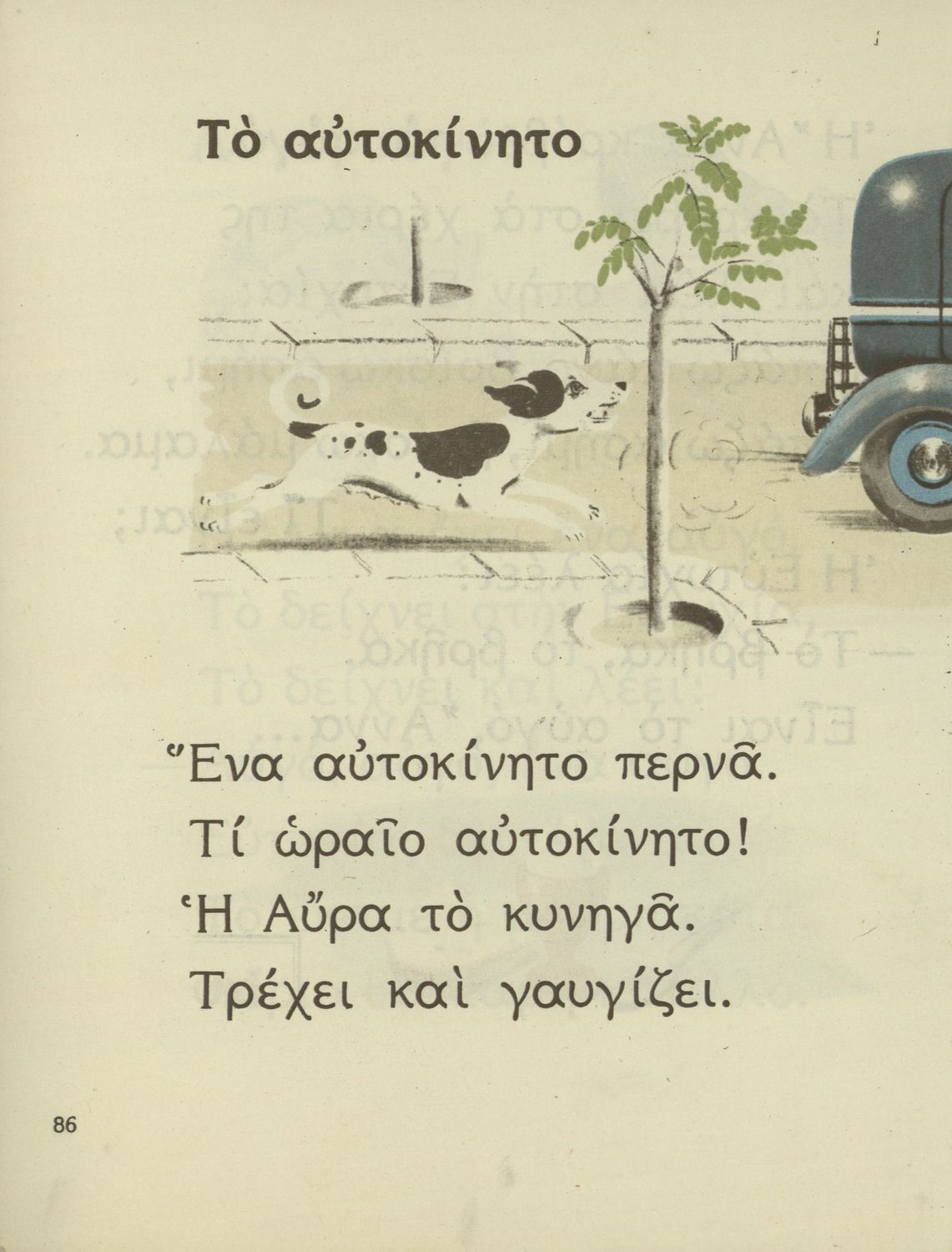 Αναγνωστικό Α΄ Δημοτικού που περιέχει γράμματα, συλλαβές, λέξεις, προτάσεις και κείμενα εμπνευσμένα από την οικογενειακή και κοινωνική ζωή του τόπου. Φέρει το σύμβολο της δικτατορίας.