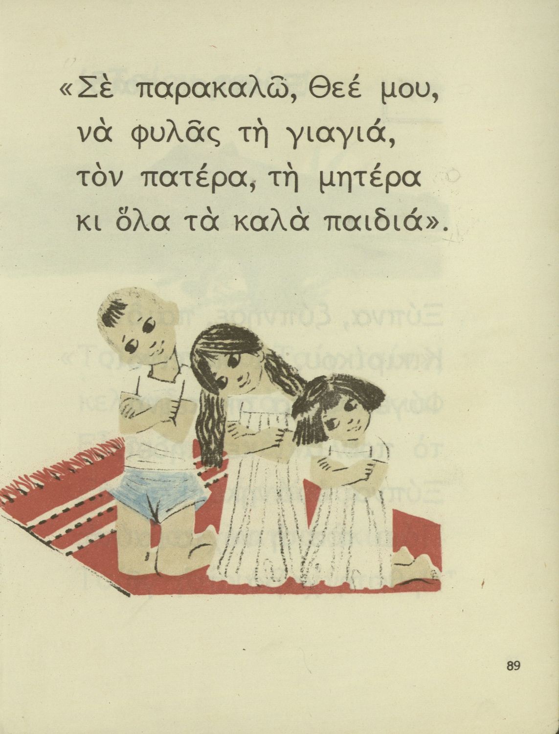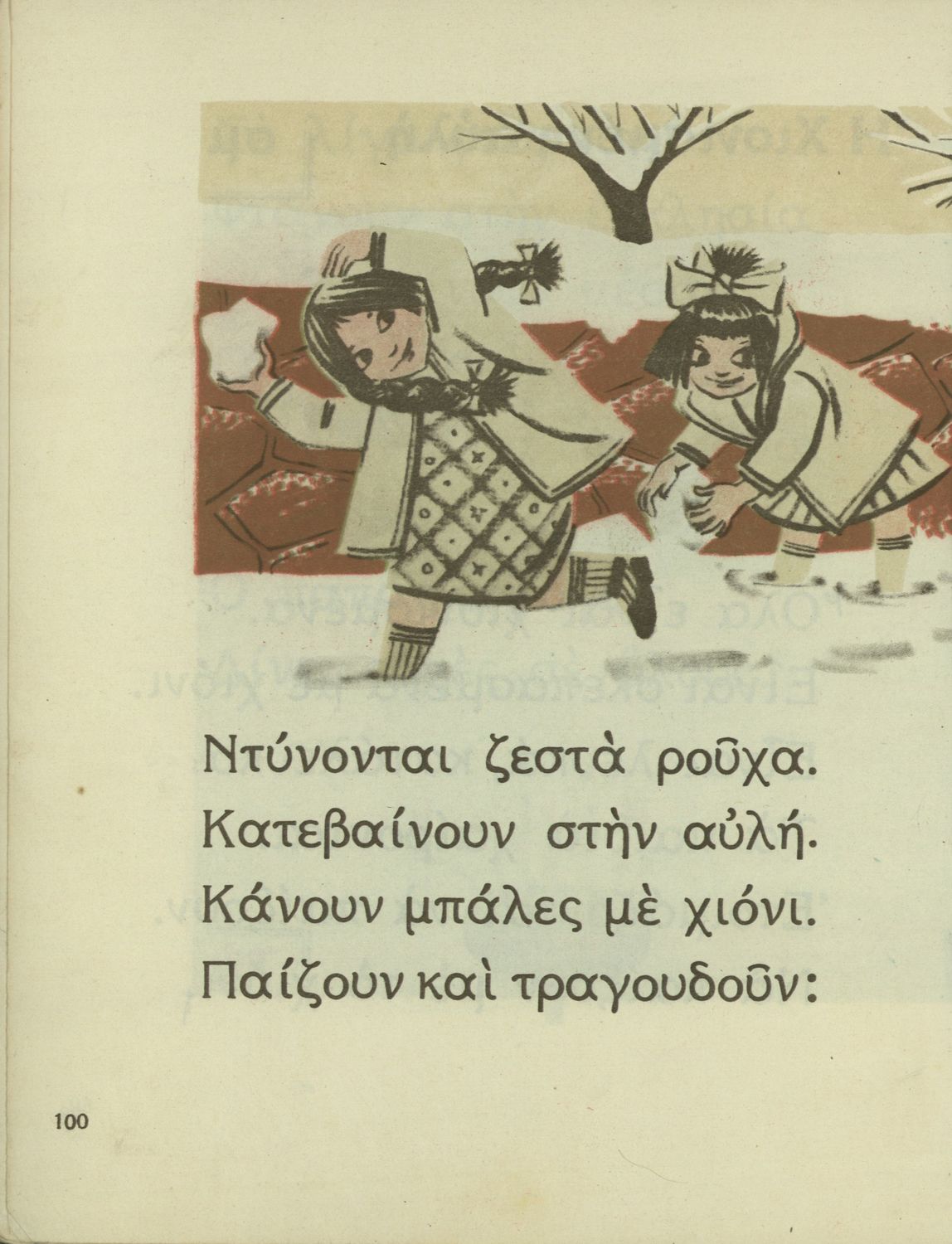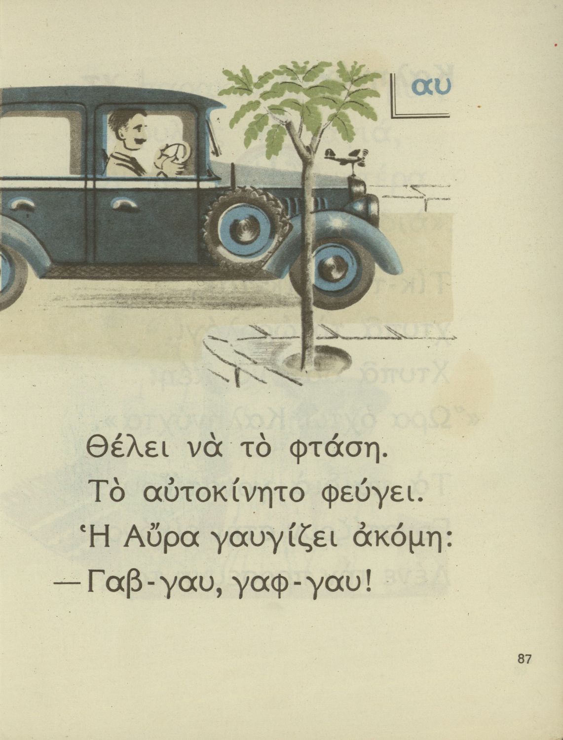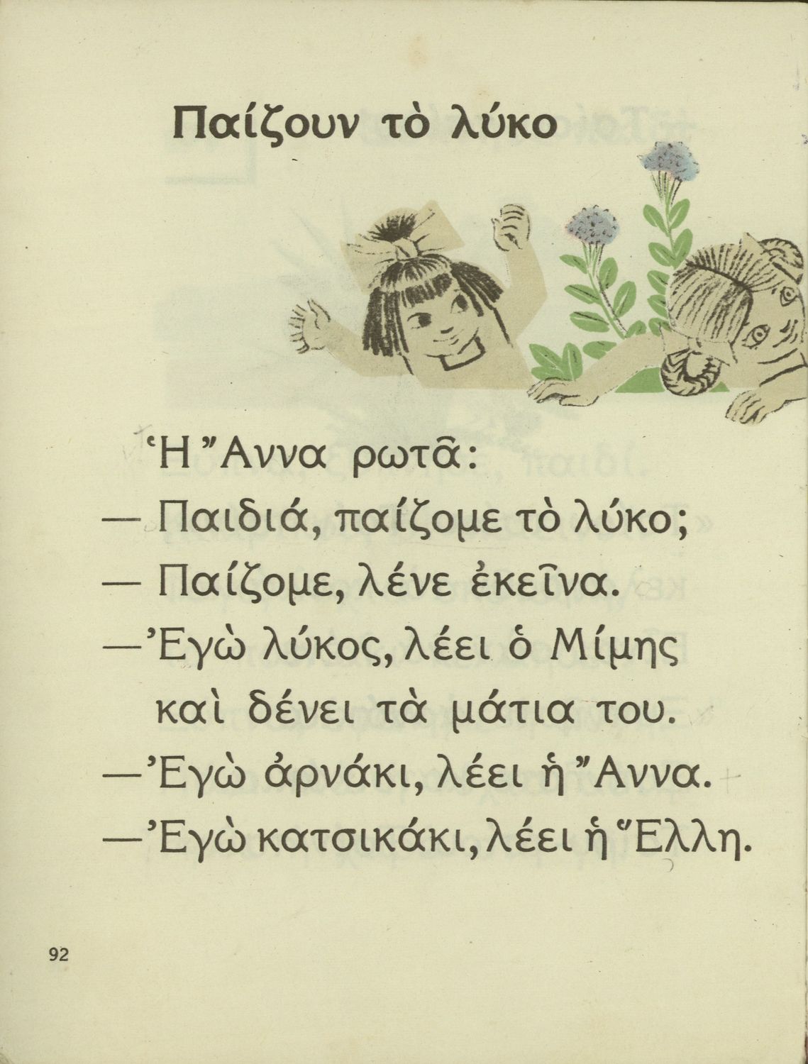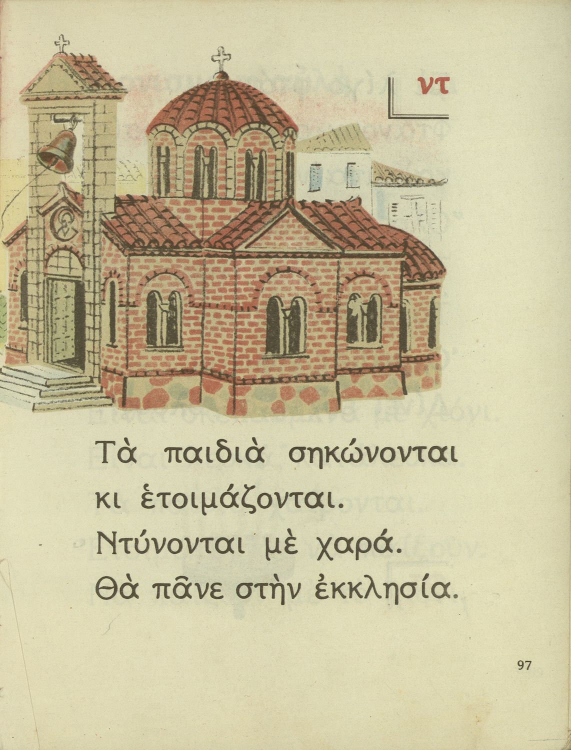 Αναγνωστικό Α΄ Δημοτικού που περιέχει γράμματα, συλλαβές, λέξεις, προτάσεις και κείμενα εμπνευσμένα από την οικογενειακή και κοινωνική ζωή του τόπου. Φέρει το σύμβολο της δικτατορίας.