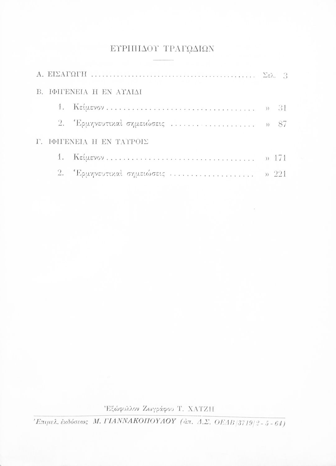 520 ## _aΣχολικό εγχειρίδιο Αρχαίων Ελληνικών Ε΄ Γυμνασίου που περιέχει εισαγωγή στο αρχαίο δράμα και στη ζωή και το έργο του Ευριπίδη, αποσπάσματα από την Ιφιγένεια η εν Αυλίδι και την Ιφιγένεια η εν Ταύροις και ερμηνευτικά σχόλια.