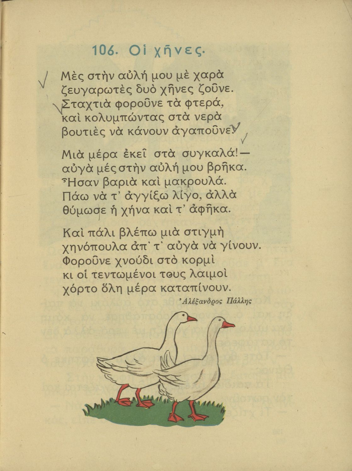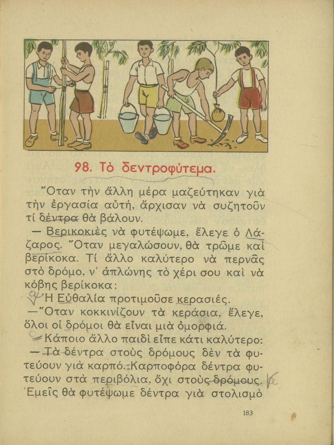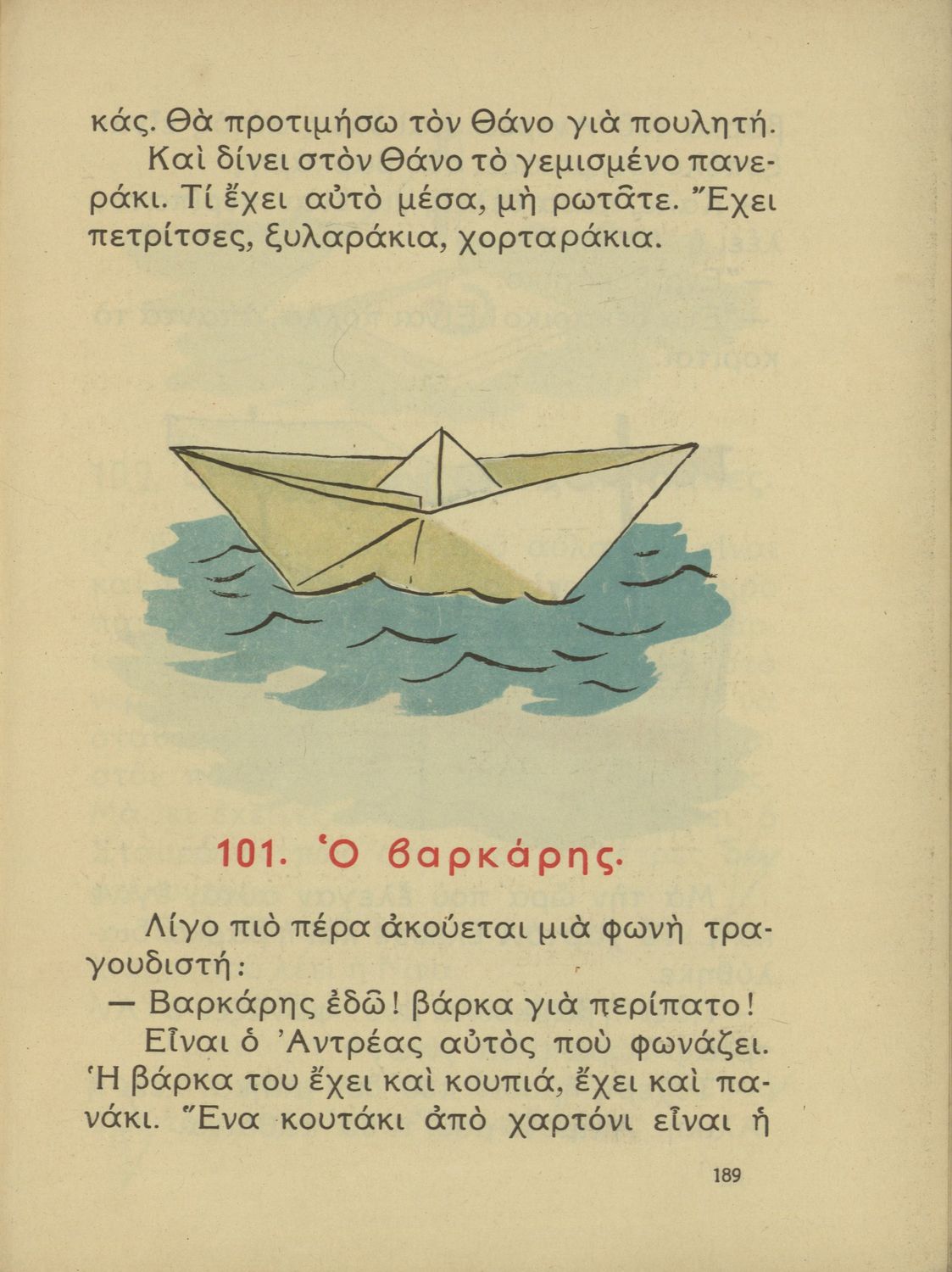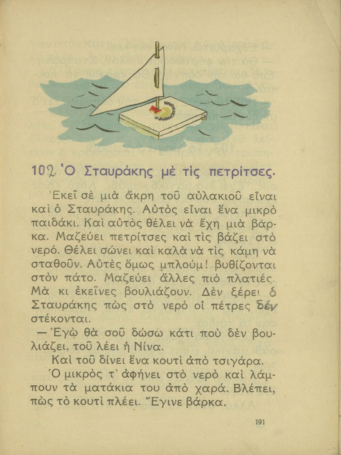 Αναγνωστικό Β' Δημοτικού που περιλαμβάνει μικρά διηγήματα και ποιήματα με περιεχόμενο από την οικογενειακή και κοινωνική ζωή, την ελληνική φύση, την ελληνική ιστορία και μυθολογία και την υγιεινή.
