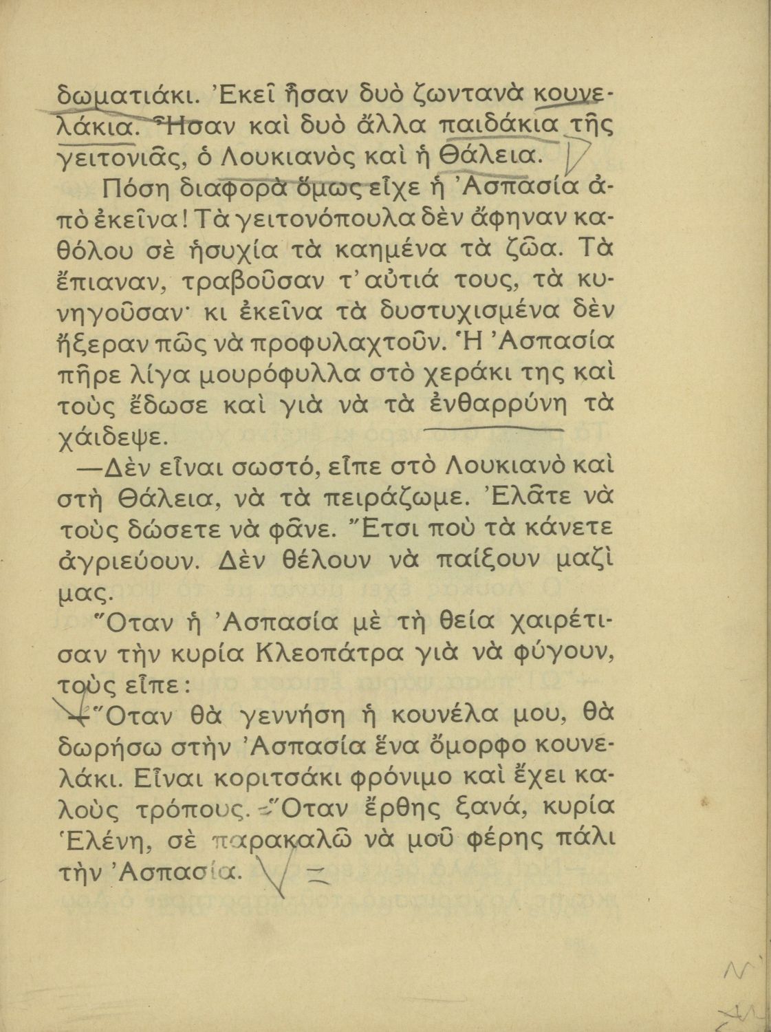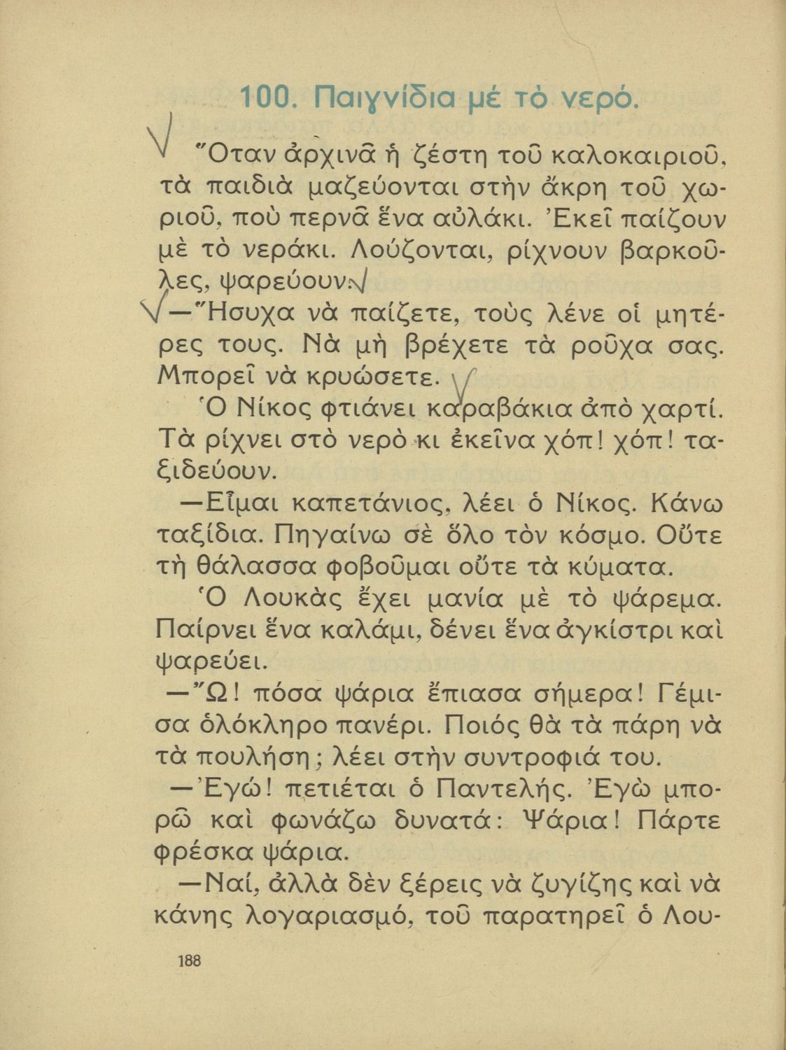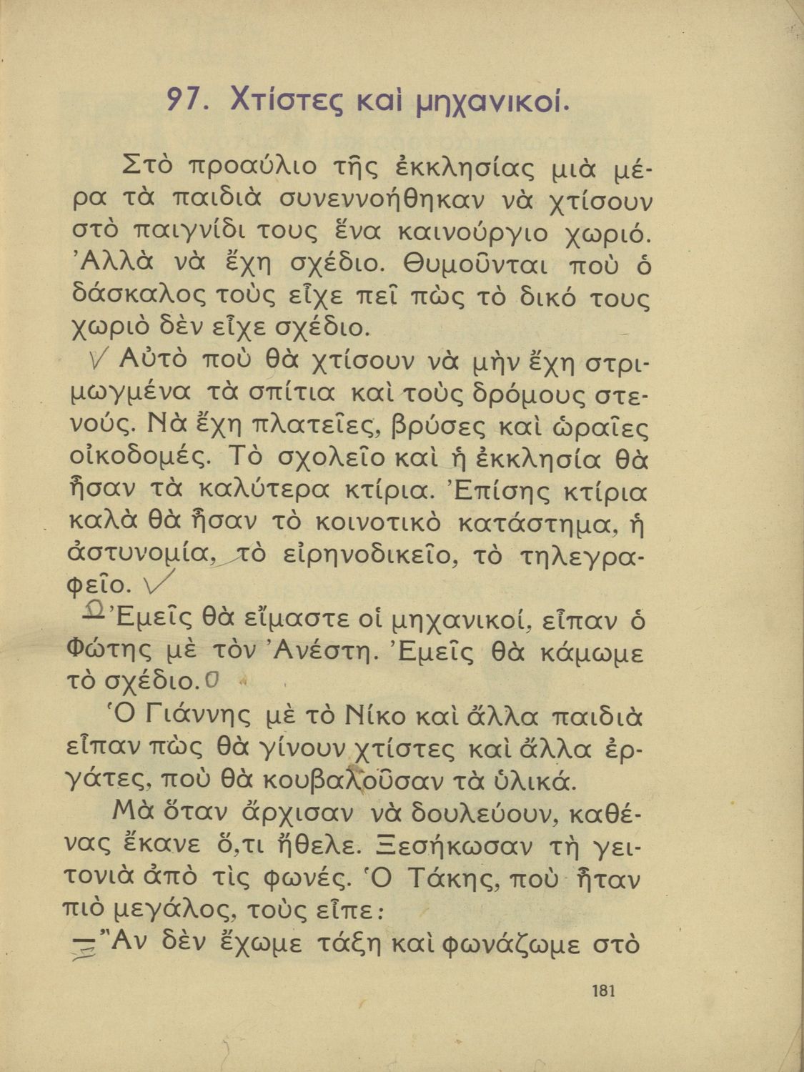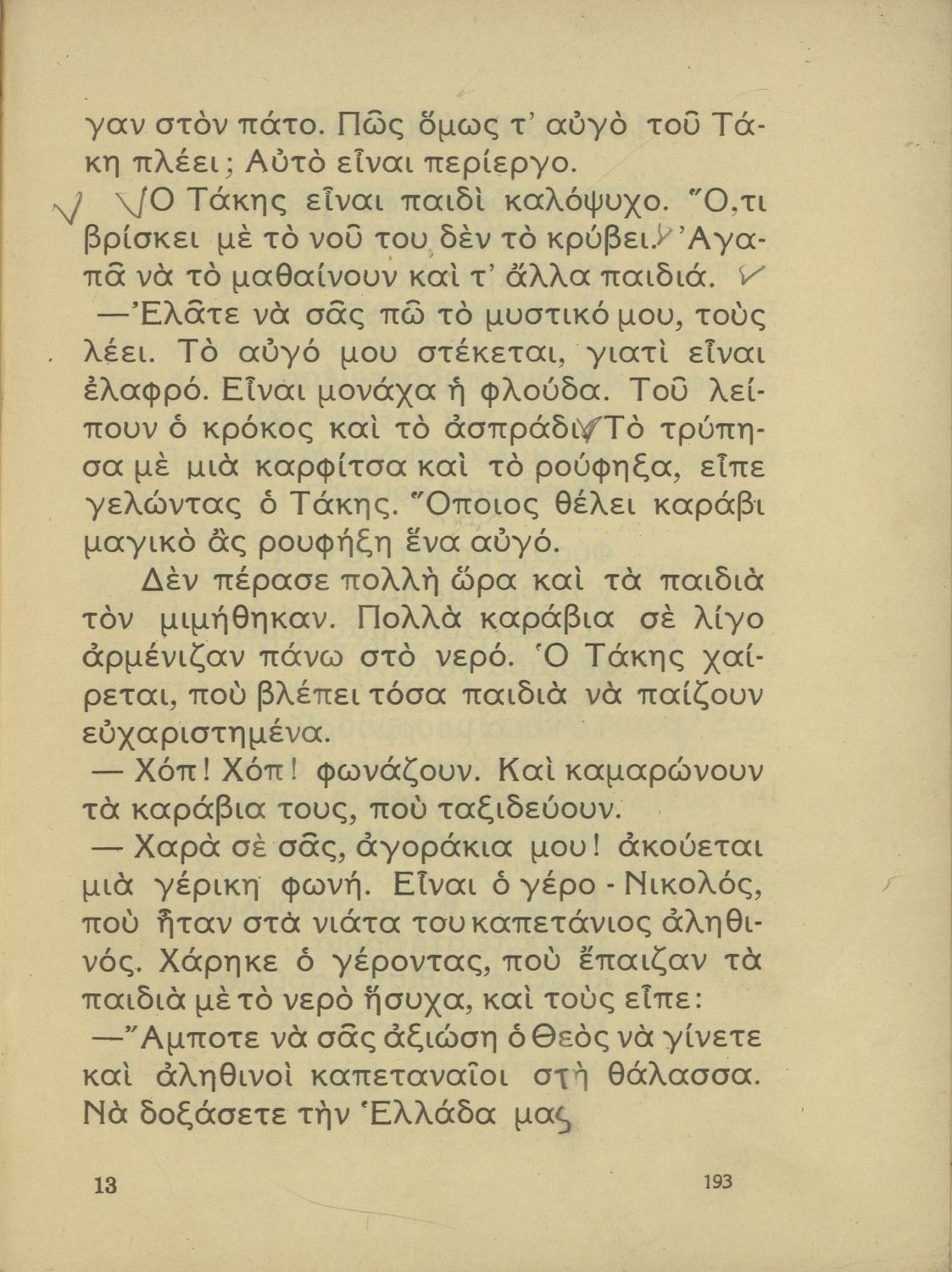 Αναγνωστικό Β' Δημοτικού που περιλαμβάνει μικρά διηγήματα και ποιήματα με περιεχόμενο από την οικογενειακή και κοινωνική ζωή, την ελληνική φύση, την ελληνική ιστορία και μυθολογία και την υγιεινή.