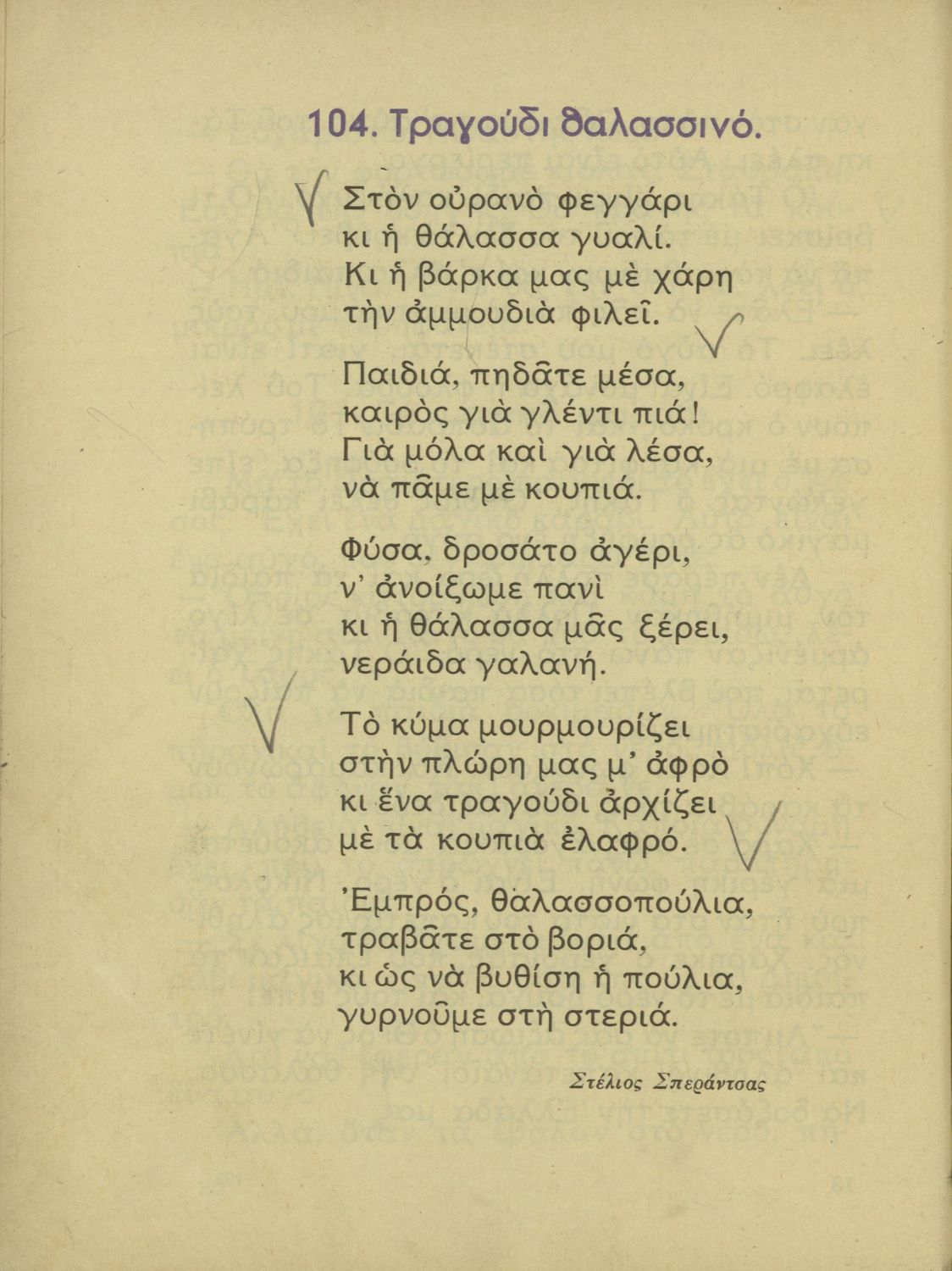 Αναγνωστικό Β' Δημοτικού που περιλαμβάνει ποιήματα και πεζά εμπνευσμένα από την καθημερινή ζωή, την ελληνική μυθολογία, την ελληνική φύση και τη θρησκευτική παράδοση.