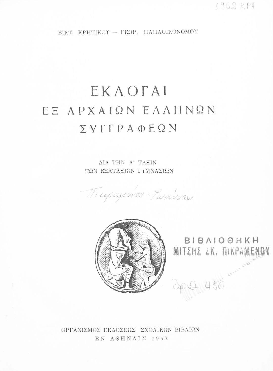 Τίτλος: Εκλογαί εξ αρχαίων Ελλήνων συγγραφέων, διά την Α΄ τάξιν των εξατάξιων Γυμνασίων