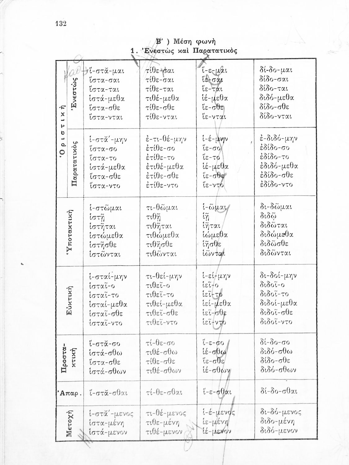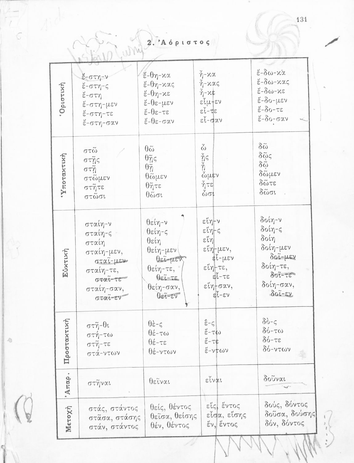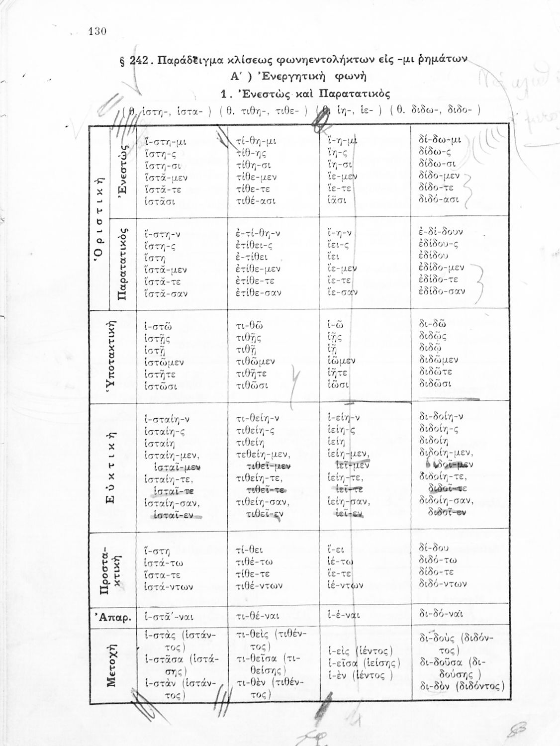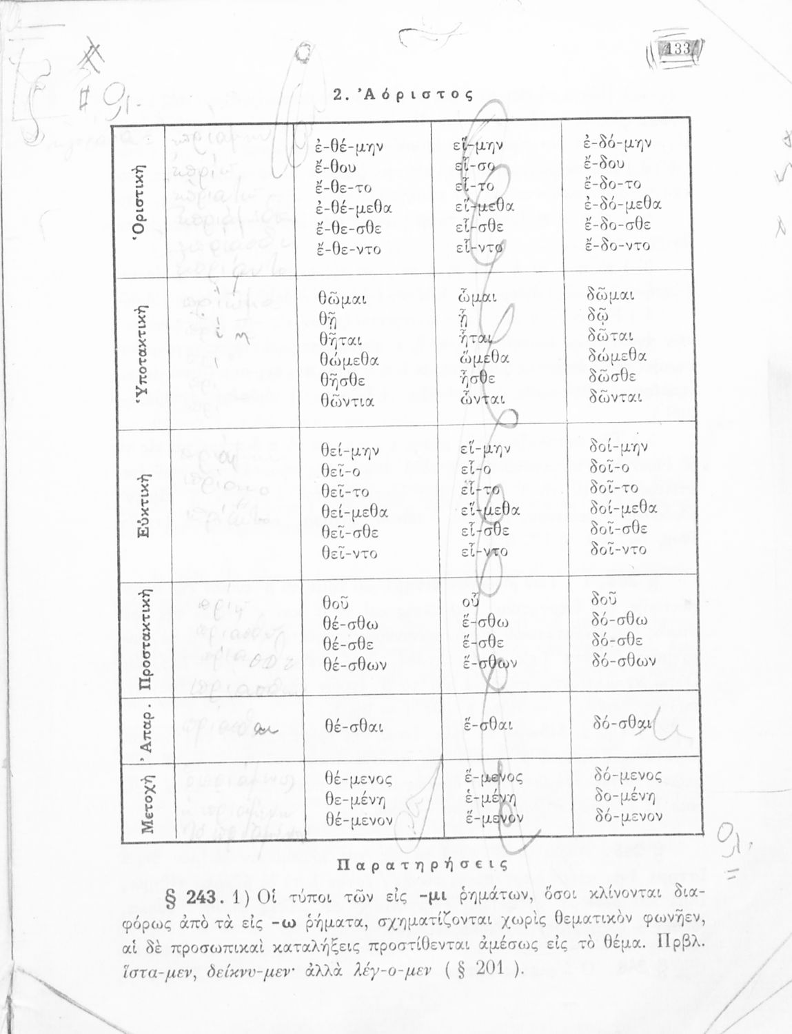 Σχολικό εγχειρίδιο Αρχαίων Ελληνικών Γυμνασίου που περιλαμβάνει τους κανόνες γραμματικής και είναι χωρισμένη στο φθογγολογικό, το τυπολογικό και ετυμολογικό μέρος.
