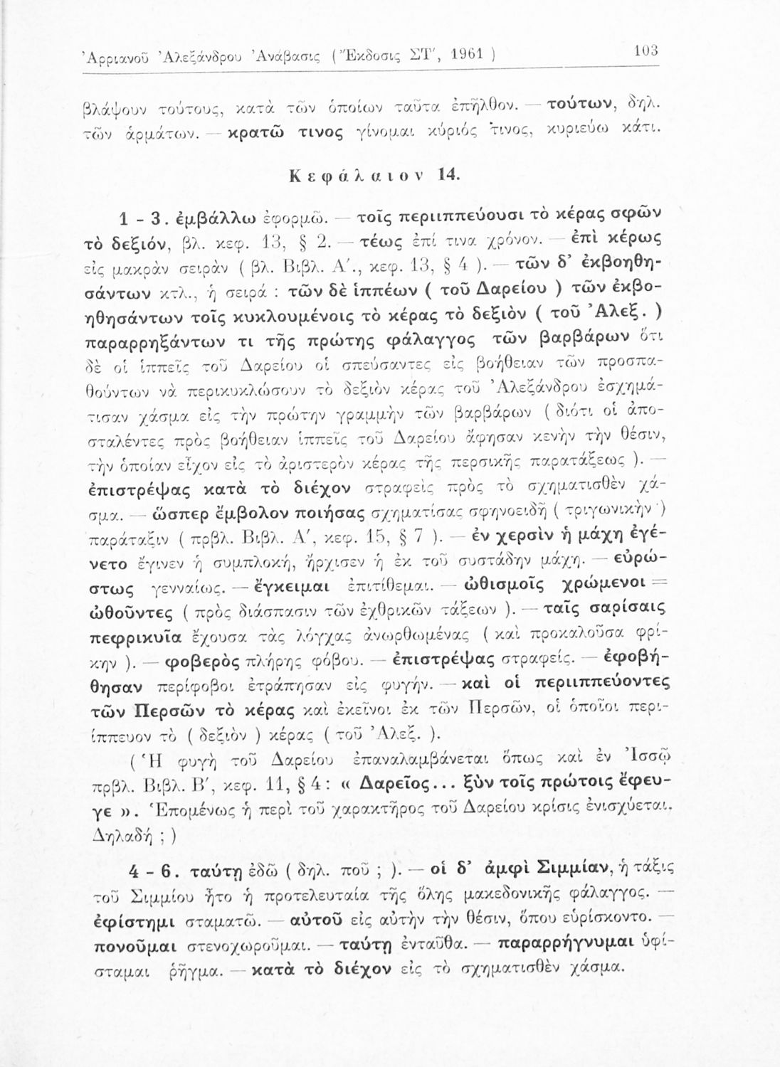 Σχολικό εγχειρίδιο Αρχαίων Ελληνικών που περιλαμβάνεται εισαγωγή στη ζωή και το έργο του Αρριανού, αποσπάσματα από το έργο του Αλεξάνδρου Ανάβασις, και ερμηνευτικές σημειώσεις. Περιέχει και εικόνες, διαγράμματα της θέσης του στρατού και χάρτη του κράτους του Μ. Αλεξάνδρου.
