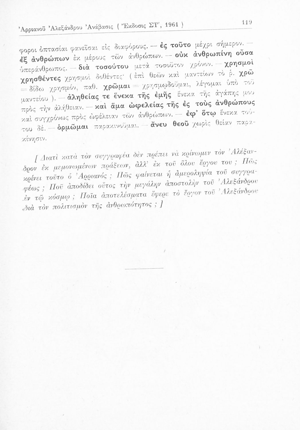 Σχολικό εγχειρίδιο Αρχαίων Ελληνικών Γ΄ Γυμνασίου που περιλαμβάνεται εισαγωγή σχετικά με την εποχή του Αρριανού, τη ζωή και το έργο του αποσπάσματα από το Αλεξάνδρου Ανάβασις, ερμηνευτικές σημειώσεις, εικόνες,