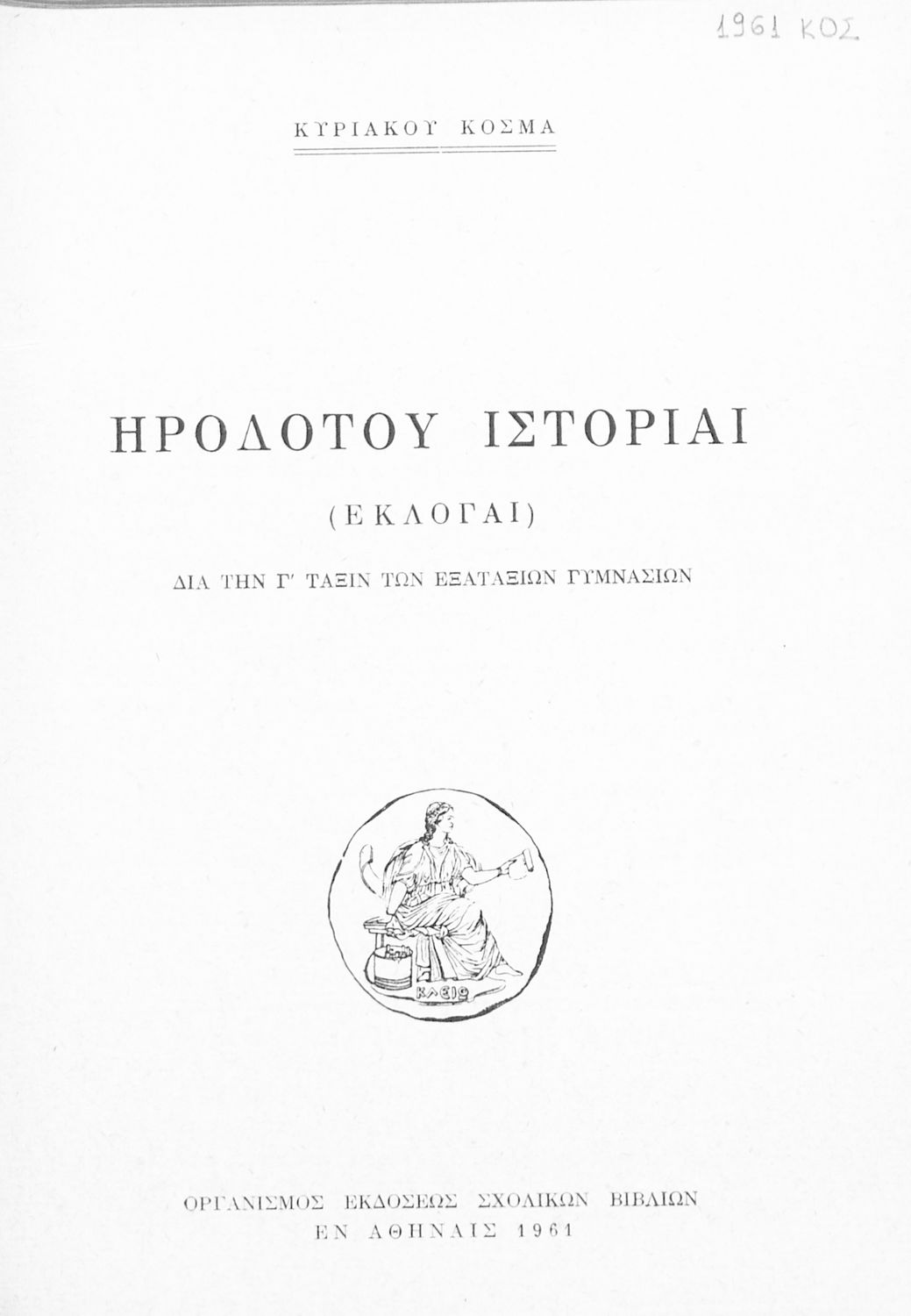 Κωδικός αναγνώρισης: 02-00754 Τίτλος: Ηροδότου Ιστορίαι, (Εκλογαί) διά την Γ΄ τάξιν των εξατάξιων Γυμνασίων Συγγραφέας: Ηρόδοτος, Κυριάκος Κοσμάς (σχόλια) Μέγεθος και υπόστρωμα: Σχολικό εγχειρίδιο, μαλακό εξώφυλλο, 143 σελίδες. Χάρτες (έγχρωμοι), χάρτες (ασπρόμαυροι). |