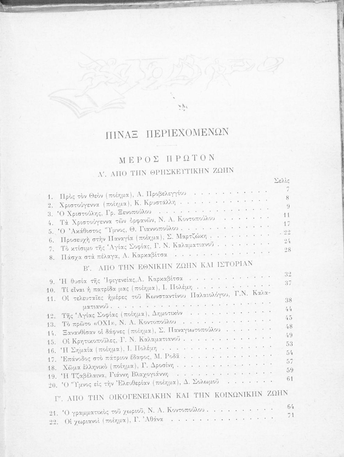 Αναγνωστικό Ε΄ Δημοτικού που περιέχει πεζά και ποιήματα εμπνευσμένα από τη θρησκευτική, εθνική, κοινωνική ζωή καθώς και από τις ασχολίες των Ελλήνων, την αρχαία και σύγχρονη ελληνική ιστορία και τον πολιτισμό.