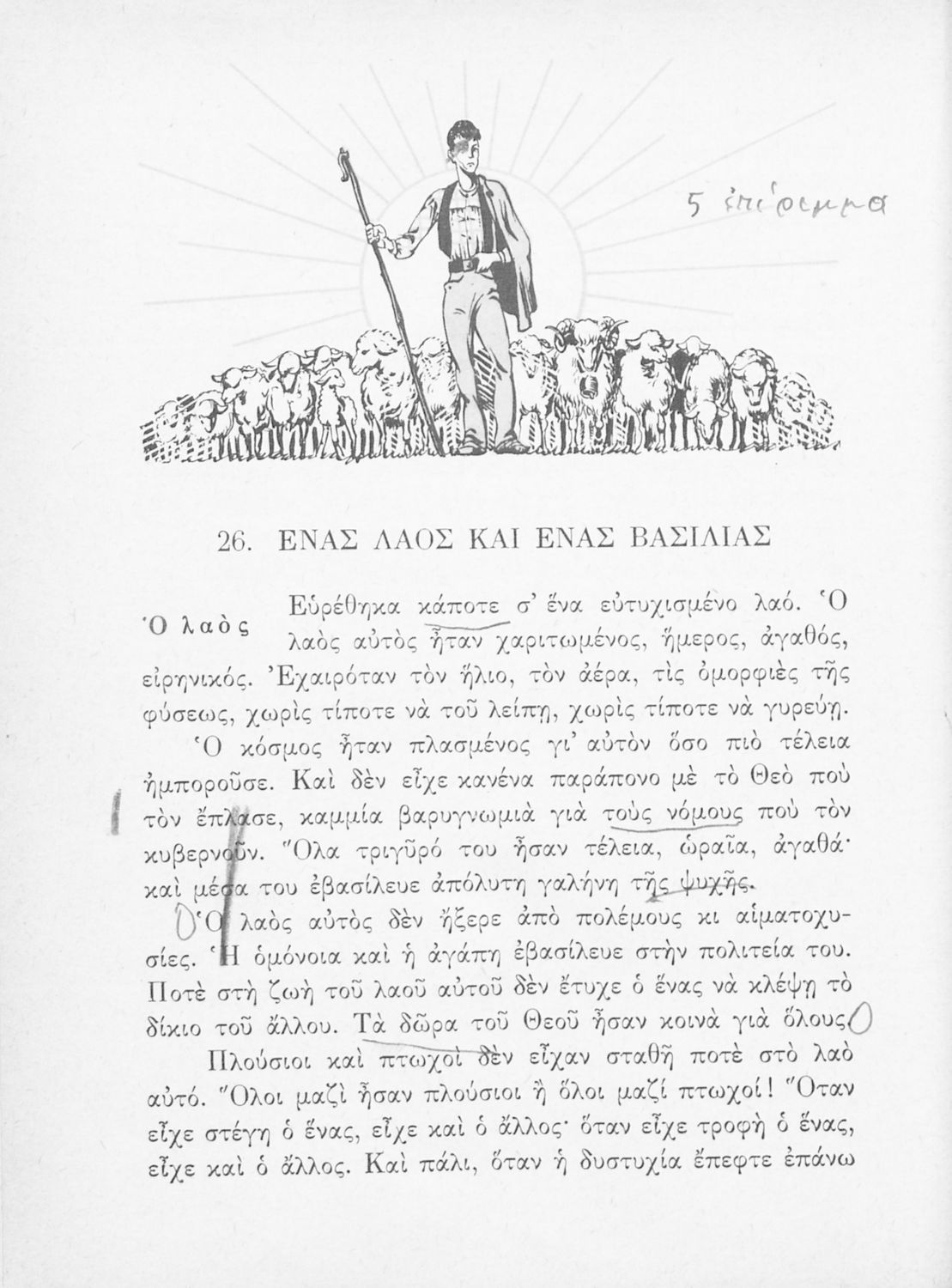 Αναγνωστικό Ε΄ Δημοτικού που περιέχει κείμενα εμπνευσμένα από την εθνική, κοινωνική και οικογενειακή ζωή και την ελληνική φύση, μυθολογία και ιστορία. Φέρει το σύμβολο της δικτατορίας.