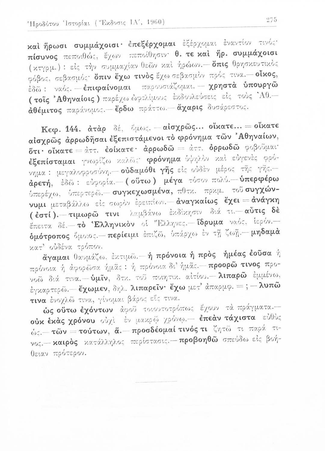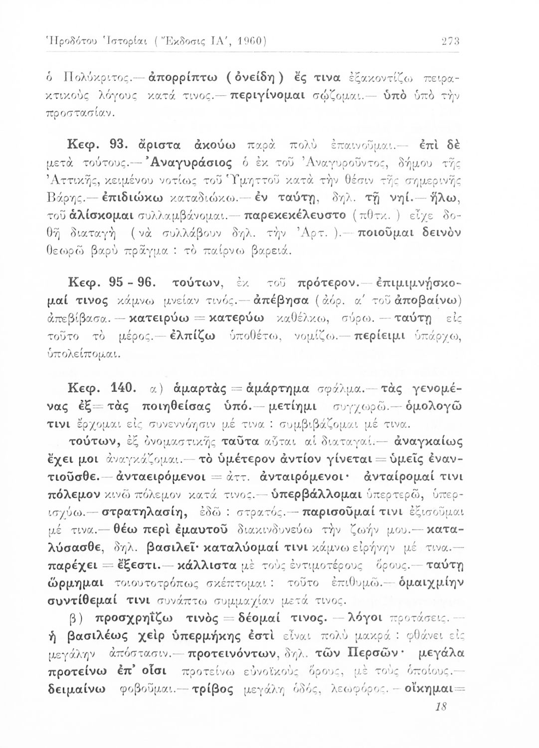Σχολικό εγχειρίδιο Αρχαίων Ελληνικών Γ΄ Γυμνασίου που περιλαμβάνει εισαγωγή στη ζωή και το έργο του Ηρόδοτου, αποσπάσματα από την Ιστορία του, ερμηνευτικές σημειώσεις και τοπογραφικούς πίνακες με εικόνες και χάρτες. Φέρει το σύμβολο της δικτατορίας.